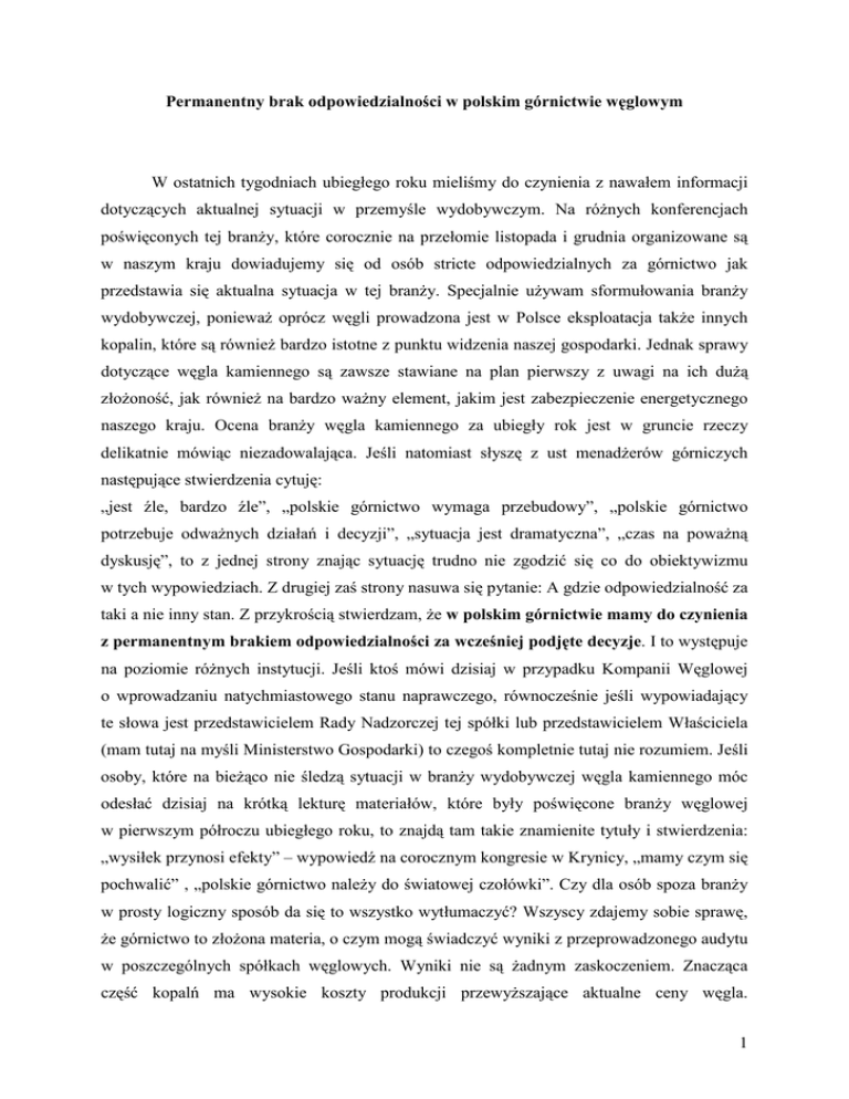 Permanentny brak odpowiedzialności w polskim górnictwie węglowym W ostatnich tygodniach ubiegłego roku mieliśmy do czynienia z nawałem informacji dotyczących aktualnej sytuacji w przemyśle wydobywczym. Na różnych konferencjach poświęconych tej branży, które corocznie na przełomie listopada i grudnia organizowane są w naszym kraju dowiadujemy się od osób stricte odpowiedzialnych za górnictwo jak przedstawia się aktualna sytuacja w tej branży. Specjalnie używam sformułowania branży wydobywczej, ponieważ oprócz węgli prowadzona jest w Polsce eksploatacja także innych kopalin, które są również bardzo istotne z punktu widzenia naszej gospodarki. Jednak sprawy dotyczące węgla kamiennego są zawsze stawiane na plan pierwszy z uwagi na ich dużą złożoność, jak również na bardzo ważny element, jakim jest zabezpieczenie energetycznego naszego kraju. Ocena branży węgla kamiennego za ubiegły rok jest w gruncie rzeczy delikatnie mówiąc niezadowalająca. Jeśli natomiast słyszę z ust menadżerów górniczych następujące stwierdzenia cytuję: „jest źle, bardzo źle”, „polskie górnictwo wymaga przebudowy”, „polskie górnictwo potrzebuje odważnych działań i decyzji”, „sytuacja jest dramatyczna”, „czas na poważną dyskusję”, to z jednej strony znając sytuację trudno nie zgodzić się co do obiektywizmu w tych wypowiedziach. Z drugiej zaś strony nasuwa się pytanie: A gdzie odpowiedzialność za taki a nie inny stan. Z przykrością stwierdzam, że w polskim górnictwie mamy do czynienia z permanentnym brakiem odpowiedzialności za wcześniej podjęte decyzje. I to występuje na poziomie różnych instytucji. Jeśli ktoś mówi dzisiaj w przypadku Kompanii Węglowej o wprowadzaniu natychmiastowego stanu naprawczego, równocześnie jeśli wypowiadający te słowa jest przedstawicielem Rady Nadzorczej tej spółki lub przedstawicielem Właściciela (mam tutaj na myśli Ministerstwo Gospodarki) to czegoś kompletnie tutaj nie rozumiem. Jeśli osoby, które na bieżąco nie śledzą sytuacji w branży wydobywczej węgla kamiennego móc odesłać dzisiaj na krótką lekturę materiałów, które były poświęcone branży węglowej w pierwszym półroczu ubiegłego roku, to znajdą tam takie znamienite tytuły i stwierdzenia: „wysiłek przynosi efekty” – wypowiedź na corocznym kongresie w Krynicy, „mamy czym się pochwalić” , „polskie górnictwo należy do światowej czołówki”. Czy dla osób spoza branży w prosty logiczny sposób da się to wszystko wytłumaczyć? Wszyscy zdajemy sobie sprawę, że górnictwo to złożona materia, o czym mogą świadczyć wyniki z przeprowadzonego audytu w poszczególnych spółkach węglowych. Wyniki nie są żadnym zaskoczeniem. Znacząca część kopalń ma wysokie koszty produkcji przewyższające aktualne ceny węgla. 1 Przy wysokich cenach węgli na rynkach światowych, tak jak miało to miejsce w latach 2010 czy 2011 kompletnie na ten element nie zwracano uwagi. Zawsze wychodzono na plus. O nadprodukcji węgla energetycznego nie wspomnę, ponieważ pisałem już o tym w 2009 roku. Górnictwo węglowe w Polsce musi w krótkim okresie czasu wejść na ścieżkę proefektywnościowych działań, bowiem w innym wypadku przy zasadach gospodarki wolnorynkowej będziemy zepchnięci na własnej ziemi na drugorzędną pozycję. Polska gospodarka w kontekście mocy wytwórczej energii elektrycznej jeszcze w długim horyzoncie czasowym nie odejdzie, ponieważ nie jest w stanie odejść od węgla. Przemawia za tym również najniższy wskaźnik uzależnienia energetycznego, jaki dzisiaj ma Polska w Unii Europejskiej i to za sprawą węgla. Czy w przyszłości utrzymanie tej dużej niezależności będzie się odbywało za sprawą węgli z polskich kopalń? Staram się być optymistą, jednak brakuje mi tutaj pewnych elementów spinających. Gdy zastanowimy się jak to dzisiaj funkcjonuje to odnoszę wrażenie, że tej „odpowiedzialności”, od której zacząłem niniejszy komentarz, brakuje na różnych szczeblach zarządzania. Podam kilka przykładów, które ogólnie wpisują się w ustalenia z raportu audytorów. W spółkach węglowych w ubiegłym roku, a szczególnie w jego drugim półroczu, dokonano cięcia kosztów gdzie się dało. Również redukcja dotknęła parku maszynowego, o czym mówią raporty z poczynionych zakupów inwestycyjnych w tym kierunku. Przypomnę, że środki przeznaczone na inwestycje górnicze (udostępnienie nowych rejonów) czy inwestycje maszynowe pracują w horyzoncie kilkuletnim. Jeżeli poprzez dziś rozpoczęte inwestycje górnicze otwieramy sobie przy właściwym rozpoznaniu złoża pewne możliwości wydobywcze za okres około dwóch – trzech lat, to jest to właściwe podejście. Jeżeli z drugiej strony przyblokujemy inwestycje w kierunku odnawiania parku maszynowego, to również w okresie kilku lat odwzajemni nam się zwiększoną ilością postojów i remontów co niewątpliwie będzie rzutowało na obniżenie wydajności pracy, nie mówiąc już o utrzymaniu odpowiedniego poziomu bezpieczeństwa. Jednym z podstawowych zagadnień w audycie było niskie wykorzystanie na zmianę roboczą maszyn i urządzeń. Podaje się, że maszyny pracują maksymalnie 3,5 godziny na danej zmianie. Równocześnie akurat w tym temacie bardzo szybko przechodzi się do propozycji sześciodniowego tygodnia pracy, za którym tak wiele menadżerów się opowiada. Uważam, że dzisiaj nie ma różnicy zdań co do pójścia w kierunku sześciodniowego tygodnia pracy, należy to jednak przygotować w sposób wyważony. Przestrzegam w tym miejscu wszystkich przed łączeniem jednego zagadnienia z drugim. Obecnie w polskim górnictwie wykazywany niski czas pracy maszyn, nie daje podstaw do natychmiastowego wydłużenia tygodniowego czasu pracy. W pierwszej kolejności należy sobie zadać pytanie, dlaczego w mojej kopalni 2 czy spółce maszyny są tak mało efek