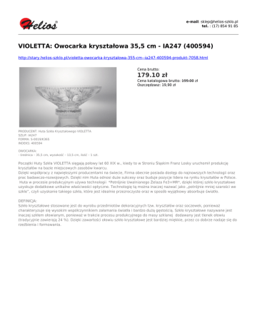e-mail: [email protected] tel. : (17) 854 91 85 VIOLETTA: Owocarka kryształowa 35,5 cm - IA247 (400594) http://stary.helios-szklo.pl/violetta-owocarka-krysztalowa-355-cm--ia247-400594-produkt-7058.html Cena brutto: 179.10 zł Cena katalogowa brutto: 199.00 zł Oszczędzasz: 19,90 zł PRODUCENT: Huta Szkła Kryształowego VIOLETTA SZLIF: IA247 FORMA: S-0019/K365 INDEKS: 400594 OWOCARKA: - średnica – 35,5 cm, wysokość – 13,5 cm, ilość – 1 szt. Początki Huty Szkła VIOLETTA sięgają połowy lat 60 XIX w., kiedy to w Stroniu Śląskim Franz Losky uruchomił produkcję kryształów na bazie miejscowych zasobów kwarcu. Dzięki współpracy z największymi producentami na świecie, Firma obecnie posiada dostęp do najnowszych technologii oraz prac badawczo-rozwojowych. Dzięki nim Huta odnosi duże sukcesy oraz buduje pozycje lidera na rynku kryształów w Polsce. Huta w procesie produkcyjnym używa technologii *Potrójnie Uwalnianego Żelaza Fe3+MR*, dzięki której szkło kryształowe uzyskuje dodatkowe unikalne właściwości optyczne. Technologię tą można inaczej nazwać jako „potrójnie mniej szarości we szkle”, czyli uzyskanie takiego szkła, które jest idealnie przezroczyste oraz w sposób wyjątkowy absorbuje światło. DEFINICJA: Szkło kryształowe stosowane jest do wyrobu przedmiotów dekoracyjnych tzw. kryształów oraz soczewek, ponieważ charakteryzuje się wysokim współczynnikiem załamania światła i bardzo dużą gęstością. Szkło kryształowe nazywane jest inaczej szkłem ołowianym, ponieważ w trakcie procesu produkcyjnego do masy szklanej dodawany jest tlenek ołowiu (tradycyjnie zawierają 24 %). Dzięki zawartości ołowiu szkło kryształowe jest bardziej miękkie, przez co dobrze nadaje się do rzeźbienia i formowania.