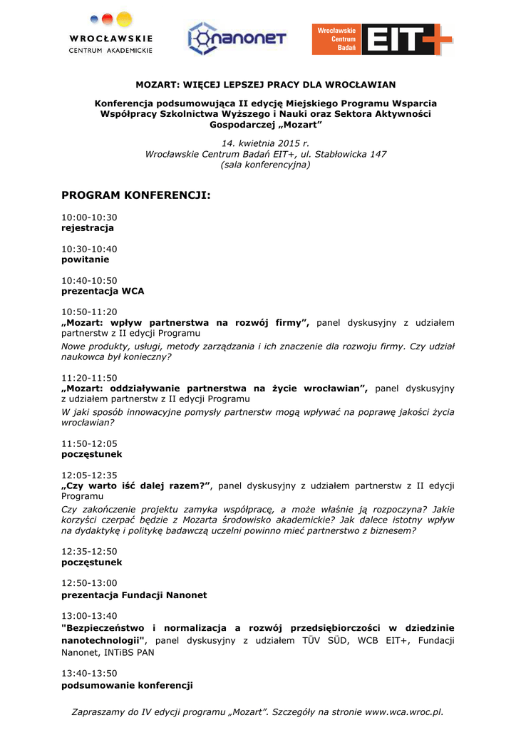 MOZART: WIĘCEJ LEPSZEJ PRACY DLA WROCŁAWIAN Konferencja podsumowująca II edycję Miejskiego Programu Wsparcia Współpracy Szkolnictwa Wyższego i Nauki oraz Sektora Aktywności Gospodarczej „Mozart” 14. kwietnia 2015 r. Wrocławskie Centrum Badań EIT+, ul. Stabłowicka 147 (sala konferencyjna) PROGRAM KONFERENCJI: 10:00-10:30 rejestracja 10:30-10:40 powitanie 10:40-10:50 prezentacja WCA 10:50-11:20 „Mozart: wpływ partnerstwa na rozwój firmy”, panel dyskusyjny z udziałem partnerstw z II edycji Programu Nowe produkty, usługi, metody zarządzania i ich znaczenie dla rozwoju firmy. Czy udział naukowca był konieczny? 11:20-11:50 „Mozart: oddziaływanie partnerstwa na życie wrocławian”, panel dyskusyjny z udziałem partnerstw z II edycji Programu W jaki sposób innowacyjne pomysły partnerstw mogą wpływać na poprawę jakości życia wrocławian? 11:50-12:05 poczęstunek 12:05-12:35 „Czy warto iść dalej razem?”, panel dyskusyjny z udziałem partnerstw z II edycji Programu Czy zakończenie projektu zamyka współpracę, a może właśnie ją rozpoczyna? Jakie korzyści czerpać będzie z Mozarta środowisko akademickie? Jak dalece istotny wpływ na dydaktykę i politykę badawczą uczelni powinno mieć partnerstwo z biznesem? 12:35-12:50 poczęstunek 12:50-13:00 prezentacja Fundacji Nanonet 13:00-13:40 "Bezpieczeństwo i normalizacja a rozwój przedsiębiorczości w dziedzinie nanotechnologii", panel dyskusyjny z udziałem TÜV SÜD, WCB EIT+, Fundacji Nanonet, INTiBS PAN 13:40-13:50 podsumowanie konferencji Zapraszamy do IV edycji programu „Mozart”. Szczegóły na stronie www.wca.wroc.pl.