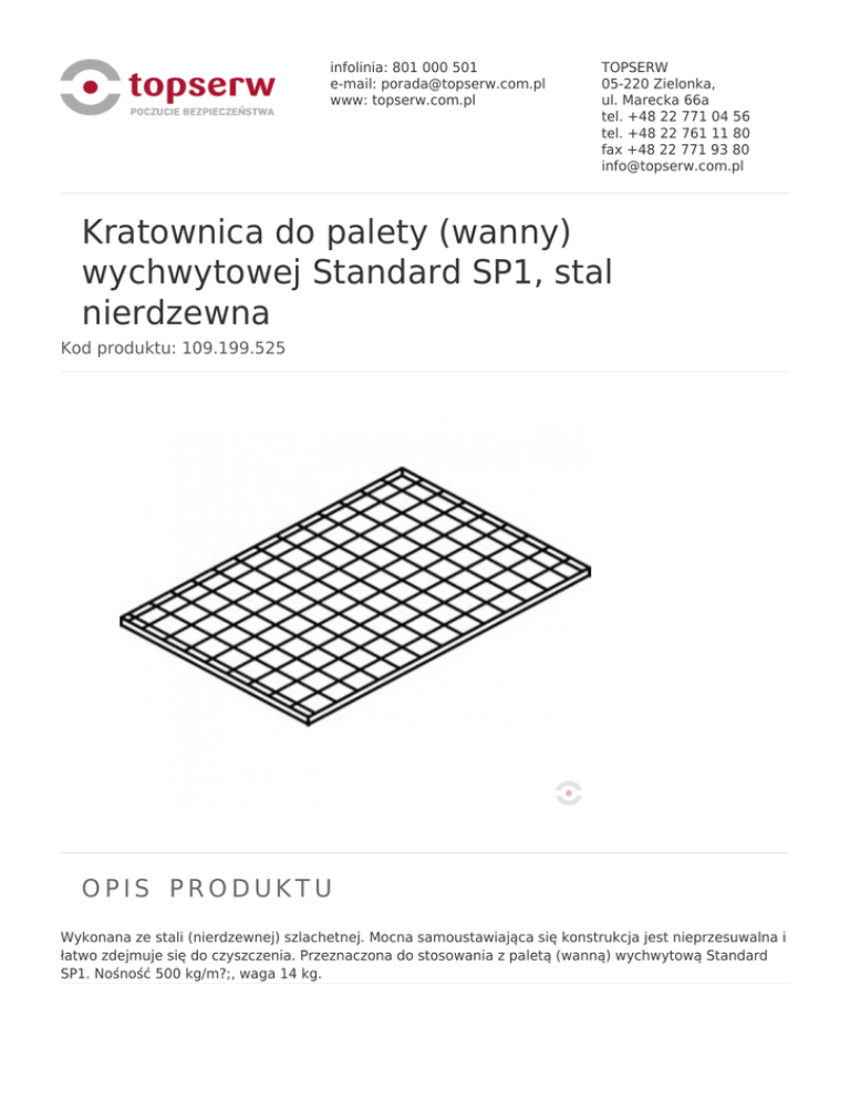 infolinia: 801 000 501 e-mail: [email protected] www: topserw.com.pl TOPSERW 05-220 Zielonka, ul. Marecka 66a tel. +48 22 771 04 56 tel. +48 22 761 11 80 fax +48 22 771 93 80 [email protected] Kratownica do palety (wanny) wychwytowej Standard SP1, stal nierdzewna Kod produktu: 109.199.525 OPIS PRODUKTU Wykonana ze stali (nierdzewnej) szlachetnej. Mocna samoustawiająca się konstrukcja jest nieprzesuwalna i łatwo zdejmuje się do czyszczenia. Przeznaczona do stosowania z paletą (wanną) wychwytową Standard SP1. Nośność 500 kg/m?;, waga 14 kg. DANE TECHNICZNE POWIĄZANE Produkt Kratownica do palety (wanny) wychwytowej Standard SP1, stal nierdzewna Kratownica do palety (wanny) wychwytowej Standard SP2, stal nierdzewna Kratownica do palety (wanny) wychwytowej Standard SP4Q, stal nierdzewna Kratownica do palety (wanny) wychwytowej Standard SP8K, stal nierdzewna Kratownica do palety (wanny) wychwytowej Standard SP3L, stal nierdzewna Kratownica do palety (wanny) wychwytowej Standard SP4L, stal nierdzewna