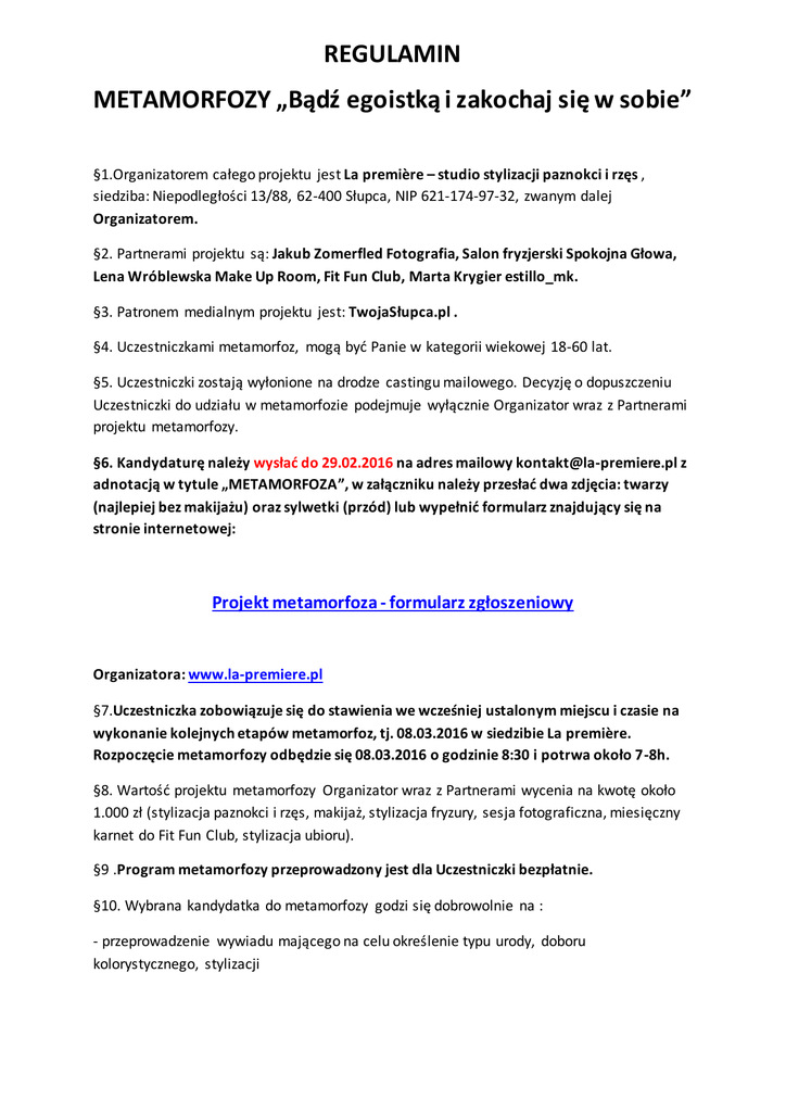 REGULAMIN METAMORFOZY „Bądź egoistką i zakochaj się w sobie” §1.Organizatorem całego projektu jest La première – studio stylizacji paznokci i rzęs , siedziba: Niepodległości 13/88, 62-400 Słupca, NIP 621-174-97-32, zwanym dalej Organizatorem. §2. Partnerami projektu są: Jakub Zomerfled Fotografia, Salon fryzjerski Spokojna Głowa, Lena Wróblewska Make Up Room, Fit Fun Club, Marta Krygier estillo_mk. §3. Patronem medialnym projektu jest: TwojaSłupca.pl . §4. Uczestniczkami metamorfoz, mogą być Panie w kategorii wiekowej 18-60 lat. §5. Uczestniczki zostają wyłonione na drodze castingu mailowego. Decyzję o dopuszczeniu Uczestniczki do udziału w metamorfozie podejmuje wyłącznie Organizator wraz z Partnerami projektu metamorfozy. §6. Kandydaturę należy wysłać do 29.02.2016 na adres mailowy [email protected] z adnotacją w tytule „METAMORFOZA”, w załączniku należy przesłać dwa zdjęcia: twarzy (najlepiej bez makijażu) oraz sylwetki (przód) lub wypełnić formularz znajdujący się na stronie internetowej: Projekt metamorfoza - formularz zgłoszeniowy Organizatora: www.la-premiere.pl §7.Uczestniczka zobowiązuje się do stawienia we wcześniej ustalonym miejscu i czasie na wykonanie kolejnych etapów metamorfoz, tj. 08.03.2016 w siedzibie La première. Rozpoczęcie metamorfozy odbędzie się 08.03.2016 o godzinie 8:30 i potrwa około 7-8h. §8. Wartość projektu metamorfozy Organizator wraz z Partnerami wycenia na kwotę około 1.000 zł (stylizacja paznokci i rzęs, makijaż, stylizacja fryzury, sesja fotograficzna, miesięczny karnet do Fit Fun Club, stylizacja ubioru). §9 .Program metamorfozy przeprowadzony jest dla Uczestniczki bezpłatnie. §10. Wybrana kandydatka do metamorfozy godzi się dobrowolnie na : - przeprowadzenie wywiadu mającego na celu określenie typu urody, doboru kolorystycznego, stylizacji - wykonanie sesji przed i po oraz w trakcie zabiegów, jak również wykonanie finalnych zdjęć i krótkiego wideoreportażu w trakcie oraz po metamorfozie - poddaniu się serii zabiegów: a. zmianę koloru włosów, długości, oraz innych zabiegów niezbędnych do finalizacji zamierzeń fryzjera b. poddanie się makijażowi c. poddanie się zabiegom stylizacji paznokci i rzęs d. poddanie się stylizacji wyglądu, jak i zmianie wizerunku §11. Uczestniczka wyraża pełną zgodę na wykorzystanie materiału fotograficznego oraz filmowego z przebiegu metamorfoz do celów promocyjnych, marketingowych, reklamowych jak i archiwalnych. §12. Organizator zapewnia profesjonalną obsługę metamorfozy przez osoby o najwyższych kwalifikacjach zawodowych i zobowiązuje się również dbać o dobro uczestniczki i zadowolenie z dokonanych zmian. §13. Żadne z wykonanych usług lub świadczeń na rzecz uczestniczki nie podlegają reklamacji, ani innym roszczeniom ze strony uczestniczki. §14. Wszelkie inne regulacje prawne niewyszczególnione w tym regulaminie podlegają pod Kodeks Cywilny. §15. Wszelkie spory będzie rozstrzygać Sąd Okręgowy.