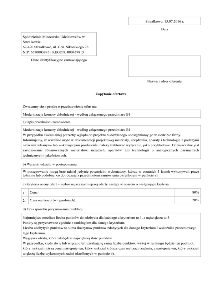 Strzałkowo, 15.07.2016 r. Data Spółdzielnia Mleczarska Udziałowców w Strzałkowie 62-420 Strzałkowo, ul. Gen. Sikorskiego 28 NIP: 6670003995 / REGON: 000439813 Dane identyfikacyjne zamawiającego Nazwa i adres oferenta Zapytanie ofertowe Zwracamy się z prośbą o przedstawienie ofert na: Modernizacja komory chłodniczej - według załączonego przedmiaru B1. a) Opis przedmiotu zamówienia Modernizacja komory chłodniczej - według załączonego przedmiaru B1. W przypadku ewentualnej potrzeby wglądu do projektu budowlanego udostępniamy go w siedzibie firmy. Informujemy, iż wszelkie użyte w dokumentacji projektowej materiały, urządzenia, aparaty i technologie z podanymi nazwami własnymi lub wskazującymi producenta, należy traktować wyłącznie, jako przykładowe. Dopuszczalne jest zastosowanie równoważnych materiałów, urządzeń, aparatów lub technologii o analogicznych parametrach technicznych i jakościowych. b) Warunki udziału w postępowaniu W postępowaniu mogą brać udział jedynie potencjalni wykonawcy, którzy w ostatnich 3 latach wykonywali prace tożsame lub podobne, co do rodzaju z przedmiotem zamówienia określonym w punkcie a). c) Kryteria oceny ofert – wybór najkorzystniejszej oferty nastąpi w oparciu o następujące kryteria: 1. Cena 80% 2. Czas realizacji (w tygodniach) 20% d) Opis sposobu przyznawania punktacji Najmniejsza możliwa liczba punktów do zdobycia dla każdego z kryterium to 1, a największa to 3. Punkty są przyznawane zgodnie z rankingiem dla danego kryterium. Liczba zdobytych punktów to suma iloczynów punktów zdobytych dla danego kryterium i wskaźnika procentowego tego kryterium. Wygrywa oferta, która zdobędzie największą ilość punktów. W przypadku, kiedy dwie lub więcej ofert uzyskają tę samą liczbę punktów, wyżej w rankingu będzie ten podmiot, który wskazał niższą cenę, następnie ten, który wskazał krótszy czas realizacji zadania, a następnie ten, który wskazał większą liczbę wykonanych zadań określonych w punkcie b). e) Informacja na temat zakresu wykluczenia Odrzuceniu podlegają oferty: - których treść nie odpowiada treści zapytania ofertowego, - złożone przez oferenta, który nie spełnia warunków, określonych w zapytaniu ofertowym, - które zostały złożone po wyznaczonym terminie na składanie ofert, - złożone przez oferenta podlegającego wykluczeniu w związku z istnieniem powiązań osobowych lub kapitałowych. Z udziału w postępowaniu wyklucza się Oferentów powiązanych kapitałowo lub osobowo z Zamawiającym. Przez powiązania kapitałowe lub osobowe rozumie się wzajemne powiązania między Zamawiającym lub osobami upoważnionymi do zaciągania zobowiązań w imieniu Zamawiającego lub osobami wykonującymi w imieniu Zamawiającego czynności związane z przygotowaniem i przeprowadzeniem procedury wyboru wykonawcy a wykonawcą, polegające w szczególności na: 1) uczestniczeniu w spółce, jako wspólnik spółki cywilnej lub spółki osobowej, 2) posiadaniu co najmniej 10 % udziałów lub akcji, 3) pełnieniu funkcji członka organu nadzorczego lub zarządzającego, prokurenta, pełnomocnika, 4) pozostawaniu w związku małżeńskim, w stosunku pokrewieństwa lub powinowactwa w linii prostej, 5) pozostawaniu z wykonawcą w takim stosunku prawnym lub faktycznym, że może to budzić uzasadnione wątpliwości, co do bezstronności tych osób. f) Termin składania ofert upływa w dniu: 29-07-2016 r. g) Termin realizacji zamówienia Ostateczny możliwy do zaakceptowania termin realizacji zamówienia upływa w dniu: h) Ofertę należy złożyć w: 30-12-2016 r. Spółdzielnia Mleczarska Udziałowców w Strzałkowie 62-420 Strzałkowo, ul. Gen. Sikorskiego 28 [email protected] i) Akceptowalne formy składania ofert: Osobiście, listem, pocztą kurierską na adres: Spółdzielnia Mleczarska Udziałowców w Strzałkowie 62-420 Strzałkowo, ul. Gen. Sikorskiego 28 drogą elektroniczną na adres email: [email protected] j) Złożona oferta powinna zawierać co najmniej: - dane identyfikujące oferenta (nazwę i adres), - opis nawiązujący do parametrów wyszczególnionych w zapytaniu ofertowym (opis przedmiotu zamówienia), - wartość oferty netto oraz brutto, wartość podatku VAT, - czas realizacji zamówienia (wyrażony w tygodniach), - termin realizacji zamówienia, - okres gwarancji (wyrażony w miesiącach), - warunki płatności, - listę referencyjną z wykonania tożsamych lub podobnych prac, co do rodzaju przedmiotu zamówienia w ostatnich 3 latach, - termin ważności oferty. Oferty powinny zawierać dane identyfikujące oferenta, tj. zawierać pełną nazwę wystawcy oferty (np. zostać opatrzone pieczęcią imienną/nagłówkową, zostać sporządzone na papierze firmowym, itp.). Oferty muszą również zawierać datę sporządzenia dokumentu oraz podpis oferenta lub osoby uprawnionej do występowania w jego imieniu. W przypadku wersji elektronicznej za wystarczające uważa się podanie imienia i nazwiska osoby występującej w imieniu oferenta (sporządzającej ofertę). Za datę sporządzenia dokumentu – uznaje się datę wysłania oferty drogą elektroniczną. Przedkładane oferty muszą odpowiadać treści zapytania ofertowego. Ponadto oferta musi zawierać kosztorys ofertowy z wyceną każdej pozycji załączonego przedmiaru, wskazane jest, aby oferta zawierała inne dodatkowe informacje, np. możliwe do uzyskania upusty, wymagania dotyczące konserwacji, itp. k) Niedopuszczalne jest składanie ofert częściowych l) W przypadku konieczności wykonania innych prac wykraczających poza zakres zamówienia podstawowego, których konieczność wykonania pojawiła się w trakcie realizacji robót, a ich wykonanie jest niezbędne do prawidłowego wykonania zamówienia podstawowego Spółdzielnia Mleczarska Udziałowców w Strzałkowie przewiduje możliwość zawarcia stosownego aneksu do umowy z wykonawcą. ł) Rozstrzygnięcie postępowania ofertowego Sp