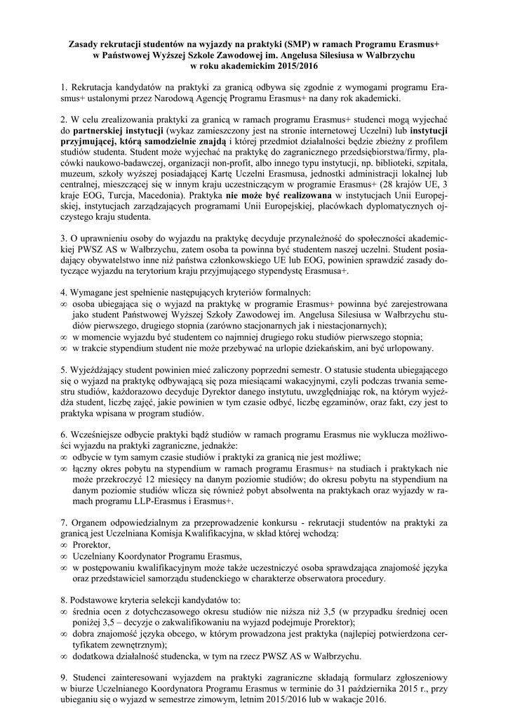 Zasady rekrutacji studentów na wyjazdy na praktyki (SMP) w ramach Programu Erasmus+ w Państwowej WyŜszej Szkole Zawodowej im. Angelusa Silesiusa w Wałbrzychu w roku akademickim 2015/2016 1. Rekrutacja kandydatów na praktyki za granicą odbywa się zgodnie z wymogami programu Erasmus+ ustalonymi przez Narodową Agencję Programu Erasmus+ na dany rok akademicki. 2. W celu zrealizowania praktyki za granicą w ramach programu Erasmus+ studenci mogą wyjechać do partnerskiej instytucji (wykaz zamieszczony jest na stronie internetowej Uczelni) lub instytucji przyjmującej, którą samodzielnie znajdą i której przedmiot działalności będzie zbieŜny z profilem studiów studenta. Student moŜe wyjechać na praktykę do zagranicznego przedsiębiorstwa/firmy, placówki naukowo-badawczej, organizacji non-profit, albo innego typu instytucji, np. biblioteki, szpitala, muzeum, szkoły wyŜszej posiadającej Kartę Uczelni Erasmusa, jednostki administracji lokalnej lub centralnej, mieszczącej się w innym kraju uczestniczącym w programie Erasmus+ (28 krajów UE, 3 kraje EOG, Turcja, Macedonia). Praktyka nie moŜe być realizowana w instytucjach Unii Europejskiej, instytucjach zarządzających programami Unii Europejskiej, placówkach dyplomatycznych ojczystego kraju studenta. 3. O uprawnieniu osoby do wyjazdu na praktykę decyduje przynaleŜność do społeczności akademickiej PWSZ AS w Wałbrzychu, zatem osoba ta powinna być studentem naszej uczelni. Student posiadający obywatelstwo inne niŜ państwa członkowskiego UE lub EOG, powinien sprawdzić zasady dotyczące wyjazdu na terytorium kraju przyjmującego stypendystę Erasmusa+. 4. Wymagane jest spełnienie następujących kryteriów formalnych: • osoba ubiegająca się o wyjazd na praktykę w programie Erasmus+ powinna być zarejestrowana jako student Państwowej WyŜszej Szkoły Zawodowej im. Angelusa Silesiusa w Wałbrzychu studiów pierwszego, drugiego stopnia (zarówno stacjonarnych jak i niestacjonarnych); • w momencie wyjazdu być studentem co najmniej drugiego roku studiów pierwszego stopnia; • w trakcie stypendium student nie moŜe przebywać na urlopie dziekańskim, ani być urlopowany. 5. WyjeŜdŜający student powinien mieć zaliczony poprzedni semestr. O statusie studenta ubiegającego się o wyjazd na praktykę odbywającą się poza miesiącami wakacyjnymi, czyli podczas trwania semestru studiów, kaŜdorazowo decyduje Dyrektor danego instytutu, uwzględniając rok, na którym wyjeŜdŜa student, liczbę zajęć, jakie powinien w tym czasie odbyć, liczbę egzaminów, oraz fakt, czy jest to praktyka wpisana w program studiów. 6. Wcześniejsze odbycie praktyki bądź studiów w ramach programu Erasmus nie wyklucza moŜliwości wyjazdu na praktyki zagraniczne, jednakŜe: • odbycie w tym samym czasie studiów i praktyki za granicą nie jest moŜliwe; • łączny okres pobytu na stypendium w ramach programu Erasmus+ na studiach i praktykach nie moŜe przekroczyć 12 miesięcy na danym poziomie studiów; do okresu pobytu na stypendium na danym poziomie studiów wlicza się równieŜ pobyt absolwenta na praktykach oraz wyjazdy w ramach programu LLP-Erasmus i Erasmus+. 7. Organem odpowiedzialnym za przeprowadzenie konkursu - rekrutacji studentów na praktyki za granicą jest Uczelniana Komisja Kwalifikacyjna, w skład której wchodzą: • Prorektor, • Uczelniany Koordynator Programu Erasmus, • w postępowaniu kwalifikacyjnym moŜe takŜe uczestniczyć osoba sprawdzająca znajomość języka oraz przedstawiciel samorządu studenckiego w charakterze obserwatora procedury. 8. Podstawowe kryteria selekcji kandydatów to: • średnia ocen z dotychczasowego okresu studiów nie niŜsza niŜ 3,5 (w przypadku średniej ocen poniŜej 3,5 – decyzje o zakwalifikowaniu na wyjazd podejmuje Prorektor); • dobra znajomość języka obcego, w którym prowadzona jest praktyka (najlepiej potwierdzona certyfikatem zewnętrznym); • dodatkowa działalność studencka, w tym na rzecz PWSZ AS w Wałbrzychu. 9. Studenci zainteresowani wyjazdem na praktyki zagraniczne składają formularz zgłoszeniowy w biurze Uczelnianego Koordynatora Programu Erasmus w terminie do 31 października 2015 r., przy ubieganiu się o wyjazd w semestrze zimowym, letnim 2015/2016 lub w wakacje 2016. 10. Uczelniana Komisja Kwalifikacyjna w oparciu o dostarczone dokumenty (formularz zgłoszeniowy, ewentualny certyfikat), podaje ostateczną punktację uzyskaną przez studenta, zgodnie z poniŜszą tabelą: KRYTERIA PUNKTACJA Średnia ocen ze studiów max. 50 5,0 50 4-4,9 40-49 3,0-3,9 30-39 Średnia ocen z języka obcego max. 30 5,0 lub certyfikat 30 4-4,9 20-29 3-3,9 10-19 Działalność studencka max. 20 - samorząd studencki 5 - koła naukowe 5 - organizacje kulturalne 2 - organizacje sportowe 2 - wolontariat 2 - współorganizacja konferencji 2 - inne 2 11. W przypadku większej liczby studentów niŜ posiadanych miejsc, kryterium pierwszeństwa stanowi wyŜsza średnia ocen z dotychczasowego okresu studiów. 12. Lista podstawowa i rezerwowa osób zakwalifikowanych oraz lista osób niezakwalifikowanych zamieszczona zostanie na stronie internetowej PWSZ AS w Wałbrzychu w ciągu 5 dni roboczych. 13. Student ma prawo odwołania się od decyzji Uczelnianej Komisji Kwalifikacyjnej. Odwołanie składa się do Rektora za pośrednictwem Uczelnianego Koordynatora Programu Erasmus w terminie 14 dni od daty powiadomienia o wynikach procedury kwalifikacyjnej. 14. Praktyka moŜe trwać od 2 do 12 miesięcy zgodnie z uzgodnionym i podpisanym przez wszystkie strony programem uwzględnionym w „Porozumieniu o programie praktyki” (Training Agreement). Planowany okres finansowania to 2-3 miesiące. W przypadku przedłuŜenia praktyki pierwotnie deklarowanej na 2 miesiące i braku lub niewystarczającej ilości środków finansowych na wypłatę stypendiów na praktyki, istnieje moŜliwość przedłuŜenia pobytu bez środków finansowych (grant „0”). Student