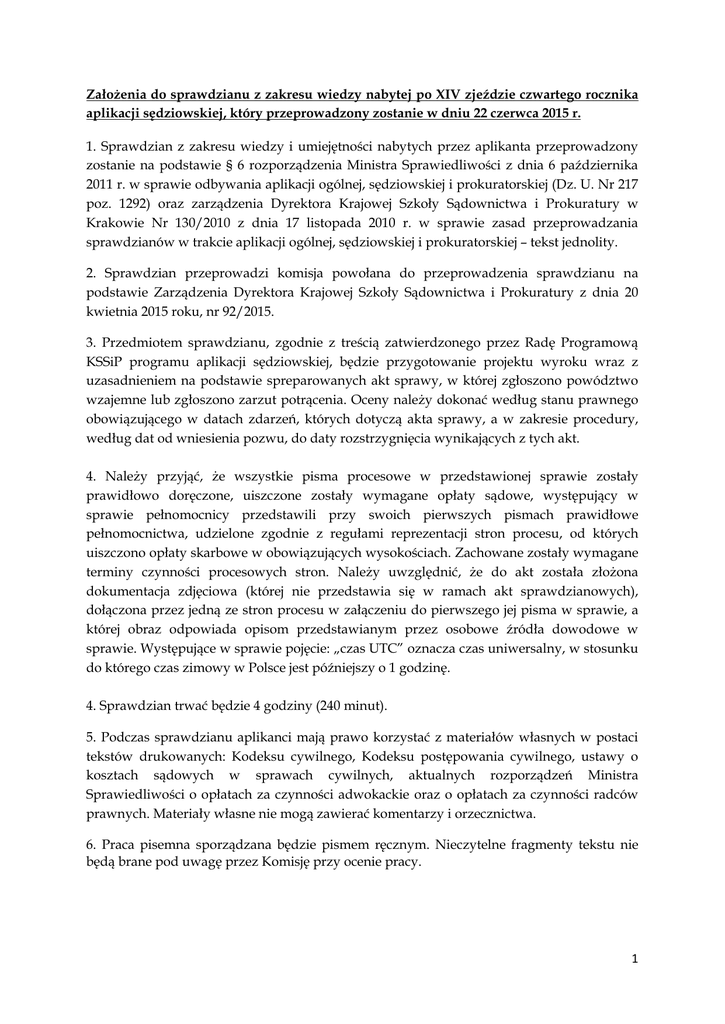 Założenia do sprawdzianu z zakresu wiedzy nabytej po XIV zjeździe czwartego rocznika aplikacji sędziowskiej, który przeprowadzony zostanie w dniu 22 czerwca 2015 r. 1. Sprawdzian z zakresu wiedzy i umiejętności nabytych przez aplikanta przeprowadzony zostanie na podstawie § 6 rozporządzenia Ministra Sprawiedliwości z dnia 6 października 2011 r. w sprawie odbywania aplikacji ogólnej, sędziowskiej i prokuratorskiej (Dz. U. Nr 217 poz. 1292) oraz zarządzenia Dyrektora Krajowej Szkoły Sądownictwa i Prokuratury w Krakowie Nr 130/2010 z dnia 17 listopada 2010 r. w sprawie zasad przeprowadzania sprawdzianów w trakcie aplikacji ogólnej, sędziowskiej i prokuratorskiej – tekst jednolity. 2. Sprawdzian przeprowadzi komisja powołana do przeprowadzenia sprawdzianu na podstawie Zarządzenia Dyrektora Krajowej Szkoły Sądownictwa i Prokuratury z dnia 20 kwietnia 2015 roku, nr 92/2015. 3. Przedmiotem sprawdzianu, zgodnie z treścią zatwierdzonego przez Radę Programową KSSiP programu aplikacji sędziowskiej, będzie przygotowanie projektu wyroku wraz z uzasadnieniem na podstawie spreparowanych akt sprawy, w której zgłoszono powództwo wzajemne lub zgłoszono zarzut potrącenia. Oceny należy dokonać według stanu prawnego obowiązującego w datach zdarzeń, których dotyczą akta sprawy, a w zakresie procedury, według dat od wniesienia pozwu, do daty rozstrzygnięcia wynikających z tych akt. 4. Należy przyjąć, że wszystkie pisma procesowe w przedstawionej sprawie zostały prawidłowo doręczone, uiszczone zostały wymagane opłaty sądowe, występujący w sprawie pełnomocnicy przedstawili przy swoich pierwszych pismach prawidłowe pełnomocnictwa, udzielone zgodnie z regułami reprezentacji stron procesu, od których uiszczono opłaty skarbowe w obowiązujących wysokościach. Zachowane zostały wymagane terminy czynności procesowych stron. Należy uwzględnić, że do akt została złożona dokumentacja zdjęciowa (której nie przedstawia się w ramach akt sprawdzianowych), dołączona przez jedną ze stron procesu w załączeniu do pierwszego jej pisma w sprawie, a której obraz odpowiada opisom przedstawianym przez osobowe źródła dowodowe w sprawie. Występujące w sprawie pojęcie: „czas UTC” oznacza czas uniwersalny, w stosunku do którego czas zimowy w Polsce jest późniejszy o 1 godzinę. 4. Sprawdzian trwać będzie 4 godziny (240 minut). 5. Podczas sprawdzianu aplikanci mają prawo korzystać z materiałów własnych w postaci tekstów drukowanych: Kodeksu cywilnego, Kodeksu postępowania cywilnego, ustawy o kosztach sądowych w sprawach cywilnych, aktualnych rozporządzeń Ministra Sprawiedliwości o opłatach za czynności adwokackie oraz o opłatach za czynności radców prawnych. Materiały własne nie mogą zawierać komentarzy i orzecznictwa. 6. Praca pisemna sporządzana będzie pismem ręcznym. Nieczytelne fragmenty tekstu nie będą brane pod uwagę przez Komisję przy ocenie pracy. 1 7. W trakcie trwania sprawdzianu aplikanci mogą tylko w uzasadnionych przypadkach pojedynczo opuszczać salę, po uzyskaniu zgody osoby nadzorującej, która odnotowuje pod tekstem przekazanej jej pracy godzinę wyjścia i powrotu aplikanta. 8. W trakcie trwania sprawdzianu aplikanci nie mogą komunikować się ze sobą, używać telefonów komórkowych a także innych urządzeń elektronicznych oraz nośników danych. 9. Praca pisemna oceniana będzie przy uwzględnieniu następujących kryteriów: -merytorycznego, odnoszącego się do prawidłowości stosowania przepisów prawa materialnego i procesowego, -poprawności rozstrzygnięcia, co do istoty sprawy oraz co do kosztów procesu, -umiejętności uwzględniania okoliczności faktycznych istotnych dla podjęcia decyzji, -poprawności dokonywania oceny dowodów, -poprawności, kompleksowości oraz kompletności argumentacji podjętej decyzji, -poprawności formalnej konstrukcji wyroku w zakresie wskazania stron procesu, daty i miejsca wydania orzeczenia, składu sądu, przedmiotu sprawy, wreszcie: treści rozstrzygnięcia i jego uzasadnienia (powinno ono zawierać wszelkie wymagane ustawowo elementy wymienione w art. 328 § 2 k.p.c.), -prawidłowości przywoływania i stosowania pojęć i instytucji prawnych, -poprawności logicznej twierdzeń i tez zawartych w pracy pisemnej, -poprawności językowej, w tym także odnoszącej się do zachowania właściwych reguł gramatycznych i stylistycznych. 11. Warunkiem zaliczenia sprawdzianu jest uzyskanie, co najmniej 2 punktów. Od wystawionej przez komisję oceny ze sprawdzianu odwołanie nie przysługuje. 12. Aplikanci uczestniczący w sprawdzianie zobowiązani są zapoznać się z treścią i przestrzegać wszystkich postanowień zarządzenia Dyrektora Krajowej Szkoły Sądownictwa i Prokuratury w Krakowie Nr 130/2010 z dnia 17 listopada 2010r. w sprawie zasad przeprowadzania sprawdzianów w trakcie aplikacji ogólnej, sędziowskiej i prokuratorskiej. Komisja do przeprowadzenia sprawdzianu: SSA Iwona Biedroń SSO Izabela Wawrzynkiewicz SSO Leon Miroszewski 2