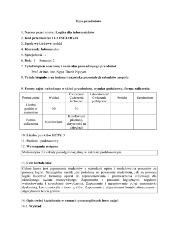 Opis przedmiotu 1. Nazwa przedmiotu: Logika dla informatyków 2