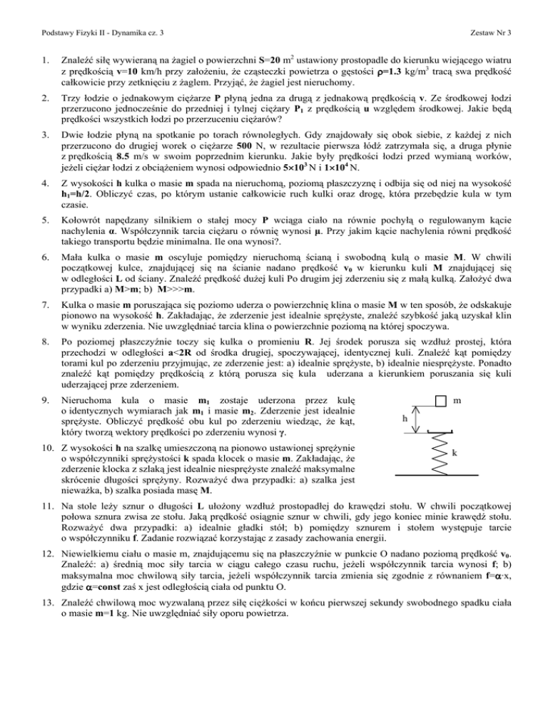Podstawy Fizyki II - Dynamika cz. 3 Zestaw Nr 3 1. Znaleźć siłę wywieraną na Ŝagiel o powierzchni S=20 m2 ustawiony prostopadle do kierunku wiejącego wiatru z prędkością v=10 km/h przy załoŜeniu, Ŝe cząsteczki powietrza o gęstości ρ=1.3 kg/m3 tracą swa prędkość całkowicie przy zetknięciu z Ŝaglem. Przyjąć, Ŝe Ŝagiel jest nieruchomy. 2. Trzy łodzie o jednakowym cięŜarze P płyną jedna za drugą z jednakową prędkością v. Ze środkowej łodzi przerzucono jednocześnie do przedniej i tylnej cięŜary P1 z prędkością u względem środkowej. Jakie będą prędkości wszystkich łodzi po przerzuceniu cięŜarów? 3. Dwie łodzie płyną na spotkanie po torach równoległych. Gdy znajdowały się obok siebie, z kaŜdej z nich przerzucono do drugiej worek o cięŜarze 500 N, w rezultacie pierwsza łódź zatrzymała się, a druga płynie z prędkością 8.5 m/s w swoim poprzednim kierunku. Jakie były prędkości łodzi przed wymianą worków, jeŜeli cięŜar łodzi z obciąŜeniem wynosi odpowiednio 5× ×103 N i 1× ×104 N. 4. Z wysokości h kulka o masie m spada na nieruchomą, poziomą płaszczyznę i odbija się od niej na wysokość h1=h/2. Obliczyć czas, po którym ustanie całkowicie ruch kulki oraz drogę, która przebędzie kula w tym czasie. 5. Kołowrót napędzany silnikiem o stałej mocy P wciąga ciało na równie pochyłą o regulowanym kącie nachylenia α. Współczynnik tarcia cięŜaru o równię wynosi µ. Przy jakim kącie nachylenia równi prędkość takiego transportu będzie minimalna. Ile ona wynosi?. 6. Mała kulka o masie m oscyluje pomiędzy nieruchomą ścianą i swobodną kulą o masie M. W chwili początkowej kulce, znajdującej się na ścianie nadano prędkość v0 w kierunku kuli M znajdującej się w odległości L od ściany. Znaleźć prędkość duŜej kuli Po drugim jej zderzeniu się z małą kulką. ZałoŜyć dwa przypadki a) M>m; b) M>>>m. 7. Kulka o masie m poruszająca się poziomo uderza o powierzchnię klina o masie M w ten sposób, Ŝe odskakuje pionowo na wysokość h. Zakładając, Ŝe zderzenie jest idealnie spręŜyste, znaleźć szybkość jaką uzyskał klin w wyniku zderzenia. Nie uwzględniać tarcia klina o powierzchnie poziomą na której spoczywa. 8. Po poziomej płaszczyźnie toczy się kulka o promieniu R. Jej środek porusza się wzdłuŜ prostej, która przechodzi w odległości a<2R od środka drugiej, spoczywającej, identycznej kuli. Znaleźć kąt pomiędzy torami kul po zderzeniu przyjmując, ze zderzenie jest: a) idealnie spręŜyste, b) idealnie niespręŜyste. Ponadto znaleźć kąt pomiędzy prędkością z którą porusza się kula uderzana a kierunkiem poruszania się kuli uderzającej prze zderzeniem. 9. Nieruchoma kula o masie m1 zostaje uderzona przez kulę o identycznych wymiarach jak m1 i masie m2. Zderzenie jest idealnie spręŜyste. Obliczyć prędkość obu kul po zderzeniu wiedząc, Ŝe kąt, który tworzą wektory prędkości po zderzeniu wynosi γ. 10. Z wysokości h na szalkę umieszczoną na pionowo ustawionej spręŜynie o współczynniki spręŜystości k spada klocek o masie m. Zakładając, Ŝe zderzenie klocka z szlaką jest idealnie niespręŜyste znaleźć maksymalne skrócenie długości spręŜyny. RozwaŜyć dwa przypadki: a) szalka jest niewaŜka, b) szalka posiada masę M. m h k 11. Na stole leŜy sznur o długości L ułoŜony wzdłuŜ prostopadłej do krawędzi stołu. W chwili początkowej połowa sznura zwisa ze stołu. Jaką prędkość osiągnie sznur w chwili, gdy jego koniec minie krawędź stołu. RozwaŜyć dwa przypadki: a) idealnie gładki stół; b) pomiędzy sznurem i stołem występuje tarcie o współczynniku f. Zadanie rozwiązać korzystając z zasady zachowania energii. 12. Niewielkiemu ciału o masie m, znajdującemu się na płaszczyźnie w punkcie O nadano poziomą prędkość v0. Znaleźć: a) średnią moc siły tarcia w ciągu całego czasu ruchu, jeŜeli współczynnik tarcia wynosi f; b) maksymalna moc chwilową siły tarcia, jeŜeli współczynnik tarcia zmienia się zgodnie z równaniem f=α α·x, gdzie α=const zaś x jest odległością ciała od punktu O. 13. Znaleźć chwilową moc wyzwalaną przez siłę cięŜkości w końcu pierwszej sekundy swobodnego spadku ciała o masie m=1 kg. Nie uwzględniać siły oporu powietrza.