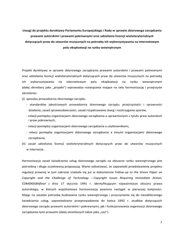 Uwagi do projektu dyrektywy Parlamentu Europejskiego i Rady w sprawie zbiorowego zarządzania prawami autorskimi i prawami pokrewnymi oraz udzielania licencji wieloterytorialnych dotyczących praw do utworów muzycznych na potrzeby ich wykorzystywania na internetowym polu eksploatacji na rynku wewnętrznym Projekt dyrektywy w sprawie zbiorowego zarządzania prawami autorskimi i prawami pokrewnymi oraz udzielania licencji wieloterytorialnych dotyczących praw do utworów muzycznych na potrzeby ich wykorzystywania na internetowym polu eksploatacji na rynku wewnętrznym (dalej określany jako „projekt”) wprowadza rozwiązania mające na celu harmonizację i przejrzyste określenie: (i) sposobu prowadzenia zbiorowego zarządu: - standardów jakościowych prowadzenia zbiorowego zarządu; przejrzystości i sprawności działania, zasad sprawozdawczości, zasad rozpatrywania skarg i rozstrzygania sporów, - relacji pomiędzy organizacjami zbiorowego zarządzania a uprawnionymi z tytułu praw autorskich i praw pokrewnych, - relacji pomiędzy organizacjami zbiorowego zarządzania a użytkownikami, - relacji pomiędzy organizacjami zbiorowego zarządzania a innymi organizacjami zbiorowego zarządzania, (ii) zasad udzielania licencji wieloterytorialnych dotyczących praw do utworów muzycznych w internecie. Harmonizacja zasad świadczenia usług zbiorowego zarządu na obszarze rynku wewnętrznego jest potrzebną i długo oczekiwaną propozycją. Warto odnotować, że zapowiedź przedstawienia projektu regulacji prawnej w tym zakresie znalazła się już w dokumencie Follow-up to the Green Paper on Copyright and the Challenge of Technology – Copyright Issues Requiring Immediate Action, COM(90)584final z dnia 17 stycznia 1991 r. identyfikującym najważniejsze obszary prawa autorskiego, w których wspólnotowa harmonizacja powinna nastąpić w pierwszej kolejności. Mając na uwadze potrzebę budowania rynku wewnętrznego i przyczyniania się do niezakłóconego świadczenia usług, zapowiedziano przeprowadzenie do końca 1992 r. studiów dotyczących zbiorowego zarządu prawami autorskimi i pokrewnymi, jak i funkcjonowania organizacji zbiorowego zarządzania tymi prawami (dalej określanych także jako „ozz”). 1 Dążąc do realizacji priorytetowego dla Unii Europejskiej celu, jakim jest stymulowanie rozwoju cyfrowego rynku wewnętrznego1 a w szczególności rynków opartych o korzystanie z praw autorskich i praw pokrewnych w sieciach teleinformatycznych, kluczowego znaczenia nabiera określenie zharmonizowanych przepisów w zakresie: a) prowadzenia zbiorowego zarządu - obejmujących jednolite wymagania w zakresie przejrzystości, sprawozdawczości i sprawności funkcjonowania; b) swobody wyboru przez uprawnionych organizacji zbiorowego zarządzania w wybranym przez siebie państwie członkowskim, bez względu na państwo członkowskie miejsca zamieszkania lub siedziby organizacji zbiorowego zarzadzania lub podmiotu praw autorskich, zgodnie z traktatową swobodą świadczenia usług; c) zasad negocjowania i kryteriów ustalania wysokości stawek wynagrodzeń z tytułu korzystania z przedmiotów praw autorskich i pokrewnych; kryteria te powinny uwzględniać rzeczywistą wartość ekonomiczną praw na poszczególnych rynkach w określonym czasie; d) zasad udzielania licencji wieloterytorialnych dotyczących korzystania z różnych przedmiotów praw autorskich i pokrewnych w internecie (z wyłączeniem praw do nadań); istotne jest aby licencje multiterytorialne obejmowały możliwie szeroki zakres utworów, fonogramów i artystycznych wykonań; dbis) alternatywnym rozwiązaniem do tego określonego w lit. d) byłoby określenia zasady państwa pochodzenia w odniesieniu do korzystania z przedmiotów praw autorskich i pokrewnych w internecie – na wzór zasady państwa pochodzenia określonej w odniesieniu do przekazu satelitarnego w dyrektywie satelitarno– kablowej,2 wspartego rozwiązaniem zapewniającym, 1 zob. European Commission Communication: "A coherent framework for building trust in the Digital Single Market for ecommerce and online services", COM(2011) 942, Communication from the Commission "A Single Market for Intellectual Property Rights - Boosting creativity and innovation to provide economic growth, high quality jobs and first class products and services in Europe", COM(2011) 287 final oraz European Commission Communication “Single Market Act II: Together for new growth”, COM(2012) 573 /3 2 zob. art. 1 ust. 2 lit. b dyrektywy w sprawie przekazu satelitarnego oraz retransmisji drogą kablową: „Satelitarny przekaz publiczny pojawia się wyłącznie w państwie członkowskim, w którym sygnały będące nośnikami programu są wprowadzane pod kontrolą organizacji radiowej i telewizyjnej i na jej odpowiedzialność, do zamkniętego łańcucha przekazu, prowadzącego do satelity i z powrotem na Ziemię”, a także reguła pomocnicza, mająca zastosowanie, gdy pierwsza reguła jurysdykcyjna nie może znaleźć zastosowania –zob. art. 1 ust. 2 lit. d tej dyrektywy: „W przypadku gdy publiczny przekaz satelitarny następuje w państwie nienależącym do Wspólnoty, które nie zapewnia poziomu ochrony przewidzianego na mocy rozdziału II, i) jeżeli sygnały będące nośnikami programu przekazywane są do satelity przez naziemną stację nadawczą znajdującą się w jednym z Państw Członkowskich, przyjmuje się, że publiczny przekaz satelitarny nastąpił w tym Państwie Członkowskim, a prawa przewidziane na mocy rozdziału II przysługują osobie obsługującej naziemną stacji nadawczą; lub ii) jeżeli nie jest używana żadna naziemna stacja nadawcza znajdująca się w jednym z Państw Członkowskich, lecz publiczny przekaz satelitarny nastąpił na zlecenie organizacji radiowej i telewizyjnej mającej siedzibę w jednym z Państw Członkowskich, przyjmuje się, że przekaz nastąpił w Państwie Członkowskim, w którym organizacja radiowa i telewizyjna posiada