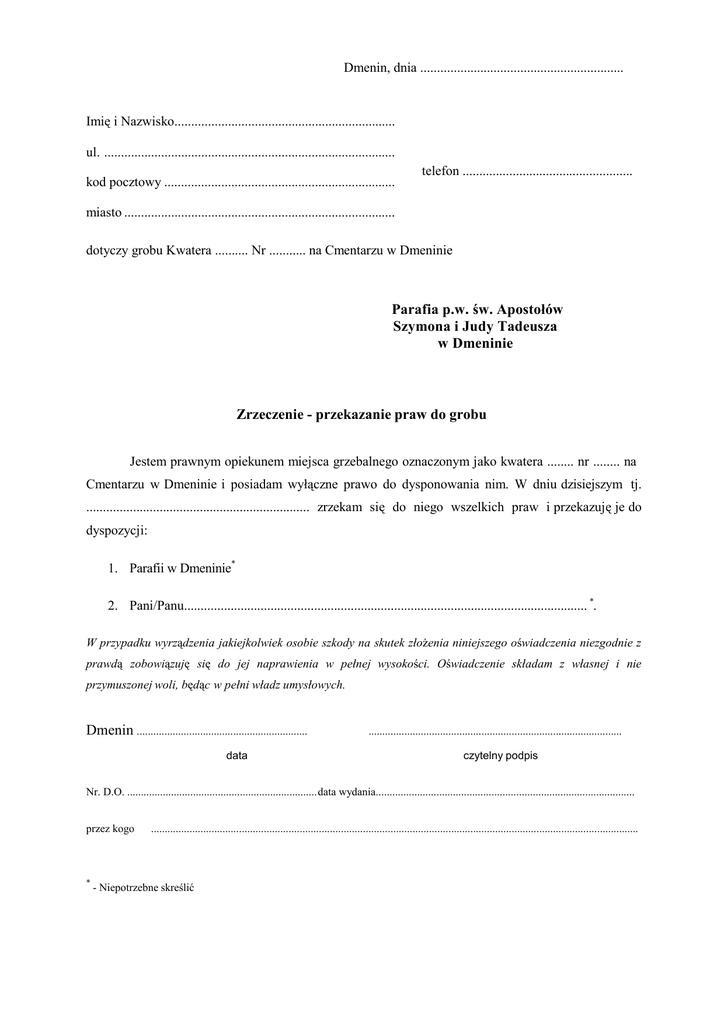 Dmenin, dnia ............................................................. Imię i Nazwisko.................................................................. ul. ....................................................................................... kod pocztowy ..................................................................... telefon ................................................... miasto ................................................................................. dotyczy grobu Kwatera .......... Nr ........... na Cmentarzu w Dmeninie Parafia p.w. św. Apostołów Szymona i Judy Tadeusza w Dmeninie Zrzeczenie - przekazanie praw do grobu Jestem prawnym opiekunem miejsca grzebalnego oznaczonym jako kwatera ........ nr ........ na Cmentarzu w Dmeninie i posiadam wyłączne prawo do dysponowania nim. W dniu dzisiejszym tj. ................................................................... zrzekam się do niego wszelkich praw i przekazuję je do dyspozycji: 1. Parafii w Dmeninie* 2. Pani/Panu......................................................................................................................... *. W przypadku wyrządzenia jakiejkolwiek osobie szkody na skutek złożenia niniejszego oświadczenia niezgodnie z prawdą zobowiązuję się do jej naprawienia w pełnej wysokości. Oświadczenie składam z własnej i nie przymuszonej woli, będąc w pełni władz umysłowych. Dmenin .............................................................. data ............................................................................................ czytelny podpis Nr. D.O. ..................................................................... data wydania.............................................................................................. przez kogo * ................................................................................................................................................................................. - Niepotrzebne skreślić