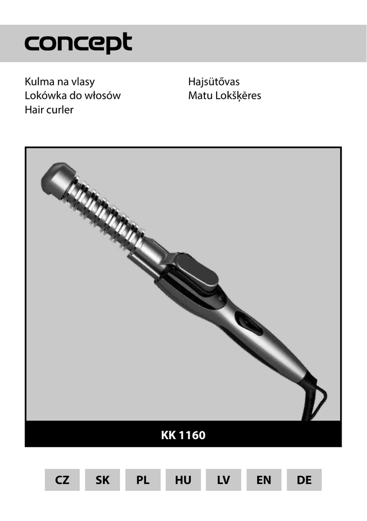 Kulma na vlasy Lokówka do włosów Hair curler Hajsütővas Matu Lokšķēres KK 1160 CZ SK PL HU LV EN DE CZ PODĚKOVÁNÍ Děkujeme Vám, že jste si zakoupili výrobek značky Concept a přejeme Vám, abyste byli s naším výrobkem spokojeni po celou dobu jeho používání. Před prvním použitím prostudujte pozorně celý návod k obsluze a potom si jej uschovejte. Zajistěte, aby i ostatní osoby, které budou s výrobkem manipulovat, byly seznámeny s tímto návodem. Technické parametry Napětí Příkon Provozní teplota 220–240 V ~50 Hz 35 W 120°C 140°C 160°C 180°C 200°C DŮLEŽITÁ BEZPEČNOSTNÍ UPOZORNĚNÍ • • • • • • • • • • • • • • • • • • • • • • Nepoužívejte spotřebič jinak, než je popsáno v tomto návodu. Před prvním použitím odstraňte ze spotřebiče všechny obaly a marketingové materiály. Ověřte, zda připojované napětí odpovídá hodnotám na typovém štítku spotřebiče. Pro další ochranu se doporučuje instalace proudového chrániče (RCD) se jmenovitým vybavovacím proudem nepřesahujícím 30 mA do obvodu elektrického napájení koupelny. Požádejte o radu elektrikáře. Spotřebič je během provozu i určitou dobu po vypnutí horký. Nedotýkejte se proto horkých povrchů. Používejte rukojeti a tlačítka. Hrozí nebezpečí popálení. Spotřebič nečistěte, neukládejte ani nezakrývejte, dokud úplně nevychladne. Nenechávejte spotřebič bez dozoru, pokud je zapnutý, popřípadě zapojený do zásuvky elektrického napětí. Pokud spotřebič během použití položíte, vždy jej vypněte a položte na nehořlavý podklad. Před připojením nebo vypojením spotřebiče ze zásuvky elektrického napětí se ujistěte, že je vypínač v poloze vypnuto. Při vypojování spotřebiče ze zásuvky elektrického napětí nikdy netahejte za přívodní kabel, ale uchopte zástrčku a tahem ji vypojte. Nedovolte dětem a nesvéprávným osobám se spotřebičem manipulovat, používejte ho mimo jejich dosahu. Osoby se sníženou pohybovou schopností, se sníženým smyslovým vnímáním, s nedostatečnou duševní způsobilostí nebo osoby neseznámené s obsluhou musí používat spotřebič jen pod dozorem zodpovědné, s obsluhou seznámené osoby. Dbejte zvýšené opatrnosti, pokud je spotřebič používán v blízkosti dětí. Nedovolte, aby byl spotřebič používán jako hračka. Před čištěním a po použití spotřebič vypněte, vypojte ze zásuvky elektrického napětí a nechte vychladnout. Nenechávejte přívodní kabel, aby se dotýkal horkých povrchů. Nenechávejte spotřebič viset na přívodním kabelu. Nepoužívejte spotřebič v prostředí s výskytem výbušných plynů a vznětlivých látek (rozpouštědla, laky, lepidla, atd.). Je-li spotřebič v provozu, nepoužívejte lak na vlasy ani jiné výrobky ve spreji. Nepoužívejte hořlavé substance, jako je lak na vlasy, tužící gel, atd., mohlo by dojít ke vznícení při kontaktu substance s žehlicími deskami. K čištění spotřebiče nepoužívejte hrubé a chemicky agresivní látky. Nepoužívejte spotřebič, pokud nepracuje správně, byl-li upuštěn, poškozen nebo namočen do kapaliny. Nechte ho přezkoušet a opravit autorizovaným servisním střediskem. KK 1160 3 CZ • Nepoužívejte spotřebič s poškozeným přívodním kabelem či zástrčkou, nechte závadu neprodleně odstranit autorizovaným servisním střediskem. • Neomotávejte přívodní kabel kolem těla spotřebiče. • Spotřebič nepoužívejte ve venkovním prostředí. • Spotřebič je vhodný pouze pro použití v domácnosti, není určen pro komerční použití. • Neponořujte přívodní kabel, zástrčku nebo spotřebič do vody ani do jiné kapaliny. • Nepoužívejte jiné příslušenství, než je doporučeno výrobcem. • Neopravujte spotřebič sami. Obraťte se na autorizovaný servis. Nedodržíte-li pokyny výrobce, nemůže být případná oprava uznána jako záruční. POZOR Spotřebič nepoužívejte v blízkosti van, umyvadel a jiných nádob naplněných vodou. Používáte-li spotřebič v koupelně, dbejte, abyste ho ihned po použití vypnuli a odpojili od sítě vytažením vidlice, protože blízkost vody a styk spotřebiče s vodou je velmi nebezpečný a to i v případě, když je spotřebič vypnutý. Nesahejte na spotřebič vlhkýma nebo mokrýma rukama a nemanipulujte s ním, máte-li vlhké nohy nebo jste-li bosí. POPIS VÝROBKU 1 2 3 4 5 6 7 8 9 10 Hlavní část Vypínač Kontrolky nastavení teploty Závěsné očko Kabel Páčka kleští kulmy Kleště kulmy Chladný konec čelistí Páčka spirály Spirála 6 3 2 4 5 10 8 4 7 9 1 KK 1160 CZ NÁVOD K OBSLUZE Nepoužívejte spotřebič k úpravě paruk a zvířat. 1. 2. 3. 4. 5. 6. 7. 8. Vlasy po umytí jemně vysušte ručníkem. Nepoužívejte lak na vlasy ani jiné hořlavé látky. Úplně rozviňte přívodní kabel. Připojte zástrčku spotřebiče do elektrické sítě. Vypínač (2) ON = spotřebič je zapnutý OFF = spotřebič je vypnutý Pokud spotřebič během použití položíte, vždy jej vypněte. Po použití spotřebič vypněte. Používáte-li spotřebič v koupelně, dbejte, abyste ho ihned po použití vypnuli a odpojili od sítě vytažením vidlice, protože blízkost vody a styk spotřebiče s vodou je velmi nebezpečný, a to i v případě, když je spotřebič vypnutý! Závěsné očko slouží k případnému zavěšení spotřebiče při uskladnění. Použití spotřebiče k natáčení vlasů 1. Držte spotřebič v ruce. Pro snadnější manipulaci můžete použít i druhou ruku a uchopit spotřebič za chladné konce čelistí (8). Stisknutím páčky (6) rozevřete kleště kulmy (7). 2. Sevřete do kleští kulmy připravený pramínek vlasů a natáčejte ho od špiček do lokny. Čím tenčí je pramen vlasů, tím pevnější kadeře vytvoříte. 3. Po natoče