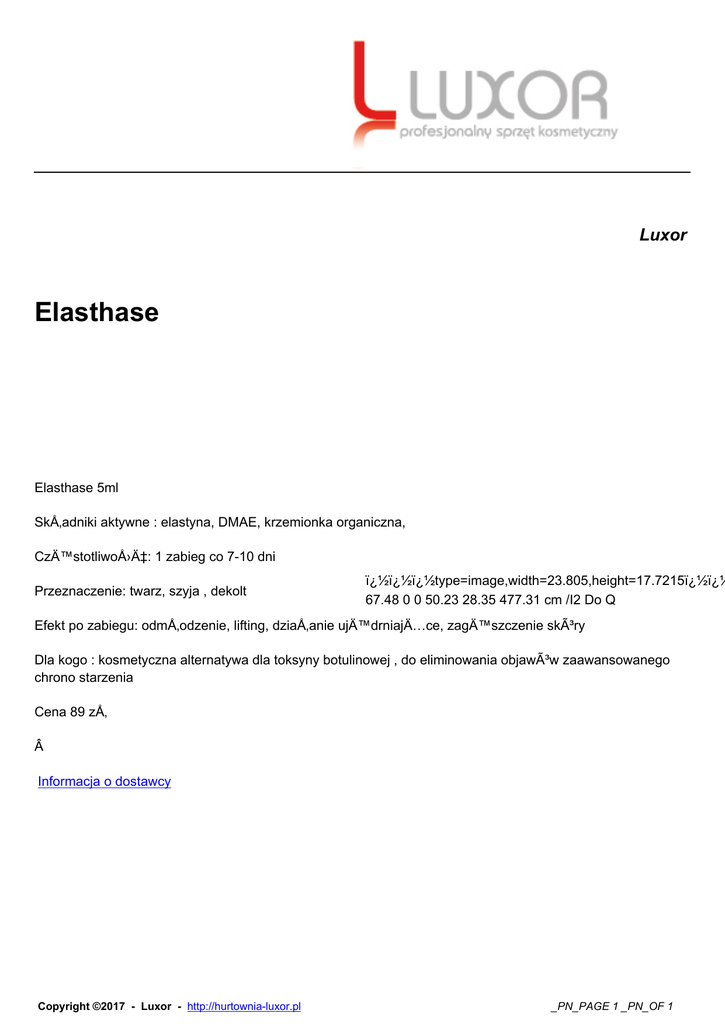 Luxor Elasthase Elasthase 5ml SkÅ‚adniki aktywne : elastyna, DMAE, krzemionka organiczna, CzÄ™stotliwość: 1 zabieg co 7-10 dni Przeznaczenie: twarz, szyja , dekolt ���type=image,width=23.805,height=17.7215�� 67.48 0 0 50.23 28.35 477.31 cm /I2 Do Q Efekt po zabiegu: odmÅ‚odzenie, lifting, dziaÅ‚anie ujÄ™drniajÄ…ce, zagÄ™szczenie skóry Dla kogo : kosmetyczna alternatywa dla toksyny botulinowej , do eliminowania objawów zaawansowanego chrono starzenia Cena 89 zÅ‚  Informacja o dostawcy Copyright ©2017 - Luxor - http://hurtownia-luxor.pl _PN_PAGE 1 _PN_OF 1