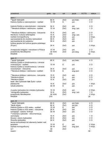 przedmiot godz. typ zal. język ECTS status sem.I **język hebrajski historia Żydów w starożytności - wykład 60 K 15 W ZnO E pol./heb. pol. 4O 3O historia Żydów w starożytności - ćwiczenia **literatura biblijna i rabiniczna - wykład 30 K 15 W ZnO ZnO pol. ang./ pol. 3O 1O **literatura biblijna i rabiniczna - ćwiczenia literatura i kultura sefardyjska wykład monograficzny wprowadzenie do studiów żydowskich wprowadzenie do judaizmu kultura języka lub kultura języka polskiego (fil.pol.) 15 15 30 30 30 K K W K K ZnO ZnO ZnO ZnO ZnO pol. ang./ pol. pol. pol. pol. 2 2 2 4 2 30 K ZnO pol. 3 Wyb. ZnO ZnO pol. pol./ang. 60 K ZnO pol./heb. 4O 15 W E pol. 3O 30 K 15 W ZnO E pol. ang./pol. 3O 3O **literatura biblijna i rabiniczna - ćwiczenia *literatura jidysz *literatura jidysz teatr i film żydowski lub Żydzi i sztuki plastyczne rytuał judaizmu 15 K 15 W 15 K ZnO E ZnO pol. pol. pol. 2O 3O 2O 15 K 30 W ZnO E pol. pol. 1 Wyb. 4O muzyka żydowska lub mistyka żydowska *etnografia żydowska przedmioty fakultatywne RAZEM 15 W 15 K 30 W/K 270 ZnO ZnO ZnO pol. ang./ pol. K K W K W ZnO ZnO E ZnO ZnO pol./heb. pol./jid. pol. pol. pol. 4 4 3 3 3 15 K 30 K 30 K ZnO ZnO ZnO pol. pol. pol. 1O 3O 3O 15 W 30 W 30 345 E ZnO ZnO pol. ang./pol. mniejszości religijne i narodowe w Polsce przedmioty fakultatywne RAZEM sem. II **język hebrajski historia Żydów w średniowieczu i okresie nowożytnym - wykład historia Żydów w średniowieczu i okresie nowożytnym - ćwiczenia **literatura biblijna i rabiniczna - wykład sem. III **język hebrajski *język jidysz historia Żydów w XIX wieku - wykład historia Żydów w XIX wieku - ćwiczenia synagoga - sztuka, funkcja **cmentarz żydowski - dokumentacja, semiotyka Muzea i zbiory żydowskie filozofia żydowska teoria komunikacji lub elementy badań nad językiem wyklad monograficzny w-f razem 15 W 30 W/K 315 60 60 15 30 30 O O Wyb. O O 2O 2 Wyb. 30 2 Wyb. 1O 2 Wyb. 30 O O O O O 2 Wyb. 3 Wyb. 1 30 sem. IV **język hebrajski *język jidysz Historia Żydów w XX wieku - wykład Historia Żydów w XX wieku - ćwiczenia wprowadzenie do animacji społecznokulturalnej praktyki zawodowe język obcy SNJO RAZEM sem. V **język hebrajski *język jidysz **język hebrajski biblijny lub ladino do wyboru A1 **translatorium hebrajskie lub *translatorium jidysz Szoa - Zagłada Żydów **społeczeństwo i polityka współczesnego Izraela animacja społeczno-kulturalna **seminarium licencjackie heb./ *jid. stosunki polsko-żydowskie podstawy przedsiębiorczości RAZEM sem. VI **język hebrajski *język jidysz **język hebrajski biblijny lub ladino do wyboru A2 I **translatorium hebrajskie lub *translatorium jidysz **literatura nowohebrajska **seminarium licencjackie heb./*jid.+ przygotowanie do egzaminu licencjackiego ochrona żydowskiego dziedzictwa w Polsce lub 78 współczesna społeczność żydowska w Polsce i na świecie RAZEM RAZEM SEMESTRY 1-6 60 60 30 30 ZnO ZnO E ZnO pol./heb. pol./jid. pol. pol. 15 W 30 P 180 lek. 405 ZnO ZnO E pol. 30 K 30 K ZnO ZnO pol./heb. pol./jid. 3O 3O 60 K ZnO pol./lad. 3 Wyb. 60 K 30 K ZnO ZnO pol./ hebr. pol./ang. 4 Wyb. 3O E ZnO ZnO ZnO ZnO pol. pol. pol. pol./ang. pol. 30 K 30 K E E pol./heb. pol./jid. 4O 4O 60 K ZnO pol./lad. 3 Wyb. 60 K 15 K ZnO E pol./heb. pol. 4 Wyb. 3O 30 S ZnO pol. 11 Wyb. 15 W ZnO pol. 1 Wyb. W ZnO pol. 15 15 30 30 15 315 K K W K K K S K e-learning 4 4 4 3 1O 2O 12 30 2 1 6 3 2 30 240 30 1890 180 Program uchwalony decyzją RW z 30.06.2015, wniosek J. Bajdy z 31.03.2015 O O O O O O Wyb. O O