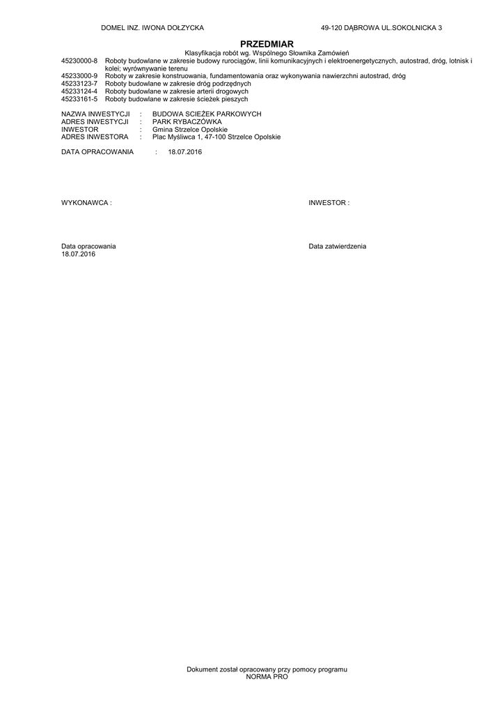 DOMEL INZ. IWONA DOŁZYCKA 49-120 DĄBROWA UL.SOKOLNICKA 3 PRZEDMIAR 45230000-8 45233000-9 45233123-7 45233124-4 45233161-5 Klasyfikacja robót wg. Wspólnego Słownika Zamówień Roboty budowlane w zakresie budowy rurociągów, linii komunikacyjnych i elektroenergetycznych, autostrad, dróg, lotnisk i kolei; wyrównywanie terenu Roboty w zakresie konstruowania, fundamentowania oraz wykonywania nawierzchni autostrad, dróg Roboty budowlane w zakresie dróg podrzędnych Roboty budowlane w zakresie arterii drogowych Roboty budowlane w zakresie ścieżek pieszych NAZWA INWESTYCJI ADRES INWESTYCJI INWESTOR ADRES INWESTORA DATA OPRACOWANIA : : : : BUDOWA SCIEŻEK PARKOWYCH PARK RYBACZÓWKA Gmina Strzelce Opolskie Plac Myśliwca 1, 47-100 Strzelce Opolskie : 18.07.2016 WYKONAWCA : INWESTOR : Data opracowania 18.07.2016 Data zatwierdzenia Dokument został opracowany przy pomocy programu NORMA PRO PRZEDMIAR Załącznik do umowy nr BUDOWA SCIEŻEK PARKOWYCH ........................................................... Lp. Nr Podstawa Opis i wyliczenia spec . tech n. BUDOWA SCIEŻEK PARKOWYCH 1 ROBOTY PRZYGOTOWAWCZE 1.1 ST KNR 2-01 Roboty pomiarowe przy powierzchniowych robotach ziemnych 01.01 0121-02 1 2 2.1 ST KNR 2-31 02.04 0101-01 2.2 ST KNR 2-31 02.04 0101-02 2.3 ST KNR 2-01 02.03 0229-0202 2.4 ST KNR 2-31 02.05 0105-03 2.5 ST KNR 2-31 02.05 0105-04 2.6 ST KNR 2-31 02.06 0114-05 2.7 ST KNR 0-11 02.08 0316-01 2.8 ST KNR 2-31 02.10 0402-04 j.m. 1.000 RAZEM SCIEŻKI O NAWIERZCHNI Z KOSTKI BETONOWEJ: ROBOTY ZIEMNE I NAWIERZCHNIOWE Koryta wykonywane na całej szerokości jezdni i chodników, mechanicznie, m2 grunt kategorii I-IV, na głębokości 20 cm 786 m2 786.000 RAZEM Koryta wykonywane na całej szerokości jezdni i chodników, mechanicznie, m2 grunt kategorii I-IV, dodatek za każde dalsze 5 cm głębokości Krotność = 2 poz.2.1 m2 786.000 RAZEM Przemieszczenie spycharkami mas ziemnych, na odległość do 10 m, m3 grunt kategorii III, spycharka 74 kW (100 KM) poz.2.1*0.2 m3 157.200 RAZEM Warstwy podsypkowe, podsypka piaskowa, zagęszczenie mechaniczne m2 grubość warstwy po zagęszczeniu 3 cm - warstwa gr.5cm poz.2.1 m2 786.000 RAZEM Warstwy podsypkowe, podsypka piaskowa, zagęszczenie mechaniczne m2 dodatek za każdy następny 1 cm grubości warstwy Krotność = 2 poz.2.1 m2 786.000 RAZEM Podbudowy z kruszyw, tłuczeń, warstwa dolna, grubość warstwy po zam2 gęszczeniu 15 cm poz.2.1 m2 786.000 RAZEM Nawierzchnie z kostki betonowej "Polbruk" grubości 80 mm na podsypce m2 piaskowej grubości 50 mm z wypełnieniem spoin piaskiem, typ 10 -analog poz.2.1 m2 786.000 RAZEM Ławy pod krawężniki, betonowa z oporem m3 ha m3 poz.A*0.04 3 3.1 ST KNR 2-31 02.04 0101-01 3.2 ST KNR 2-31 02.04 0101-02 3.3 ST KNR 2-31 02.04 0101-01 3.4 ST KNR 2-31 02.04 0101-02 3.5 ST KNR 2-01 02.03 0229-0202 Razem ha <1> 149.4*2+4.0*3+1.4 <2> 136.9*2+3.6*2+1.6 <3>72.0*2 <4>10.0*2 A (obliczenia pomocnicze) 2.9 ST KNR 2-31 02.10 0403-01 Poszcz. 312.200 282.600 144.000 20.000 ======== 758.800 30.352 RAZEM 1.0 786.0 786.0 157.2 786.0 786.0 786.0 786.0 30.4 Krawężniki betonowe, wystające 15x30 cm na podsypce piaskowej - ana- m log opornik betonowy 10x25x100 poz.2.8A m 758.800 RAZEM ŚCIEŻKI O NAWIERZCHNI MINERALNEJ: ROBOTY ZIEMNE I NAWIERZCHNIOWE Koryta wykonywane na całej szerokości jezdni i chodników, mechanicznie, m2 grunt kategorii I-IV, na głębokości 20 cm 518.5 m2 518.500 RAZEM Koryta wykonywane na całej szerokości jezdni i chodników, mechanicznie, m2 grunt kategorii I-IV, dodatek za każde dalsze 5 cm głębokości poz.3.1 m2 518.500 RAZEM Koryta wykonywane na całej szerokości jezdni i chodników, mechanicznie, m2 grunt kategorii I-IV, na głębokości 20 cm 4123.5 m2 4123.500 RAZEM Koryta wykonywane na całej szerokości jezdni i chodników, mechanicznie, m2 grunt kategorii I-IV, dodatek za każde dalsze 5 cm głębokości Krotność = 2 poz.3.3 m2 4123.500 RAZEM Przemieszczenie spycharkami mas ziemnych, na odległość do 10 m, m3 grunt kategorii III, spycharka 74 kW (100 KM) (poz.3.3)*0.3 m3 1237.050 RAZEM -2- Norma PRO Wersja 4.55 Nr seryjny: 2985 758.8 518.5 518.5 4123.5 4123.5 1237.1 PRZEDMIAR Załącznik do umowy nr BUDOWA SCIEŻEK PARKOWYCH ........................................................... Lp. Nr Podstawa Opis i wyliczenia spec . tech n. 3.6 ST KNR 2-31 Warstwy podsypkowe, podsypka piaskowa, zagęszczenie mechaniczne 02.05 0105-03 grubość warstwy po zagęszczeniu 3 cm - warstwa gr.5cm poz.3.1+poz.3.3 3.7 ST KNR 2-31 02.05 0105-04 3.8 ST KNR 2-31 02.06 0114-05 3.9 ST KNR 2-31 02.06 0114-05 3.10 ST KNR 2-31 02.06 0114-06 3.11 ST KNR 2-31 02.09 0204-05 3.12 ST KNR 2-31 02.09 0204-06 3.13 ST KNR 2-31 02.10 0402-04 3.14 ST KNR 2-31 02.10 0403-01 4 4.1 KNR 2-31 0502-06 j.m. m2 m2 Podbudowy z kruszyw, tłuczeń, warstwa dolna, grubość warstwy po zagęszczeniu 15 cm poz.3.1 m2 Podbudowy z kruszyw, tłuczeń, warstwa dolna, grubość warstwy po zagęszczeniu 15 cm poz.3.3 m2 m2 m2 m2 Podbudowy z kruszyw, tłuczeń, warstwa dolna, dodatek za każdy dalszy 1 m2 cm grubości Krotność = 5 poz.3.3 m2 Nawierzchnie z tłucznia kamiennego, warstwa górna z tłucznia, grubość warstwy po uwałowaniu 7 cm poz.3.1+poz.3.3 m2 Nawierzchnie z tłucznia kamiennego, warstwa górna z tłucznia, dodatek za każdy dalszy 1 cm grubości warstwy poz.3.1+poz.3.3 m2 Ławy pod krawężniki, betonowa z oporem m3 3263*0.2*0.2 m3 m2 m2 Krawężniki betonowe, wystające 15x30 cm na podsypce piaskowej - ana- m log opornik betonowy 10x25x100 3263 m ŚCIEŻKI O NAWIERZCHNI Z PŁYT CHODNIKOWYCH Chodniki z płyt betonowych, 50x50x7 cm na podsypce piaskowej z wypeł- m2 nieniem spoin piaskiem 95 m2 Norma PRO Wersja 4.55 Nr seryjny: 2985 Razem m2 Warstwy podsypkowe, podsypka piaskowa, zagęszczenie mechaniczne dodatek za każdy następny 1 cm grubości warstwy Krotność = 2 poz.3.1+poz.3.3 -3- Poszcz. 4642.000 RAZEM 4642.0 4642.000 RAZEM 4642.0 518.500 RAZEM 518.5 4123.500 RAZEM 4123.5 4123.500 RAZEM 4123.5 4642.000 