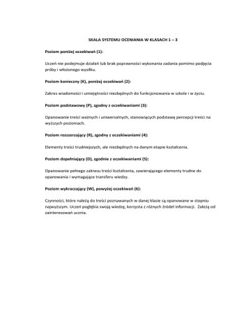 SKALA SYSTEMU OCENIANIA W KLASACH 1 – 3 Poziom poniżej oczekiwań (1): Uczeń nie podejmuje działań lub brak poprawności wykonania zadania pomimo podjęcia próby i włożonego wysiłku. Poziom konieczny (K), poniżej oczekiwań (2): Zakres wiadomości i umiejętności niezbędnych do funkcjonowania w szkole i w życiu. Poziom podstawowy (P), zgodny z oczekiwaniami (3): Opanowanie treści ważnych i uniwersalnych, stanowiących podstawę percepcji treści na wyższych poziomach. Poziom rozszerzający (R), zgodny z oczekiwaniami (4): Elementy treści trudniejszych, ale niezbędnych na danym etapie kształcenia. Poziom dopełniający (D), zgodnie z oczekiwaniami (5): Opanowanie pełnego zakresu treści kształcenia, zawierającego elementy trudne do opanowania i wymagające transferu wiedzy. Poziom wykraczający (W), powyżej oczekiwań (6): Czynności, które należą do treści poznawanych w danej klasie są opanowane w stopniu najwyższym. Uczeń pogłębia swoją wiedzę, korzysta z różnych źródeł informacji. Zależą od zainteresowań ucznia. KRYTERIA WYMAGAŃ EDUKACYJNYCH W KLASIE I. EDUKACJA POLONISTYCZNA 1. Słuchanie i rozumienie. . a) poziom wymagań konieczny (2) - Potrafi powtórzyć za nauczycielem. Ma trudności ze skupieniem uwagi. b) poziom wymagań podstawowy(3) - Rozumie ogólny sens wypowiedzi. Potrafi wyróżnić proste informacje z tekstu mówionego. c) poziom wymagań rozszerzający (4) - Słuchając, potrafi wydobyć i zrozumieć kluczowe informacje w słuchanym tekście. d) poziom wymagań dopełniający(5) - Uważnie słucha, rozumie pełny sens tekstu i wypełnia prawidłowo polecenia. e) poziom wymagań wykraczający (6) - Potrafi wyciągnąć wnioski po wysłuchaniu wypowiedzi ustnej. 2.ZASÓB SŁOWNICTWA I STRUKTURA WYPOWIEDZI . a) poziom wymagań konieczny (2) - Wypowiada się najchętniej pojedynczymi wyrazami lub prostymi zdaniami, nie zawsze poprawnie pod względem gramatycznym i logicznym. b) poziom wymagań podstawowy (3) - Częściej odpowiada pojedynczymi wyrazami na pytania niż prostymi zdaniami. Chętnie uczestniczy w swobodnej rozmowie z nauczycielem i kolegami. c) poziom wymagań rozszerzający (4) - Wypowiada się pojedynczymi zdaniami na tematy bliskie. Trafnie i poprawnie odpowiada na pytania nauczyciela. d) poziom wymagań dopełniający (5) - Wypowiada się swobodnie na tematy bliskie. Wypowiedzi są logiczne, poprawne pod względem gramatycznym i składniowym. e) poziom wymagań wykraczający (6) - Wypowiada się pełnymi zdaniami na różne tematy. Posiada bogaty zasób słownictwa. W wypowiedziach dokonuje oceny i porównań. Potrafi uzasadnić swoje argumenty. 3. TECHNIKA CZYTANIA a) poziom wymagań konieczny (2) - Czyta bardzo wolno metodą głoskową, czasami sylabami. Dokonuje analizy bez syntezy trudniejszych wyrazów. Czyta tylko proste wyrazy. Popełnia liczne błędy podczas czytania. Nie rozumie sensu odczytywanych wyrazów i zdań. b) poziom wymagań podstawowy (3) - Czyta poprawnie, wolno dokonując syntezy wyrazów. Nowy tekst czyta głoskami lub sylabami. (Koncentracja na technicznej stronie czytania utrudnia rozumienie tekstu). c) poziom wymagań rozszerzający(4) Czyta poprawnie i płynnie w tempie odpowiadającym możliwościom dziecka. (Rozumie czytany głośno tekst. Trudności występują przy tekstach zawierających nowe trudne wyrazy.) d) poziom wymagań dopełniający (5) - Opracowany tekst czyta poprawnie, płynnie i biegle. (Rozumie tekst po jednorazowym głośnym odczytaniu.) e poziom wymagań wykraczający (6) - Czyta poprawnie, płynnie i biegle teksty pisane i drukowane znane i nowo poznane. Opracowany tekst czyta wyraziście. (W pełni rozumie czytany tekst). 4. CZYTANIE ZE ZROZUMIENIEM a)poziom wymagań konieczny (2) - Ma poważne problemy w czytaniu ze zrozumieniem trudniejszych wyrazów, zdań, fragmentów tekstu. W zadaniach sprawdzających popełnia dużo błędów. b poziom wymagań podstawowy (3) - Ma trudności w czytaniu ze zrozumieniem wyrazów, zdań, krótkich tekstów informacyjnych. Rozumie tylko niektóre pojęcia, zdania, fragmenty tekstów. c) poziom wymagań rozszerzający (4) - Dobrze czyta i rozumie wyrazy, zdania i krótkie teksty. Popełnia nieliczne błędy w zadaniach sprawdzających. d) poziom wymagań rozwijający (5) - Bardzo dobrze czyta po cichu wyrazy, zdania i krótkie teksty. Rozumie ich treść. Rozwiązywanie zadań sprawdzających nie sprawia większych trudności. Wyróżnia wydarzenia i ustala ich kolejność. e) poziom wymagań wykraczający (6) - Wzorowo czyta po cichu wyrazy, zdania, krótkie teksty. Rozumie pojęcia. Bezbłędnie rozwiązuje zadania. Ustala kolejność zdarzeń i wiąże treść czytanych tekstów z ilustracjami. 5. TECHNIKA PISANIA . a)poziom wymagań konieczny (2) - Ma problem z zapamiętaniem kształtu liter oraz przepisywaniem. Myli litery i nieprawidłowo je łączy. Przepisuje po literze, odwzorowuje. Mała precyzja ruchów. Pismo drżące i rozchwiane. b) poziom wymagań podstawowy (3) - Odwzorowuje poprawnie. Utrzymuje się w liniaturze, zapamiętuje i poprawnie zapisuje pojedyncze wyrazy. Popełnia liczne błędy. Pismo nie zawsze jest proporcjonalne. Ma kłopoty z łączeniem liter oraz z rozplanowaniem tekstu na stronicy. c) poziom wymagań rozszerzający (4) - Poprawnie odtwarza kształt liter. Pisze kształtnie, utrzymuje się w liniaturze. Prawidłowo łączy litery. Pismo jest proporcjonalne. Litery choć są połączone, pisane są impulsami. Zapamiętuje i zapisuje krótkie zdania. Popełnia błędy. Prawidłowo rozmieszcza tekst na stronicy. d) poziom wymagań dopełniający (5) - Pisze płynnie krótkie wyrazy zgodnie z kryteriami poprawności pisma. Przestrzega zasad kaligrafii. e) poziom wymagań wykraczający (6) - Zachowuje właściwy kształt, proporcję, łączenia i pochyłości liter. Pisze płynnie i bardzo estetycznie. 6. TWORZENIE TEKSTÓW a)poziom wymagań konieczny(2) - Redaguje krótkie chaotyczne zdania. Popeł