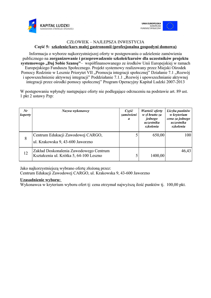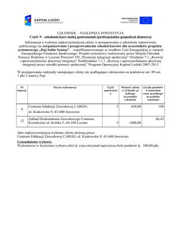 CZŁOWIEK – NAJLEPSZA INWESTYCJA Część 5: szkolenie/kurs małej gastronomii (profesjonalna gospodyni domowa) Informacja o wyborze najkorzystniejszej oferty w postępowaniu o udzielenie zamówienia publicznego na zorganizowanie i przeprowadzenie szkoleń/kursów dla uczestników projektu systemowego „Daj Sobie Szansę”– współfinansowanego ze środków Unii Europejskiej w ramach Europejskiego Funduszu Społecznego. Projekt systemowy realizowany przez Miejski Ośrodek Pomocy Rodzinie w Lesznie Priorytet VII „Promocja integracji społecznej” Działanie 7.1 „Rozwój i upowszechnienie aktywnej integracji” Poddziałanie 7.1.1 „Rozwój i upowszechnianie aktywnej integracji przez ośrodki pomocy społecznej” Program Operacyjny Kapitał Ludzki 2007-2013 W postępowaniu wpłynęły następujące oferty nie podlegające odrzuceniu na podstawie art. 89 ust. 1 pkt 2 ustawy Pzp: Nr koperty 8 12 Nazwa wykonawcy Centrum Edukacji Zawodowej CARGO, Część zamówieni a Wartość oferty w zł brutto za jednego uczestnika szkolenia 5 650,00 5 1400,00 Liczba punktów w kryterium cena za jednego uczestnika szkolenia 100 ul. Krakowska 9, 43-600 Jaworzno Zakład Doskonalenia Zawodowego Centrum Kształcenia ul. Krótka 5, 64-100 Leszno 46,43 Jako najkorzystniejszą wybrano ofertę złożoną przez: Centrum Edukacji Zawodowej CARGO, ul. Krakowska 9, 43-600 Jaworzno Uzasadnienie wyboru: Wykonawca w kryterium wyboru ofert tj: cena otrzymał najwyższą ilość punktów tj. 100,00 pkt. CZŁOWIEK – NAJLEPSZA INWESTYCJA Część 5: szkolenie/kurs małej gastronomii (profesjonalna gospodyni domowa) Miejski Ośrodek Pomocy Rodzinie w Lesznie zawiadamia, że w postępowaniu o udzielenie zamówienia publicznego prowadzonego w trybie przetargu nieograniczonego na zorganizowanie i przeprowadzenie szkoleń/kursów dla uczestników projektu systemowego „Daj Sobie Szansę”– współfinansowanego ze środków Unii Europejskiej w ramach Europejskiego Funduszu Społecznego. Projekt systemowy realizowany przez Miejski Ośrodek Pomocy Rodzinie w Lesznie Priorytet VII „Promocja integracji społecznej” Działanie 7.1 „Rozwój i upowszechnienie aktywnej integracji” Poddziałanie 7.1.1 „Rozwój i upowszechnianie aktywnej integracji przez ośrodki pomocy społecznej” Program Operacyjny Kapitał Ludzki 2007-2013 wpłynęły następujące oferty podlegające odrzuceniu na podstawie art. 89 ust. 1 pkt 2 ustawy Prawo zamówień publicznych: Nr koperty Nazwa wykonawcy Centrum Doradztwa-ReklamySzkoleń CDRS.PL ul. Dworcowa16/6, 72-300 Gryfice 10 Część zamówienia Prawne i faktyczne uzasadnienie odrzucenia oferty Wykonawca nie złożył polisy ubezpieczeniowe od odpowiedzialności cywilnej w zakresie prowadzonej działalność zgodnej z przedmiotem zamówienia na kwotę co najmniej równą ofertowej netto art. 89 ust. 1 pkt. 2 ustawy Prawo 5 zamówień publicznych