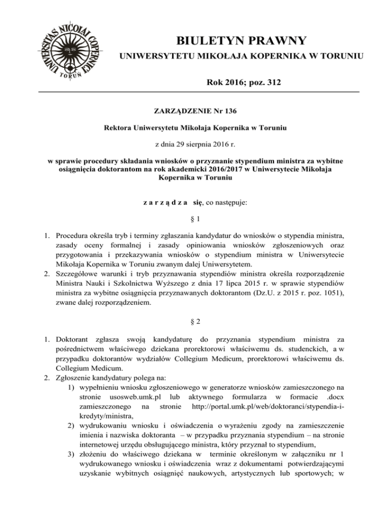 BIULETYN PRAWNY UNIWERSYTETU MIKOŁAJA KOPERNIKA W TORUNIU Rok 2016; poz. 312 ZARZĄDZENIE Nr 136 Rektora Uniwersytetu Mikołaja Kopernika w Toruniu z dnia 29 sierpnia 2016 r. w sprawie procedury składania wniosków o przyznanie stypendium ministra za wybitne osiągnięcia doktorantom na rok akademicki 2016/2017 w Uniwersytecie Mikołaja Kopernika w Toruniu z a r z ą d z a się, co następuje: §1 1. Procedura określa tryb i terminy zgłaszania kandydatur do wniosków o stypendia ministra, zasady oceny formalnej i zasady opiniowania wniosków zgłoszeniowych oraz przygotowania i przekazywania wniosków o stypendium ministra w Uniwersytecie Mikołaja Kopernika w Toruniu zwanym dalej Uniwersytetem. 2. Szczegółowe warunki i tryb przyznawania stypendiów ministra określa rozporządzenie Ministra Nauki i Szkolnictwa Wyższego z dnia 17 lipca 2015 r. w sprawie stypendiów ministra za wybitne osiągnięcia przyznawanych doktorantom (Dz.U. z 2015 r. poz. 1051), zwane dalej rozporządzeniem. §2 1. Doktorant zgłasza swoją kandydaturę do przyznania stypendium ministra za pośrednictwem właściwego dziekana prorektorowi właściwemu ds. studenckich, a w przypadku doktorantów wydziałów Collegium Medicum, prorektorowi właściwemu ds. Collegium Medicum. 2. Zgłoszenie kandydatury polega na: 1) wypełnieniu wniosku zgłoszeniowego w generatorze wniosków zamieszczonego na stronie usosweb.umk.pl lub aktywnego formularza w formacie .docx zamieszczonego na stronie http://portal.umk.pl/web/doktoranci/stypendia-ikredyty/ministra, 2) wydrukowaniu wniosku i oświadczenia o wyrażeniu zgody na zamieszczenie imienia i nazwiska doktoranta – w przypadku przyznania stypendium – na stronie internetowej urzędu obsługującego ministra, który przyznał to stypendium, 3) złożeniu do właściwego dziekana w terminie określonym w załączniku nr 1 wydrukowanego wniosku i oświadczenia wraz z dokumentami potwierdzającymi uzyskanie wybitnych osiągnięć naukowych, artystycznych lub sportowych; w przypadku wniosku wypełnianego w formacie .docx doktorant zobowiązany jest do złożenia wersji papierowej i elektronicznej. 3. Doktorant może przedstawić swoją kandydaturę do stypendium na każdym z kierunków, na którym studiuje, przy czym dla każdego kierunku należy przedstawić odrębne zgłoszenie. 4. We wniosku zgłoszeniowym doktorant powinien przestawić wyłącznie osiągnięcia, o których mowa w rozporządzeniu, związane ze studiami, na których ubiega się o stypendium, nie powinien przedstawiać osiągnięć związanych z realizacją zainteresowań, hobby, studiów równoległych lub poprzednio ukończonych, jak również osiągnięć związanych z pracą zawodową. 5. Wniosek powinien być wypełniony zgodnie ze wskazówkami dotyczącymi wypełniania wniosków o stypendia ministra za wybitne osiągnięcia dla doktorantów na rok akademicki 2016/2017 określonymi w załączniku nr 2. §3 1. Dziekan ocenia wnioski zgłoszeniowe pod względem formalnym. Ocena formalna polega na wypełnieniu karty oceny wniosku zgłoszeniowego doktoranta. Wzór karty oceny określa załącznik nr 3. 2. Do oceny wniosków zgłoszeniowych, o której mowa w ust. 1, dziekan może powołać komisję. 3. Oceniony wniosek zgłoszeniowy dziekan przedstawia do zaopiniowania radzie wydziału. 4. Rada wydziału może zaopiniować negatywnie wniosek, jeżeli doktorant przedstawił w nim osiągnięcia, które nie są wybitnymi osiągnięciami lub nie są związane z danym kierunkiem studiów. 5. Na podstawie wniosku zgłoszeniowego doktoranta przygotowywany jest wniosek o przyznanie stypendium ministra doktorantowi za wybitne osiągnięcia na rok akademicki 2016/2017. 6. We wniosku o przyznanie stypendium ministra nie uwzględnia się osiągnięć, które: 1) nie zostały właściwie udokumentowane przez doktoranta, 2) nie są wybitnymi osiągnięciami, 3) nie są związane ze studiami, na których doktorant ubiega się o stypendium. 7. Dziekan informuje doktoranta, o nieuwzględnieniu we wniosku o przyznanie stypendium ministra osiągnięć, o których mowa w ust. 6. 8. Dziekan w terminie do 7 października 2016 r. przekazuje odpowiednio do prorektora właściwego ds. studenckich za pośrednictwem Działu Rekrutacji i Spraw Studenckich lub prorektora właściwego ds. Collegium Medicum za pośrednictwem Działu Dydaktyki CM: 1) wnioski zgłoszeniowe doktorantów wraz z dokumentami potwierdzającymi uzyskanie wybitnych osiągnięć naukowych, artystycznych lub sportowych, 2) karty oceny formalnej wniosków, 3) oświadczenia o wyrażeniu zgody na zamieszczenie imienia i nazwiska doktoranta – w przypadku przyznania stypendium – na stronie internetowej urzędu obsługującego ministra, który przyznał to stypendium, 4) zaopiniowane wnioski o przyznanie stypendium ministra doktorantowi za wybitne osiągnięcia na rok akademicki 2016/2017. 2 §4 Prorektor właściwy ds. studenckich i prorektor właściwy ds. Collegium Medicum przekazują Ministrowi Nauki i Szkolnictwa Wyższego pozytywnie zaopiniowane wnioski o przyznanie stypendium ministra w terminie do 15 października 2016 r. §5 1. Dokumenty, o których mowa w § 3 ust. 8 pkt 1 i 2, przechowywane są odpowiednio w Dziale Rekrutacji i Spraw Studenckich i w Dziale Dydaktyki CM. 2. Decyzje o przyznaniu stypendium ministra Dział Rekrutacji i Spraw Studenckich lub Dział Dydaktyki CM wprowadzają do USOS. §6 1. Doktorant, któremu przyznano stypendium ministra za wybitne osiągnięcia, zobowiązany jest do złożenia w dziekanacie oświadczenia o spełnieniu warunków do jego otrzymywania. 2. Po złożeniu oświadczeń przez stypendystów dziekanaty przygotowują listy stypendialne. 3. Informacja o uzyskanych przez doktorantów stypendiach przekazywana jest do sytemu POL-on. §7 Zarządzenie wchodzi w życie z dniem 29 sierpnia 2016 r. REKTOR prof. dr hab. Andrzej Tretyn 3
