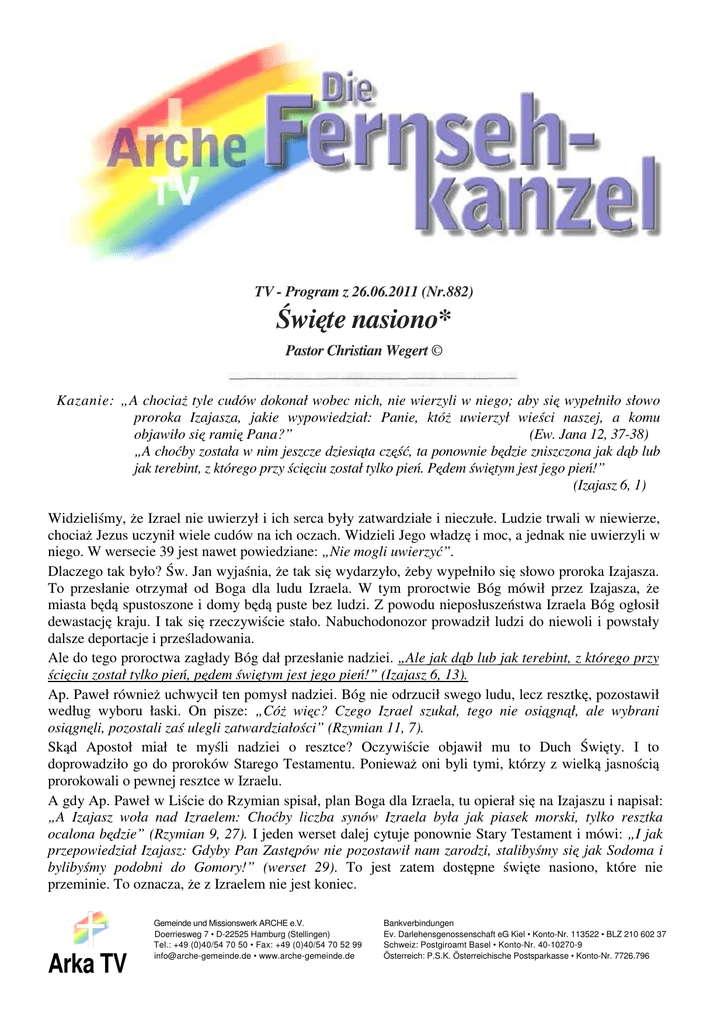 TV - Program z 26.06.2011 (Nr.882) Święte nasiono* Pastor Christian Wegert © Kazanie: „A chociaż tyle cudów dokonał wobec nich, nie wierzyli w niego; aby się wypełniło słowo proroka Izajasza, jakie wypowiedział: Panie, któż uwierzył wieści naszej, a komu objawiło się ramię Pana?” (Ew. Jana 12, 37-38) „A choćby została w nim jeszcze dziesiąta część, ta ponownie będzie zniszczona jak dąb lub jak terebint, z którego przy ścięciu został tylko pień. Pędem świętym jest jego pień!” (Izajasz 6, 1) Widzieliśmy, że Izrael nie uwierzył i ich serca były zatwardziałe i nieczułe. Ludzie trwali w niewierze, chociaż Jezus uczynił wiele cudów na ich oczach. Widzieli Jego władzę i moc, a jednak nie uwierzyli w niego. W wersecie 39 jest nawet powiedziane: „Nie mogli uwierzyć”. Dlaczego tak było? Św. Jan wyjaśnia, że tak się wydarzyło, żeby wypełniło się słowo proroka Izajasza. To przesłanie otrzymał od Boga dla ludu Izraela. W tym proroctwie Bóg mówił przez Izajasza, że miasta będą spustoszone i domy będą puste bez ludzi. Z powodu nieposłuszeństwa Izraela Bóg ogłosił dewastację kraju. I tak się rzeczywiście stało. Nabuchodonozor prowadził ludzi do niewoli i powstały dalsze deportacje i prześladowania. Ale do tego proroctwa zagłady Bóg dał przesłanie nadziei. „Ale jak dąb lub jak terebint, z którego przy ścięciu został tylko pień, pędem świętym jest jego pień!” (Izajasz 6, 13). Ap. Paweł również uchwycił ten pomysł nadziei. Bóg nie odrzucił swego ludu, lecz resztkę, pozostawił według wyboru łaski. On pisze: „Cóż więc? Czego Izrael szukał, tego nie osiągnął, ale wybrani osiągnęli, pozostali zaś ulegli zatwardziałości” (Rzymian 11, 7). Skąd Apostoł miał te myśli nadziei o resztce? Oczywiście objawił mu to Duch Święty. I to doprowadziło go do proroków Starego Testamentu. Ponieważ oni byli tymi, którzy z wielką jasnością prorokowali o pewnej resztce w Izraelu. A gdy Ap. Paweł w Liście do Rzymian spisał, plan Boga dla Izraela, tu opierał się na Izajaszu i napisał: „A Izajasz woła nad Izraelem: Choćby liczba synów Izraela była jak piasek morski, tylko resztka ocalona będzie” (Rzymian 9, 27). I jeden werset dalej cytuje ponownie Stary Testament i mówi: „I jak przepowiedział Izajasz: Gdyby Pan Zastępów nie pozostawił nam zarodzi, stalibyśmy się jak Sodoma i bylibyśmy podobni do Gomory!” (werset 29). To jest zatem dostępne święte nasiono, które nie przeminie. To oznacza, że z Izraelem nie jest koniec. Arka TV Gemeinde und Missionswerk ARCHE e.V. Doerriesweg 7 • D-22525 Hamburg (Stellingen) Tel.: +49 (0)40/54 70 50 • Fax: +49 (0)40/54 70 52 99 [email protected] • www.arche-gemeinde.de Bankverbindungen Ev. Darlehensgenossenschaft eG Kiel • Konto-Nr. 113522 • BLZ 210 602 37 Schweiz: Postgiroamt Basel • Konto-Nr. 40-10270-9 Österreich: P.S.K. Österreichische Postsparkasse • Konto-Nr. 7726.796 Strona 2 - TV-Program 882 / „Święte nasiono” Ten Boży plan zbawienia miał w sercu przed Ap. Pawłem również Św. Jan i dlatego odnosi się do Izajasza w kwestii niewiary Izraela. Pisze on: „To powiedział Izajasz, gdyż ujrzał chwalę jego i mówił o nim” (Ew. Jana 12, 41). Izajasz mówi o znieczuleniu i głuchocie Izraela i o jego spustoszeniu (Izajasz 6, 10-12). A w wersecie 13 prorok dochodzi do punktu, poprzez to ogłosił: „A choćby została w nim jeszcze dziesiąta część, ta ponownie będzie zniszczona jak dąb lub jak terebint, którego przy ścięciu został tylko pień. Pędem świętym jest jego pień!” To jest to, na co wskazuje Św. Jan. Zarówno Św. Jan jak i Ap. Paweł i również Izajasz mieli to samo przesłanie. Wszyscy trzej mówią nam równomiernie o Bożym niezgłębionym planie zbawienia Izraela ze względu na zasłonę, którą miał przed oczami i nie wierzył. W ten sposób zbawienie przyszło do narodów, ale w Izraelu pozostaje jednakże resztka, do końca, kiedy czas narodów skończy się, cały Izrael będzie zbawiony. Nad tym świętym nasionem warto się zastanowić: Święte nasiono w Izraelu Chociaż Izrael został odcięty z powodu swej niewiary jak dąb i tarebit i stracił wszystkie swoje liście i też całą koronę, jednak naród nie jest zniszczony. Pień, kikut, korzeń pozostał, i ten pozostanie na zawsze. Również jeśli naród Żydowski odrzuca Chrystusa, Mesjasza Bożego jest on aż do dnia dzisiejszego świętym nasionem w tym narodzie! Izrael ma za sobą burzliwą historię. Podnosił się i wiele razy upadał w dół, on został wybrany a jednak zepsuty. Odrzucił swojego Mesjasza i był rozproszony na cztery wiatry. Cierpiał prześladowania i morderczy Holocaust. I myślano, że los tego narodu zostanie przypieczętowany na zawsze. Ubolewało się z powodu świętego drzewa. Był widoczny tylko pień. Ale zapomnieli o proroctwie Izajasza, słowach Jana i nauczaniu Ap. Pawła. Zapomnieli, że w tym pniu ukryte jest święte nasiono i resztka według wyboru łaski. Jeżeli też inni ludzie ulegli zagładzie i będą ginąć, to jednak naród żydowski nadal będzie istniał. Ponieważ ma w sobie Boski rdzeń, obietnicę i niezniszczalne nasiono. Tym ziarnem są nowonarodzeni w Izraelu. Również jeśli odwrócili się od swojego Mesjasza, tak nie było przecież w żadnym czasie bez nowonarodzenia dusz. Nie było ani jednej godziny, w której nie było Żydów, których Jezus kochał. Prawdziwymi dziećmi Abrahama są ci, którzy są z wiary i ci pozostaną w Izraelu i nigdy nie wymrą. To święte nasiono jest coraz silniejsze i wkrótce Jezus przyjdzie ponownie a cały Izrael będzie Go widział i oni będą Go kochać i czcić. Bóg nie odrzucił swojego ludu, i Jego powołania nie żałował. Mimo, że Izrael może zewnętrznie przypomina pień drzewa, ma jednak w sobie święte życie. I to aż do wieczności tak pozostanie. Święte nasiono w kościele Te