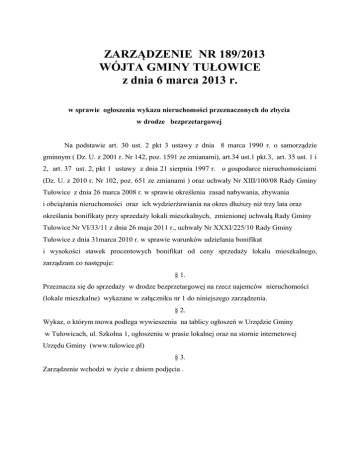 ZARZĄDZENIE NR 189/2013 WÓJTA GMINY TUŁOWICE z dnia 6 marca 2013 r. w sprawie ogłoszenia wykazu nieruchomości przeznaczonych do zbycia w drodze bezprzetargowej Na podstawie art. 30 ust. 2 pkt 3 ustawy z dnia 8 marca 1990 r. o samorządzie gminnym ( Dz. U. z 2001 r. Nr 142, poz. 1591 ze zmianami), art.34 ust.1 pkt.3, art. 35 ust. 1 i 2, art. 37 ust. 2, pkt 1 ustawy z dnia 21 sierpnia 1997 r. o gospodarce nieruchomościami (Dz. U. z 2010 r. Nr 102, poz. 651 ze zmianami ) oraz uchwały Nr XIII/100/08 Rady Gminy Tułowice z dnia 26 marca 2008 r. w sprawie określenia zasad nabywania, zbywania i obciążania nieruchomości oraz ich wydzierżawiania na okres dłuższy niż trzy lata oraz określania bonifikaty przy sprzedaży lokali mieszkalnych, zmienionej uchwałą Rady Gminy Tułowice Nr VI/33/11 z dnia 26 maja 2011 r., uchwały Nr XXXI/225/10 Rady Gminy Tułowice z dnia 31marca 2010 r. w sprawie warunków udzielania bonifikat i wysokości stawek procentowych bonifikat od ceny sprzedaży lokalu mieszkalnego, zarządzam co następuje: § 1. Przeznacza się do sprzedaży w drodze bezprzetargowej na rzecz najemców nieruchomości (lokale mieszkalne) wykazane w załączniku nr 1 do niniejszego zarządzenia. § 2. Wykaz, o którym mowa podlega wywieszeniu na tablicy ogłoszeń w Urzędzie Gminy w Tułowicach, ul. Szkolna 1, ogłoszeniu w prasie lokalnej oraz na stornie internetowej Urzędu Gminy (www.tulowice.pl) § 3. Zarządzenie wchodzi w życie z dniem podjęcia . 2 Załącznik Nr 1 do Zarządzenia Wójta Gminy Tułowice Nr 189/2013 z dn. 06.03.2013r. Wykaz nieruchomości stanowiących mienie Gminy Tułowice przeznaczonych do sprzedaży bezprzetargowej. LP. NUMER DZIAŁJKI POW. DZIAŁKI POŁOŻENIE OPIS /PLAN ZAGOSP. PRZEST./ CENA/ZŁ/ Lokal mieszkalny 1. 666/5 k.m.2 OP1O/0011 3581/6 2. 643 k.m.2 OP1O/0007 3802/9 3. 490/11 k.m.2 OP1O/0008 6997/6 0,0718ha 0,1105ha 0,3055ha Tułowice ul. Kościuszki 2/8 teren przeznaczony pod budown. wielorodz. 42 012,00 zł. (grunt 5 210 zł lokal 36 802 zł.) Tułowice ul. Kościuszki 7/4 Lokal mieszkalny teren przeznaczony pod budown. wielorodz. 43 644,00 zł. (grunt 15 607 zł lokal 28 607 zł.) Tułowice Ul. Elsnera 5A/4 Lokal mieszkalny teren przeznaczony pod budown. wielorodz. 95 556,00 zł. (grunt 3 848 zł lokal 91 718 zł.) 3 1. Lokal mieszkalny o powierzchni użytkowej 54,35 m2 zlokalizowany na działce nr 666/5, k. m. 2 w Tułowicach wraz z udziałem we współwłasności części wspólnych budynku mieszkalnego i udziałem w prawie własności gruntu. Lokal mieszkalny położony jest na parterze budynku , składa się z 2 pokoi, kuchni, łazienki i przedpokoju . 2. Lokal mieszkalny o powierzchni użytkowej 56,46m2 zlokalizowany na działce nr 558/1, k. m. 2 w Tułowicach wraz z pomieszczeniami przynależnymi oraz udziałem we współwłasności części wspólnych budynku mieszkalnego i udziałem w prawie własności gruntu. Lokal mieszkalny położony jest na I piętrze budynku , składa się z 2 pokoi, kuchni, łazienki. Pomieszczenie przynależne to komórka o powierzchni 5,85m2 oraz piwnica o powierzchni 3,84m2 3. Lokal mieszkalny o powierzchni użytkowej 60,40 m2 zlokalizowany na działce nr 490/11, k. m. 2 w Tułowicach wraz z pomieszczeniami przynależnymi oraz udziałem we współwłasności części wspólnych budynku mieszkalnego i udziałem w prawie własności gruntu. Lokal mieszkalny położony jest na I piętrze budynku , składa się z 3 pokoi, kuchni, łazienki i przedpokoju. Pomieszczenie przynależne to piwnica o powierzchni 2,70m2 . Dla osób, o których mowa w art. 34 ust. 1 pkt. 1 i 2 ustawy z dnia 21 sierpnia 1997 r. o gospodarce nieruchomościami / Dz. U. Nr 102 z 2010 r. , poz. 651 ze zm./ ustala się termin do składania wniosków dotyczących pierwszeństwa w nabyciu, do dnia 17.04. 2013 r.
