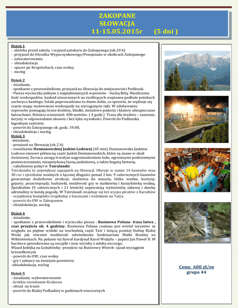 WYCIECZKA DO PARYŻA 6 dni ZAKOPANE SŁOWACJA 11-15.05.2015r (5 dni ) Dzień 1 - zbiórka przed szkołą i wyjazd autokaru do Zakopanego (ok.10 h) - przyjazd do Ośrodka Wypoczynkowego/Pensjonatu w okolicach Zakopanego - zakwaterowanie, - obiadokolacja - spacer po Krupówkach, czas wolny, - nocleg Dzień 2 - śniadanie, - spotkanie z przewodnikiem, przejazd na Słowację do miejscowości Podlesok. - Piesza wycieczka jednym z najpiękniejszych wąwozów - Suchą Belą. Niezliczona ilość wodospadów, kaskad utworzonych na rzeźbiących wapienne podłoże potokach zachwyca każdego. Szlaki poprowadzono tu dnem dolin, co sprawia, że wędruje się często mając malownicze wodospady na wyciągnięcie ręki. W zdobywaniu wąwozów pomagają liczne drabiny, kładki, metalowe podesty i klamry ubezpieczane łańcuchami. Różnica wzniesień: 400 metrów. ( 4 godz.) Trasa dla średnio – zaawans. turysty w odpowiednim obuwiu i bez lęku wysokości. Powrót do Podlesoka łagodnym zejściem. - powrót do Zakopanego ok. godz. 19.00, - obiadokolacja i nocleg Dzień 3 -śniadanie, - przejazd na Słowację (ok.2 h) - zwiedzanie Demianowskiej Jaskini Lodowej (45 min) Demianowska Jaskinia Lodowa stanowi północną część Jaskiń Demianowskich, które są znane w skali światowej. Zwraca uwagę trwałym nagromadzeniem lodu, ogromnymi podziemnymi pomieszczeniami, niespotykaną fauną jaskiniową, a także bogatą historią. - całodniowy pobyt w Tatralandii. Tatralandia to największy aquapark na Słowacji. Oferuje w sumie 14 basenów oraz 30 rur i zjeżdżalni wodnych o łącznej długości ponad 2 km. 9 całorocznych basenów gwarantuje dodatkowe atrakcje: siedzenia do masażu, łóżka wodne, kurtyny, gejzery, przeciwprądy, huśtawki, możliwość gry w siatkówkę i koszykówkę wodną. Zjeżdżalnie (9 całorocznych i 21 letnich) zapewniają wyśmienitą zabawę i dawkę adrenaliny w każdą pogodę. W Tatralandi znajduje się też wyspa piratów z Karaibów - wyjątkowy kompleks tropikalny z basenami i widokiem na Tatry. - powrót do OW w Zakopanem - obiadokolacja, nocleg Dzień 4 - śniadanie, - spotkanie z przewodnikiem i wycieczka piesza : Rusinowa Polana- trasa łatwa , czas przejścia ok. 4 godziny. Rusinowa Polana ceniona jest wśród turystów ze względu na piękne widoki na wschodnią część Tatr i leżącą poniżej Dolinę Białej Wody jak również możliwość odwiedzenia Sanktuarium Matki Boskiej na Wiktorówkach. Na polanie tej bywał kardynał Karol Wojtyła – papież Jan Paweł II. W bacówce sprzedawane są oscypki i inne wyroby z mleka owczego. Wjazd kolejką na Gubałówkę- przejście na Butorowy Wierch- zjazd wyciągiem krzesełkowym - powrót do OW, czas wolny - gry i zabawy na świeżym powietrzu -obiadokolacja, nocleg Dzień 5 - śniadanie, wykwaterowanie - krótkie zwiedzanie Krakowa - obiad na trasie - powrót do Białej Podlaskiej w godzinach wieczornych Cena: 600 zł/os grupa 44