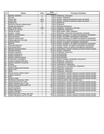 L.P. 1. 2. 3. 4. 5. 6. 7. 8. 9. 10. 11. 12. 13. 14. 15. 16. 17. 18. 19. 20. 21. 22. 23. 24. 25. 26. 27. 28. 29. 30. 31. 32. 33. 34. 35. 36. 37. 38. 39. 40. 41. 42. 43. 44. 45. 46. 47. Nazwa Szkielet człowieka Ufo-JeŜ Hantle 3kg Hantle 5kg Ślizgownica Rynna do ćwiczeń oddechowych DrąŜek gimnastyczny WąŜ Troflex 25mb Drabinki do ćwiczeń Wózek do węŜa Krzesło - orzech Materac rehabilitacyjny Koło ratunkowe Materac asekuracyjny Radiomagnetofon Grundig Korektor skolioz Materac Pasy gimnastyczne Gryf prosty165cm Mikrofon bezprzewodowy Kozetka lekarska Szkielet człowieka Kaseta metalowa C Kaseta metalowa D Kaseta metalowa średnia Kontenerek z szufladami Ławka ze ścianką (dla rodz) Ławka z deskami na oparcie Krzesło Fotel 02/04 Szafka stojąca pod komputer Stolik 01/01 Stolik Router asmax modem switch Zasilacz awaryjny HDD Rzutnik magic Wykładzina dywanowa 120m Aparat Pansonic KX T 500 Aparat Panasonic KX-T 1001 Aparat Cyfrowy ISDN EURIT 22 Drukarka Brother Stacja pogodowa Telefon Panasonic Gaśnica GP-6kg Radiomagnetofon Philips AW-7520 Telefon Panasonic KX-TS 3 PDW Ilość 2 2 para para 2 2 2 rolka 2 1 16 1 1 1 1 1 2 1 1 1 1 1 1 1 1 1 1 3 1 2 1 1 1 1 1 1 1 1 1 1 1 1 1 1 1 1 1 Cena jednostkowa 10,00 zł 3,00 zł 5,00 zł 5,00 zł 2,00 zł 2,00 zł 9,00 zł 10,00 zł 8,00 zł 5,00 zł 2,00 zł 10,00 zł 9,00 zł 10,00 zł 30,00 zł 15,00 zł 10,00 zł 5,00 zł 5,00 zł 50,00 zł 10,00 zł 10,00 zł 2,00 zł 2,00 zł 2,00 zł 10,00 zł 8,00 zł 6,00 zł 12,00 zł 9,00 zł 8,00 zł 5,00 zł 4,00 zł 13,00 zł 10,00 zł 17,00 zł 15,00 zł 30,00 zł 15,00 zł 15,00 zł 22,00 zł 20,00 zł 11,00 zł 15,00 zł 4,00 zł 20,00 zł 15,00 zł Przyczyna likwidacji Połamany, zniszczony ZuŜyty, niesprawny ZuŜyte, niesprawne,połamane,sypie się piasek ZuŜyte, niesprawne,połamane,sypie się piasek Połamana Połamane Pęknięty,uszkodzony Popękany, niesprawny, dziurawy Połamana, zniszczona Brak korbki i kółek, popękany Połamane, zniszczone, bez tapicerki, zbutwiałe ZuŜyte, potargany, nie spełnia wymaganych standardów ZuŜyte, nie spełnia wymaganych standardów ZuŜyte, potargany, nie spełnia wymaganych standardów Uszkodzony, wartość naprawy przerasta wartość sprzętu ZuŜyte, nie spełnia wymaganych standardów ZuŜyte, potargany, nie spełnia wymaganych standardów ZuŜyte, podarte, nie spełnia wymaganych standardów Pogięty, zuŜyty, nie spełnia wymaganych standardów Uszkodzony, wartość naprawy przerasta wartość sprzętu ZuŜyta, niesprawna Połamany, zniszczony przerdzewiała przerdzewiała przerdzewiała ZuŜyte, szuflady i prowadnice zniszczone, Połamana, zniszczona Połamana, zniszczona Uszkodzone, niesprawne Uszkodzony, brak tapicerki, niesprawne Połamana, zniszczona Połamany, zniszczony Połamany, zniszczony Uszkodzony, wartość naprawy przerasta wartość sprzętu Uszkodzony, wartość naprawy przerasta wartość sprzętu Uszkodzony, wartość naprawy przerasta wartość sprzętu Uszkodzony, wartość naprawy przerasta wartość sprzętu ZuŜyte, poadrta, zalana, poplamiona Uszkodzony, wartość naprawy przerasta wartość sprzętu Uszkodzony, wartość naprawy przerasta wartość sprzętu Uszkodzony, wartość naprawy przerasta wartość sprzętu Uszkodzony, wartość naprawy przerasta wartość sprzętu Uszkodzony, wartość naprawy przerasta wartość sprzętu Uszkodzony, wartość naprawy przerasta wartość sprzętu Uszkodzona, zardzewiała Uszkodzony, wartość naprawy przerasta wartość sprzętu Uszkodzony, wartość naprawy przerasta wartość sprzętu