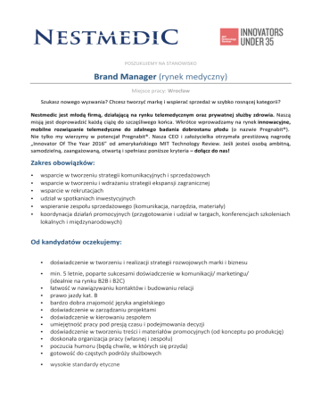POSZUKUJEMYNASTANOWISKO BrandManager(rynek medyczny) Miejscepracy:Wrocław Szukasznowegowyzwania?Chcesztworzyćmarkęiwspieraćsprzedażwszybkorosnącejkategorii? Nestmedic jest młodą firmą, działającą na rynku telemedycznym oraz prywatnej służby zdrowia. Naszą misjąjestdoprowadzićkażdąciążędoszczęśliwegokońca.Wkrótcewprowadzamynarynekinnowacyjne, mobilne rozwiązanie telemedyczne do zdalnego badania dobrostanu płodu (o nazwie Pregnabit®). Nie tylko my wierzymy w potencjał Pregnabit®. Nasza CEO i założycielka otrzymała prestiżową nagrodę „Innovator Of The Year 2016” od amerykańskiego MIT Technology Review. Jeśli jesteś osobą ambitną, samodzielną,zaangażowaną,otwartąispełniaszponiższekryteria–dołączdonas! Zakresobowiązków: • • • • • • wsparcie w tworzeniu strategii komunikacyjnych i sprzedażowych wsparcie w tworzeniu i wdrażaniu strategii ekspansji zagranicznej wsparcie w rekrutacjach udział w spotkaniach inwestycyjnych wspieranie zespołu sprzedażowego (komunikacja, narzędzia, materiały) koordynacja działań promocyjnych (przygotowanie i udział w targach, konferencjach szkoleniach lokalnych i międzynarodowych) Odkandydatówoczekujemy: • doświadczenie w tworzeniu i realizacji strategii rozwojowych marki i biznesu • • • • • • • • • min. 5 letnie, poparte sukcesami doświadczenie w komunikacji/ marketingu/ (idealnie na rynku B2B i B2C) łatwość w nawiązywaniu kontaktów i budowaniu relacji prawo jazdy kat. B bardzo dobra znajomość języka angielskiego doświadczenie w zarządzaniu projektami doświadczenie w kierowaniu zespołem umiejętność pracy pod presją czasu i podejmowania decyzji doświadczenie w tworzeniu treści i materiałów promocyjnych (od konceptu po produkcję) doskonała organizacja pracy (własnej i zespołu) poczucia humoru (będą chwile, w których się przyda) gotowość do częstych podróży służbowych • wysokie standardy etyczne • • Dodatkowymatutembędzie: • doświadczenie w branży medycznej • doświadczenie w procesach szybko rosnącej organizacji (lean start-up) • doświadczenie międzynarodowe • znajomość systemów ERP / CRM Oferujemy: • pełną wyzwań pracę w dynamicznie rozwijającej się firmie telemedycznej w oparciu o kontrakt menedżerski – atrakcyjne warunki zatrudnienia, • możliwość rozwoju zawodowego i doskonalenia umiejętności menedżerskich, • możliwość dynamicznego rozwoju w ramach szybko rozwijającej się spółki, • możliwość realizacji wielu ambitnych projektów, • możliwość podnoszenia kwalifikacji zawodowych, • możliwość uczestniczenia w tworzeniu i realizacji strategii firmy, • dużą samodzielność w działaniu i decyzyjność. Więcej informacji na www.pregnabit.com. Wyślij dziś swoje CV na adres: [email protected]