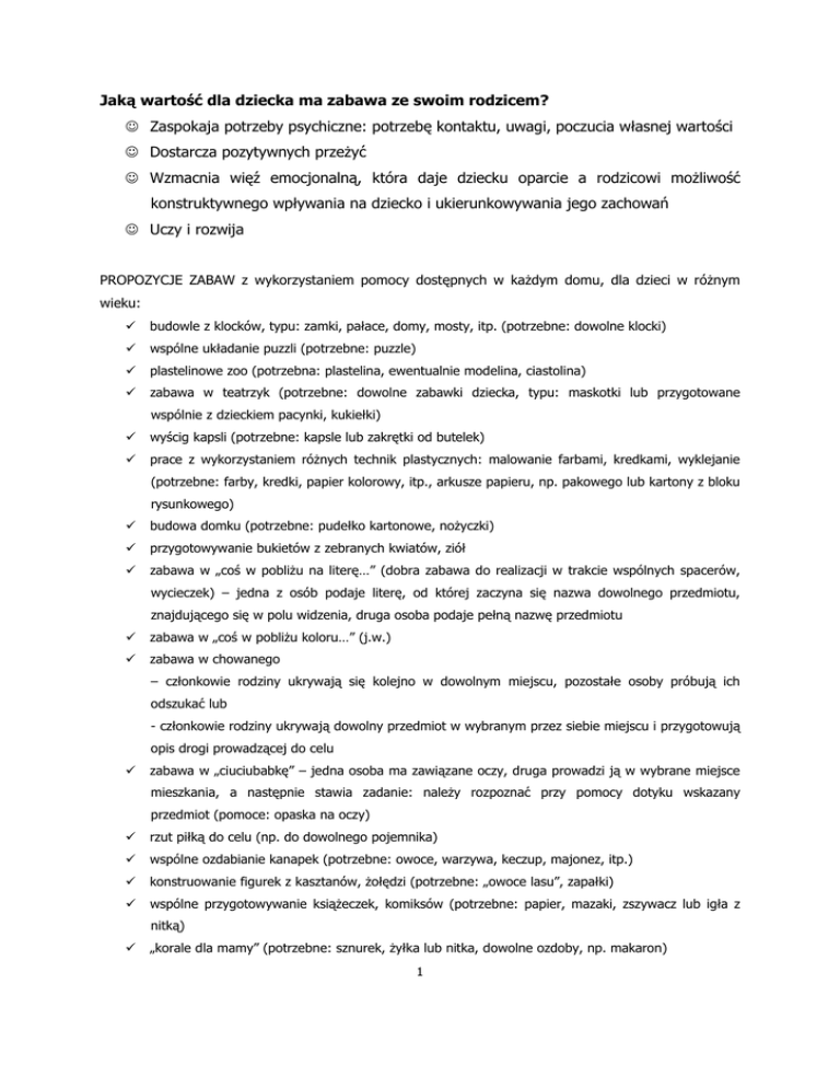 Jaką wartość dla dziecka ma zabawa ze swoim rodzicem? ☺ Zaspokaja potrzeby psychiczne: potrzebę kontaktu, uwagi, poczucia własnej wartości ☺ Dostarcza pozytywnych przeżyć ☺ Wzmacnia więź emocjonalną, która daje dziecku oparcie a rodzicowi możliwość konstruktywnego wpływania na dziecko i ukierunkowywania jego zachowań ☺ Uczy i rozwija PROPOZYCJE ZABAW z wykorzystaniem pomocy dostępnych w każdym domu, dla dzieci w różnym wieku: budowle z klocków, typu: zamki, pałace, domy, mosty, itp. (potrzebne: dowolne klocki) wspólne układanie puzzli (potrzebne: puzzle) plastelinowe zoo (potrzebna: plastelina, ewentualnie modelina, ciastolina) zabawa w teatrzyk (potrzebne: dowolne zabawki dziecka, typu: maskotki lub przygotowane wspólnie z dzieckiem pacynki, kukiełki) wyścig kapsli (potrzebne: kapsle lub zakrętki od butelek) prace z wykorzystaniem różnych technik plastycznych: malowanie farbami, kredkami, wyklejanie (potrzebne: farby, kredki, papier kolorowy, itp., arkusze papieru, np. pakowego lub kartony z bloku rysunkowego) budowa domku (potrzebne: pudełko kartonowe, nożyczki) przygotowywanie bukietów z zebranych kwiatów, ziół zabawa w „coś w pobliżu na literę…” (dobra zabawa do realizacji w trakcie wspólnych spacerów, wycieczek) – jedna z osób podaje literę, od której zaczyna się nazwa dowolnego przedmiotu, znajdującego się w polu widzenia, druga osoba podaje pełną nazwę przedmiotu zabawa w „coś w pobliżu koloru…” (j.w.) zabawa w chowanego – członkowie rodziny ukrywają się kolejno w dowolnym miejscu, pozostałe osoby próbują ich odszukać lub - członkowie rodziny ukrywają dowolny przedmiot w wybranym przez siebie miejscu i przygotowują opis drogi prowadzącej do celu zabawa w „ciuciubabkę” – jedna osoba ma zawiązane oczy, druga prowadzi ją w wybrane miejsce mieszkania, a następnie stawia zadanie: należy rozpoznać przy pomocy dotyku wskazany przedmiot (pomoce: opaska na oczy) rzut piłką do celu (np. do dowolnego pojemnika) wspólne ozdabianie kanapek (potrzebne: owoce, warzywa, keczup, majonez, itp.) konstruowanie figurek z kasztanów, żołędzi (potrzebne: „owoce lasu”, zapałki) wspólne przygotowywanie książeczek, komiksów (potrzebne: papier, mazaki, zszywacz lub igła z nitką) „korale dla mamy” (potrzebne: sznurek, żyłka lub nitka, dowolne ozdoby, np. makaron) 1 zabawa w „co się zmieniło?” (potrzebne: dowolne przedmioty np. klocki różnych kształtów i kolorów) – rodzic i dziecko na zmianę zmieniają coś w układzie elementów, druga osoba nie widząc wprowadzanych zmian określa, co się zmieniło zabawa w „ciepło, zimno” (potrzebny dowolny przedmiot) – jedna osoba ukrywa w dowolnym miejscu przedmiot, druga próbuje odszukać, kierując się otrzymywanymi wskazówkami: ciepło – co oznacza, że zbliża się do przedmiotu oraz zimno – co oznacza, że jest daleko od przedmiotu kalambury – członkowie rodziny kolejno prezentują pozostałym osobom wymyślone przez siebie hasła, korzystając tylko i wyłącznie z mowy ciała, pozostali próbują odgadnąć hasło, kategorie dowolne (przedmiot, zwierzę, tytuł bajki, zawód, itp.) przygotowywanie pocztówek, zakładek do książki, ramek na zdjęcia, itp. (karton papieru i dowolne pomoce: kredki, mazaki, fotografie, ilustracje itd.) czytanie bajek, wierszy i przygotowywanie do nich ilustracji budowanie opowiadań (jedna osoba rozpoczyna podając dowolne zdanie, np. „W wielkim mieście mieszkał pewien człowiek.” Kolejna osoba rozbudowuje opowiadanie dodając kolejne zdanie, itd.) – dobra zabawa do realizacji w trakcie wspólnych wycieczek, spacerów przygotowywanie makiet (np. makieta miasta, potrzebne: tekturowy karton, kartony papieru do przygotowania postaci, budynków, i in. obiektów) zabawy ruchowe, np. twister (pomoce: należy przygotować planszę z kolorowymi polami a także karteczki z zadaniami, typu: lewa ręka na czerwonym, prawa noga na zielonym; prawy łokieć na żółtym, głowa na niebieskim; itp.) – członkowie rodziny kolejno losują zadanie i próbują je wykonać stemple (potrzebne: ziemniaki, farby) – ziemniaki należy przekroić na połówki, a następnie wykroić w nich dowolne kształty i pokryć farbą w dowolnym kolorze przygotowanie ozdobnych serwetek i wykorzystanie ich do nakrycia stołu (pomoce: kolorowe serwetki, nożyczki) – serwetki należy złożyć w dowolny sposób, a następnie wyciąć w nich dowolne otwory, rozłożyć wernisaż – każda osoba przygotowuje dowolną pracę plastyczną, a następnie członkowie rodziny organizują wystawę prac, wieszając je w dowolnym miejscu mieszkania rzeźby (potrzebne: papier pakowy, gazety) – członkowie rodziny tworzą z przygotowanych materiałów dowolną rzeźbę gra w „statki” gra w „państwa, miasta” … i wiele innych. opracowanie: mgr Monika Jasiulak, psycholog Zachęcam także do realizowania własnych pomysłów na zabawy z dziećmi, w domu i poza nim. Wspólna praca nad pomysłem na 2 nową zabawę lub przygotowywaniem również dobrą zabawą. Powodzenia! 3 dla niej pomocy może być