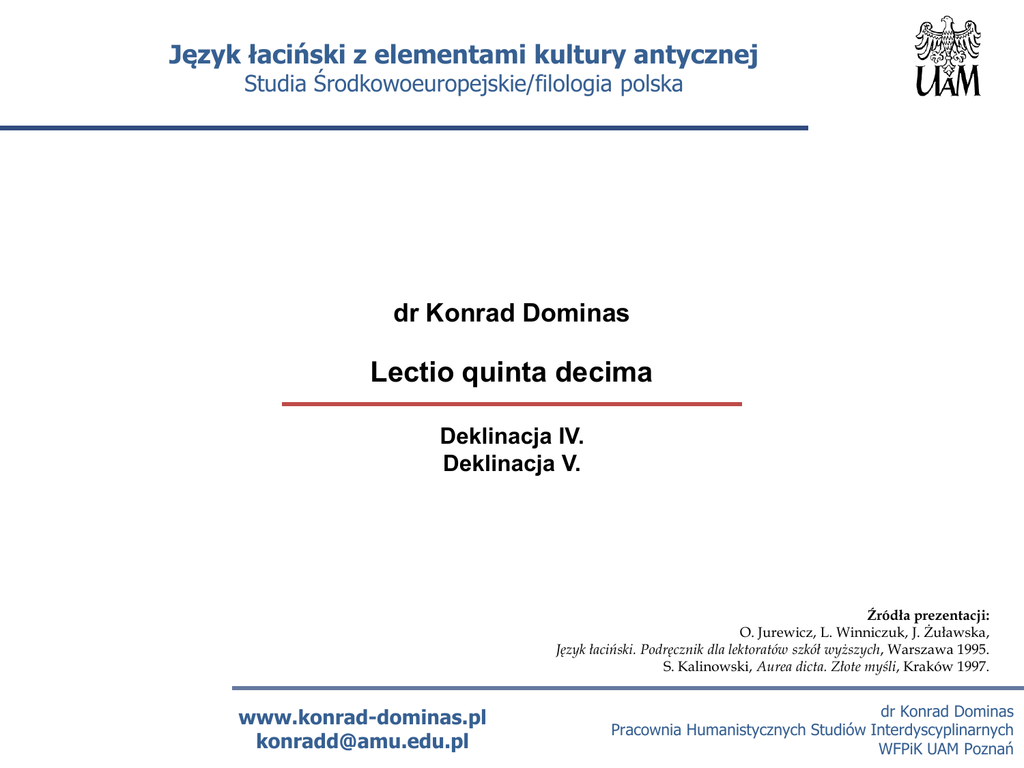 Język łaciński z elementami kultury antycznej Studia Środkowoeuropejskie/filologia polska dr Konrad Dominas Lectio quinta decima Deklinacja IV. Deklinacja V. Źródła prezentacji: O. Jurewicz, L. Winniczuk, J. Żuławska, Język łaciński. Podręcznik dla lektoratów szkół wyższych, Warszawa 1995. S. Kalinowski, Aurea dicta. Złote myśli, Kraków 1997. www.konrad-dominas.pl [email protected] dr Konrad Dominas Pracownia Humanistycznych Studiów Interdyscyplinarnych WFPiK UAM Poznań Język łaciński z elementami kultury antycznej Studia Środkowoeuropejskie/filologia polska Lectio quinta decima Trzy sentencje łacińskie Verum amicum pecunia non parabitis Prawdziwego przyjaciela nie zdobędziesz za pieniądze Gaudia principium sunt saepe nostri doloris Radość bywa często początkiem naszego bólu Honores mutant mores, sed raro in meliores Zaszczyty zmieniają obyczaje, lecz rzadko na lepsze www.konrad-dominas.pl [email protected] Owidiusz, Metamorfozy 7,796 dr Konrad Dominas Pracownia Humanistycznych Studiów Interdyscyplinarnych WFPiK UAM Poznań Język łaciński z elementami kultury antycznej Studia Środkowoeuropejskie/filologia polska Lectio quinta decima Zwroty i skróty mente captus słaby na umyśle minimum najmniej minus mniej modus operandi sposób działania modus procedendi sposób postępowania www.konrad-dominas.pl [email protected] dr Konrad Dominas Pracownia Humanistycznych Studiów Interdyscyplinarnych WFPiK UAM Poznań Język łaciński z elementami kultury antycznej Studia Środkowoeuropejskie/filologia polska Lectio quinta decima Deklinacja IV – uwagi ogólne Do deklinacji IV należą rzeczowniki rodzaju męskiego zakończone w nom. sing. na us i rodzaju nijakiego zakończone w nom. sing. na -u; końcówką gen. sing. rzeczowników deklinacji IV jest -us, np. exercitus, exercitus (m) - wojsko; genu, genus (n) – kolano. Następujące rzeczowniki deklinacji IV są rodzaju żeńskiego: manus, us – ręka, oddział; tribus, us – tribus, dzielnica rzymska; porticus, us – portyk, krużganek; domus, us – dom; acus, us – igła; Idus, Iduum – Idy. www.konrad-dominas.pl [email protected] dr Konrad Dominas Pracownia Humanistycznych Studiów Interdyscyplinarnych WFPiK UAM Poznań Język łaciński z elementami kultury antycznej Studia Środkowoeuropejskie/filologia polska Lectio quinta decima Deklinacja IV – wzór odmiany Genus masculinum Genus neutrum Singularis Pluralis Singularis Pluralis N. exercitu-s exercitu-s cornu cornu-a G. exercitu-s exercitu-um cornu-s cornu-um D. exercitu-i exerciti-bus cornu-i corni-bus Acc. exercitu-m exercitu-s cornu cornu-a Abl. exercitu exerciti-bus cornu corni-bus Voc. exercitus exercitu-s cornu cornu-a www.konrad-dominas.pl [email protected] dr Konrad Dominas Pracownia Humanistycznych Studiów Interdyscyplinarnych WFPiK UAM Poznań Język łaciński z elementami kultury antycznej Studia Środkowoeuropejskie/filologia polska Lectio quinta decima Rzeczownik domus, us (f) Singularis Pluralis N. domus domus G. domus domorum D. domui domibus Acc. domum domos Abl. domo domibus V. domus domus W rzeczowniku domus, us (f) występuje temat na -o, obok tematu na -u. www.konrad-dominas.pl [email protected] Rzeczownik domus, us (f) podlega składni nazw miast: domum – do domu; domo – z domu; domi (locativus) – w domu. dr Konrad Dominas Pracownia Humanistycznych Studiów Interdyscyplinarnych WFPiK UAM Poznań Język łaciński z elementami kultury antycznej Studia Środkowoeuropejskie/filologia polska Lectio quinta decima Deklinacja V Singularis Pluralis N. re-s re-s G. re-i re-rum D. re-i re-bus Acc. re-m re-s Abl. re re-bus re-s re-s V. www.konrad-dominas.pl [email protected] Do deklinacji V należą rzeczowniki rodzaju żeńskiego zakończone w nom. sing. na -es, w gen. sing. na -i, np. res, rei (f) – rzecz, dies, diei (f m) – dzień. Rzeczowniki deklinacji V: dies, diei (dzień) i złożony meridies, meridiei (południe) są rodzaju męskiego, lecz dies jako „dzień – termin” jest rodzaju żeńskiego: die constituta – w dniu wyznaczonym. dr Konrad Dominas Pracownia Humanistycznych Studiów Interdyscyplinarnych WFPiK UAM Poznań