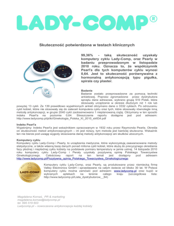 Skuteczność potwierdzona w testach klinicznych 99,36% - taką skuteczność uzyskały komputery cyklu Lady-Comp, oraz Pearly w badaniu przeprowadzonym w listopadzie 2010 roku. Oznacza to, że współczynnik Pearl'a dla tych komputerów cyklu wynosi 0,64. Jest to skuteczność porównywalna z hormonalną antykoncepcją typu pigułka, spirala czy plaster. Badanie Badanie zostało przeprowadzone za pomocą techniki ankietowej. Poprzez zgromadzone przez dystrybutora sprzętu dane adresowe, wybrano grupę 510 Polek, które stosowały urządzanie w okresie dłuższym niż 1 rok lub powyżej 13 cykli. Ze 139 prawidłowo wypełnionych ankiet otrzymano dane o 3332 cyklach. Po odrzuceniu cykli kobiet, które nie stosowały się do zaleceń komputera cyklu oraz tych, które stosowały równolegle inną metodę antykoncepcji, w grupie 2040 cykli zaobserwowano 1 nieplanowaną ciążę. Otrzymany w ten sposób indeks Pearl'a na poziomie 0,64. Streszczenie raportu dostępne jest pod adresem: http://www.ladycomp.pl/pliki/Ginekologia_Polska_XI_2010_str834.pdf Indeks Pearl'a Wyjaśnijmy: Indeks Pearl'a jest wskaźnikiem opracowanym w 1932 roku przez Raymonda Pearla. Określa on skuteczność metod antykoncepcyjnych – im jest niższy, tym metoda jest bardziej skuteczna. Wskaźnik ten nie bierze pod uwagę wygody stosowania danej metody antykoncepcji ani skutków ubocznych. Komputery cyklu Komputery cyklu Lady-Comp i Pearly, to urządzenia medyczne, które wykorzystują zaawansowane metody statystyczne, a także własną bazę danych ponad miliona cykli kobiet, które służą do precyzyjnego określania fazy płodnej i niepłodnej cyklu kobiety na podstawie pomiaru temperatury w jamie ustnej. 14 listopada 2010 roku komputery cyklu Lady-Comp i Peraly uzyskały pozytywną opinię Polskiego Towarzystwa Ginekologicznego. Całościowy raport na ten temat jest dostępny pod adresem http://www.ladycomp.pl/Pozytywna_opinia_Polskiego_Towarzystwa_Ginekologicznego Komputery cyklu Lady-Comp, oraz Pearly, są produkowane przez niemiecką firmę Valley Electronics GmbH i sprzedawane na całym świecie od blisko 30 lat. W Polsce komputery cyklu można zamówić pod adresem: www.ladycomp.pl oraz kupić w wybranych aptekach na terenie całego kraju (szczegółowa lista: http://www.ladycomp.pl/Lista_dystrybutorow__64) Magdalena Kornaś, PR & marketing [email protected] tel. 695 519 603 Ladycomp.pl – nowoczesna antykoncepcja każdej kobiety