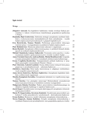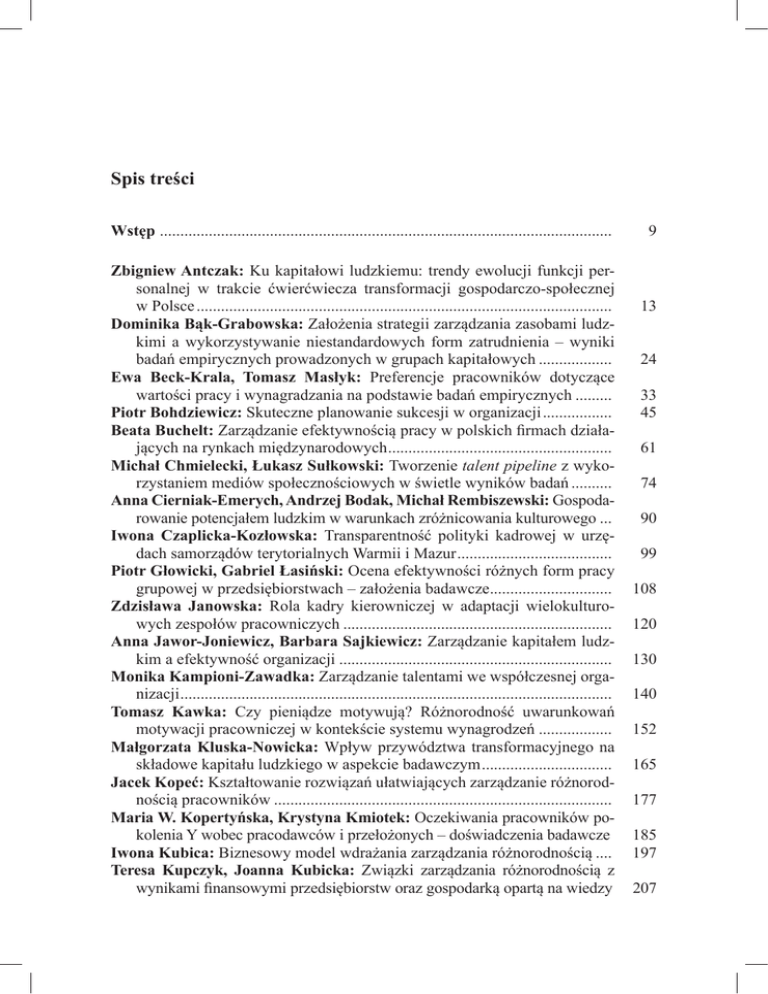 Spis treści Wstęp ................................................................................................................ 9 Zbigniew Antczak: Ku kapitałowi ludzkiemu: trendy ewolucji funkcji personalnej w trakcie ćwierćwiecza transformacji gospodarczo-społecznej w Polsce....................................................................................................... 13 Dominika Bąk-Grabowska: Założenia strategii zarządzania zasobami ludzkimi a wykorzystywanie niestandardowych form zatrudnienia – wyniki badań empirycznych prowadzonych w grupach kapitałowych................... 24 Ewa Beck-Krala, Tomasz Masłyk: Preferencje pracowników dotyczące wartości pracy i wynagradzania na podstawie badań empirycznych.......... 33 Piotr Bohdziewicz: Skuteczne planowanie sukcesji w organizacji.................. 45 Beata Buchelt: Zarządzanie efektywnością pracy w polskich firmach działających na rynkach międzynarodowych........................................................ 61 Michał Chmielecki, Łukasz Sułkowski: Tworzenie talent pipeline z wykorzystaniem mediów społecznościowych w świetle wyników badań........... 74 Anna Cierniak-Emerych, Andrzej Bodak, Michał Rembiszewski: Gospodarowanie potencjałem ludzkim w warunkach zróżnicowania kulturowego.... 90 Iwona Czaplicka-Kozłowska: Transparentność polityki kadrowej w urzędach samorządów terytorialnych Warmii i Mazur....................................... 99 Piotr Głowicki, Gabriel Łasiński: Ocena efektywności różnych form pracy grupowej w przedsiębiorstwach – założenia badawcze............................... 108 Zdzisława Janowska: Rola kadry kierowniczej w adaptacji wielokulturowych zespołów pracowniczych................................................................... 120 Anna Jawor-Joniewicz, Barbara Sajkiewicz: Zarządzanie kapitałem ludzkim a efektywność organizacji.................................................................... 130 Monika Kampioni-Zawadka: Zarządzanie talentami we współczesnej organizacji........................................................................................................... 140 Tomasz Kawka: Czy pieniądze motywują? Różnorodność uwarunkowań motywacji pracowniczej w kontekście systemu wynagrodzeń................... 152 Małgorzata Kluska-Nowicka: Wpływ przywództwa transformacyjnego na składowe kapitału ludzkiego w aspekcie badawczym................................. 165 Jacek Kopeć: Kształtowanie rozwiązań ułatwiających zarządzanie różnorodnością pracowników.................................................................................... 177 Maria W. Kopertyńska, Krystyna Kmiotek: Oczekiwania pracowników pokolenia Y wobec pracodawców i przełożonych – doświadczenia badawcze. 185 Iwona Kubica: Biznesowy model wdrażania zarządzania różnorodnością..... 197 Teresa Kupczyk, Joanna Kubicka: Związki zarządzania różnorodnością z wynikami finansowymi przedsiębiorstw oraz gospodarką opartą na wiedzy. 207 6 Spis treści Gabriel Łasiński, Piotr Głowicki, Tomasz Olenderek: Strategia rozwoju potencjału menedżerskiego w firmie Fresh Logistics Sp. z o.o. – Raben Group........................................................................................................... 219 Grzegorz Łukasiewicz: Organizacyjne efekty zarządzania różnorodnością... 231 Alicja Miś: Kariera w firmie międzynarodowej. Diagnoza praktyk w polskich firmach rozwijających działalność międzynarodową.................................. 241 Bogdan Nogalski, Przemysław Niewiadomski: Metodyka oceny pracowników wykonawczych w elastycznym zakładzie wytwórczym – koncepcja i zastosowanie.............................................................................................. 254 Piotr Oleksiak: Rola systemów wynagradzania w kształtowaniu zasobów ludzkich w organizacji................................................................................. 272 Ewa Olszak: Nowoczesny dobór personelu – kierunki rozwoju metod i narzędzi w rekrutacji i selekcji........................................................................ 283 Łukasz Panfil, Tomasz Seweryniak: Wybrane uwarunkowania rozwoju talentów sportowych.................................................................................... 295 Piotr Pilch: Rola polityki organizacyjnej w zarządzaniu kapitałem społecznym organizacji............................................................................................ 308 Katarzyna Piórkowska: Kapitał ludzki w organizacji z perspektywy menedżerskich postaw społecznych..................................................................... 325 Sylwia Przytuła: Wpływ czynników kulturowych na praktykę zarządzania ekspatami w polskich filiach – wyniki badań empirycznych...................... 337 Anna Rakowska: Różnorodność zasobów ludzkich – stan badań i wyzwania351 Tomasz Sapeta: Wynagradzanie pracowników w kontekście dywersyfikacji działalności przedsiębiorstw na rynkach międzynarodowych..................... 361 Tomasz Seweryniak, Aneta Stosik: Diagnoza procesu zwiększania efektywności zespołów sportowych w aspekcie podmiotów wspierających wiedzę specjalistyczną trenerów.............................................................................. 372 Agata Słodkiewicz: Kształtowanie i wykorzystanie potencjału organizacji – studium przypadku....................................................................................... 389 Agnieszka Springer: Orientacja na talenty a kształtowanie kapitału ludzkiego organizacji............................................................................................... 399 Marzena Stor: Kapitał menedżerski jako źródło przewagi konkurencyjnej przedsiębiorstwa.......................................................................................... 409 Aneta Stosik: HR menedżer i wdrażanie koncepcji Idea Ma