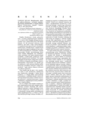 R E C E TADEUSZ WOLAK: Muzykowanie metodą cyfrowo-literową z uczniami niepełnosprawnymi intelektualnie w stopniu lekkim. Oficyna Wydawnicza „Impuls”, Kraków 2010, ss. 150 z płytą DVD) […] Powodzenie jakiejkolwiek koncepcji edukacyjnej (…) zależy faktycznie i ostatecznie od nauczyciela. Bez jego udziału jako kreatora, moc wykonawcza dekretu czy rozporządzenia pozostanie jedynie na papierze […] Jadwiga Kowalikowa, 2003 Książka Muzykowanie metodą cyfrowo-literową z uczniami niepełnosprawnymi intelektualnie w stopniu lekkim (książka dużego formatu, wydana wraz z płytą DVD), liczy 150 stronic formatu A-4. Jej zawartość stanowią: karta tytułowa, spis treści, wstęp wprowadzający w zasadnicze treści opracowania o charakterze teoretycznym, metodycznym i empirycznym oraz spis treści nagrań znajdujących się na płycie DVD pochodzących z koncertów zespołu muzycznego Promyk, prowadzonego przez autora książki, bibliografia oraz niezbędny, wielce przydatny dla mniej zorientowanego czytelnika i użytkownika, praktyczny słowniczek podstawowych terminów. Na uwagę zasługuje również forma, estetycznie wykonane, kolorowe fotografie, przybliżające zestawy instrumentów muzycznych czy sposób gry na niektórych z nich, starannie dobrane teksty muzyczne, przykłady oznaczeń i notacji muzycznych – zapis nutowy, literowy (linomuz) czy cyfrowy (cynomuz). Treść książki daje się ująć w trzy zasadnicze części, to jest: teoretyczną, metodyczną oraz empiryczną, ukazujące z jednej strony podstawy, a z drugiej efekty wprowadzenia i korzystania z autorskiej metody cyfrowo-literowej notacji muzycznej (w skrócie nazywanej cylinomuz) i zasad jej stosowania w pracy z młodzieżą z niepełnosprawnością intelektualną w stopniu lekkim. Już we wstępie autor książki wyjaśnia pojęcie niepełnosprawności jako kategorii aksjologicznej, wyraźnie akcentując fakt zatrważających statystyk o randze rankingów światowych i krajowych, z których wynika, że co 5. mieszkaniec naszego globu ziemskiego jest osobą niepełnosprawną, a w Polsce co 25. jej obywatel jest pewnego rodzaju inwalidą, wy- 316 N Z J E magającym wsparcia i wydatnej pomocy osób trzecich. Wśród tych ostatnich mieszczą się osoby z upośledzeniem umysłowym o zróżnicowanej etiologii i stopnia tego zaburzenia rozwoju, do której to populacji należą również uczniowie Specjalnego Ośrodka Szkolno-Wychowawczego (SOSW) nr 2 w Krakowie. Uczniowie są zasadniczym podmiotem, wokół którego koncentrują się rozważania na temat prezentowanej metody, a ich osiągnięcia w zakresie znajomości podstaw muzyki i muzykowania aż nadto wyraźnie wskazują, jak wiele mogą oni osiągnąć w zakresie swojego rozwoju, jeśli odpowiednio się ich traktuje, stwarzając wokół nich sprzyjający klimat wychowania, stosując starannie dobrane, adekwatne do potrzeb i indywidualnych możliwości młodzieży, w pełni jej przydatne i odpowiadające jej gustom i potrzebom, efektywne metody aktywizowania, wsparcia i pomocy. W części teoretycznej autor, nawiązując do zatwierdzonego przez Ministerstwo Edukacji Narodowej programu nauczania muzyki w szkołach dla uczniów z upośledzeniem umysłowym w stopniu lekkim, na poziomie kształcenia podstawowego i gimnazjum, ukazał własny punkt widzenia na ich edukację oraz koncepcję metody pracy i możliwości rozwijania artystycznych uzdolnień i zainteresowań młodzieży poprzez muzykę i efektywne muzykowanie. Autor w przystępny sposób wyjaśnił terminy, istotne dla zrozumienia podstaw muzyki i edukacji muzycznej (m.in. takie jak: zdolności muzyczne, słuch muzyczny, pamięć muzyczna, poczucie rytmu i smaku artystycznego, a ponadto: gama, fraza muzyczna, motyw, ostinato, skala, puls, rytm, metrum, legato, staccato, dominanta, subdominanta czy tempo). Przy okazji autor wspomniał o metodach badań w zakresie zdolności muzycznych u dzieci i młodzieży w ogóle, o pamięci muzycznej, o poczuciu rytmu i słuchu harmonicznym u uczniów z diagnozą niepełnosprawności intelektualnej, by potem już przejść do zaprezentowania autorskiej metody muzykowania z nimi na podstawie cyfrowo-literowej notacji muzycznej. W ramach stosowanego zapisu muzycznego autor wyodrębnił zapis literowy – jako literową notację muzyczną (określoną skrótem linomuz), która umożliwia grę na SZKO£A SPECJALNA 4/2011 RECENZJE instrumentach sztabkowych i klawiszowych oraz zapis cyfrowy – jako cyfrowa notacja muzyczna (określona skrótem cynomuz) – która bywa wykorzystywana przy grze na flecie prostym sopranowym, a także klarnecie oraz flecie poprzecznym. Podstawową zasadą pracy nauczyciela muzyki we wspomnianym ośrodku jest obejmowanie muzyką i muzykowaniem wszystkich uczniów, którzy tylko mają taką potrzebę i ochotę, a wyznacznikiem efektywności zaproponowanej im metody pracy mogą być przejawiane przez nich chęci do nauki gry na danym instrumencie, zgodnie z posiadanymi predyspozycjami i zainteresowaniami, ich niezwykła determinacja, wola działania, zdyscyplinowanie, świadoma aktywność oraz pracowitość i systematyczność pracy. Omawiana książka jest przykładem tego, jak umiejętnie, w sposób intencjonalny i przemyślany można docierać do uczniów z niepełnosprawnością intelektualną w stopniu lekkim, o stosunkowo niewielkich wszak zdolnościach i możliwościach rozwoju funkcji percepcyjno-poznawczych, by odpowiednio zmotywować ich i zachęcić do pracy na rzecz własnego rozwoju, a nade wszystko rozmiłować ich w muzyce i muzykowaniu. Książka napisana jest ładnym, poprawnym językiem, której treść pomimo fachowej terminologii muzycznej jest w pełni zrozumiała dla odbiorcy, a zarazem potencjalnego użytkownika samej metody i zachęcająca do lektury. Autor często podkreśla, że uczniowi z diagnozą niepełnosprawności intelektualnej w stopniu lekkim nie wystarczy zminimalizowanie wymagań pedagogicznych, lecz p
