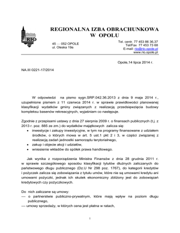 REGIONALNA IZBA OBRACHUNKOWA W OPOLU Tel. centr. 77 453 86 36,37 Tel/Fax 77 453 73 68 E-mail: [email protected] www.rio.opole.pl 45 — 052 OPOLE ul. Oleska 19a Opole,14 lipca 2014 r. NA.III 0221-17/2014 W odpowiedzi na pismo sygn.SRP.042.36.2013 z dnia 9 maja 2014 r., uzupełnione pismem z 11 czerwca 2014 r. w sprawie prawidłowości planowanej klasyfikacji wydatków gminy związanych z realizacją przedsięwzięcia budowy kompleksu basenów rekreacyjnych, wyjaśniam co następuje. Zgodnie z przepisami ustawy z dnia 27 sierpnia 2009 r. o finansach publicznych (t.j. z 2013 r. poz. 885 ze zm.) do wydatków majątkowych zalicza się: inwestycje i zakupy inwestycyjne, w tym na programy finansowane z udziałem środków, o których mowa w art. 5 ust.1 pkt 2 i 3, w części związanej z realizacją zadań jednostki samorządu terytorialnego, zakup i objecie akcji i udziałów, wniesienie wkładów do spółek prawa handlowego. Jak wynika z rozporządzenia Ministra Finansów z dnia 28 grudnia 2011 r. w sprawie szczegółowego sposobu klasyfikacji tytułów dłużnych zaliczanych do państwowego długu publicznego (Dz.U Nr 298 poz. 1767), do kategorii kredytów i pożyczek zalicza się zobowiązania z tytułu umów, które nie są umowami kredytu ani umowami pożyczki, jednak ich skutek ekonomiczny zbliżony jest do zobowiązań kredytowych czy pożyczkowych. Do nich zaliczane są umowy: –– o partnerstwie publiczno-prywatnym, które mają wpływ na poziom długu publicznego, –– umowy sprzedaży, w których cena jest płatna w ratach, 1 –– umowy leasingu zawarte z producentem lub finansującym, w których ryzyko i korzyści z tytułu własności są przeniesione na korzystającego z rzeczy, –– umowy nienazwane o terminie zapłaty dłuższym niż rok, związane z finansowaniem usług, dostaw, robot budowlanych, które wywołują skutki ekonomiczne podobne do umowy pożyczki lub kredytu. Określone w rozporządzeniu warunki dotyczące zaliczenia do kategorii kredytów i pożyczek wielu różnorodnych umów powodują, że o włączeniu do długu publicznego zobowiązań wynikających z określonej umowy decydują poszczególne ich zapisy. Dlatego też w tym kontekście należy zastrzec, że niezwykle istotna staje się wnikliwa analiza umowy inwestycyjnej zawartej przez gminę, spółkę i wykonawcę, pod względem jej treści i skutków ekonomicznych bez względu na nazwę i formę takiej umowy. W opisanej sytuacji, wykup udziałów w spółce utworzonej do wybudowania kompleksu basenów, od podmiotu zewnętrznego będzie stanowił wydatek majątkowy. Zgodnie z rozporządzeniem Ministra Finansów z dnia 2 marca 2010 r. w sprawie szczegółowej klasyfikacji dochodów, wydatków, przychodów i rozchodów oraz środków pochodzących ze źródeł zagranicznych (Dz.U Nr 38 poz. 207 ze zm.) wykup tych udziałów będzie zaklasyfikowany w § 601 – Wydatki na zakup i objęcie akcji, wniesienie wkładów do spółek prawa handlowego oraz na uzupełnienie funduszy statutowych banków i innych instytucji finansowych. Utworzona spółka kapitałowa, o której mowa w piśmie, nad którą kontrolę sprawuje podmiot sektora finansów publicznych w tym przypadku gmina, z definicji wyłączona jest z zakresu sektora finansów publicznych w rozumieniu prawa krajowego, gdyż zgodnie z art. 9 pkt 14 cytowanej ustawy sektor finansów publicznych tworzą inne państwowe lub samorządowe osoby prawne utworzone na podstawie odrębnych ustaw w celu wykonywania zadań publicznych, z wyłączeniem przedsiębiorstw, instytutów badawczych, banków i spółek prawa handlowego. Na dzień dzisiejszy zobowiązania utworzonej spółki do realizacji opisanego przedsięwzięcia, nie będą wliczane do państwowego długu publicznego. 2