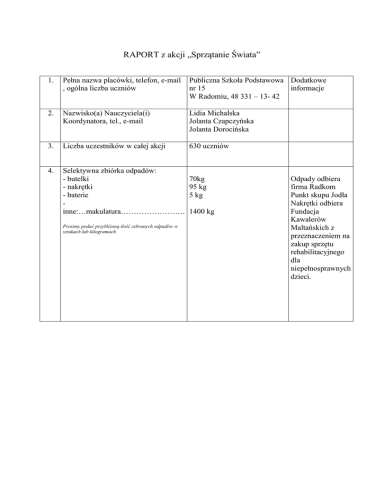 RAPORT z akcji „Sprzątanie Świata” 1. Pełna nazwa placówki, telefon, e-mail , ogólna liczba uczniów Publiczna Szkoła Podstawowa Dodatkowe nr 15 informacje W Radomiu, 48 331 – 13- 42 2. Nazwisko(a) Nauczyciela(i) Koordynatora, tel., e-mail Lidia Michalska Jolanta Czapczyńska Jolanta Dorocińska 3. Liczba uczestników w całej akcji 630 uczniów 4. Selektywna zbiórka odpadów: - butelki - nakrętki - baterie inne:…makulatura……………………. 70kg 95 kg 5 kg Prosimy podać przybliżoną ilość zebranych odpadów w sztukach lub kilogramach 1400 kg Odpady odbiera firma Radkom Punkt skupu Jodła Nakrętki odbiera Fundacja Kawalerów Maltańskich z przeznaczeniem na zakup sprzętu rehabilitacyjnego dla niepełnosprawnych dzieci. 5. 1. Przeprowadzenie w klasach 240 uczniów Przeprowadzone działania edukacyjne I – III zajęć edukacyjnych o (lekcje, konkursy, apele, gazetki itp.). odpadach.: ,,Segregujesz, - liczba uczestników objętych edukacją odzyskujesz - czyli dobre rady na odpady”. 2. Zorganizowanie konkursu: 26 uczniów ,, Eko Skarbonka” . Uczniowie wykonywali prace z surowców wtórnych. Wyeksponowanie prac na wystawce. 3.Przeprowadzenie zajęć w klasach piątych: ,,Dlaczego trzeba sprzątać Ziemię?” W klasach szóstych ,,Co i jak zagraża przyrodzie”. 84 uczniów 4. Przygotowanie plakatów: ,,Lasy to życie – chrońmy je.” 18 uczniów 5. Zorganizowanie warsztatów: ,,Bawimy się odpadami”. Zorganizowanie wystawki. 68 uczniów 15 uczniów 6. Zorganizowanie konkursu plastycznego: ,,Odpady zbieramy, środowisku pomagamy.” 45 uczniów 7. Ścieżka przyrodnicza w Lesie Kapturskim oraz w Nadleśnictwie Marcule. 6. Inne autorskie działania placówek przeprowadzone w ramach akcji. 1. Uczniowie uczestniczyli w projekcie Wojewódzkiego Funduszu Ochrony Środowiska i Gospodarki Wodnej w Warszawie: ,, Nasza Ziemia dla uśmiechu dzieci , nie dla sterty śmieci”Projekt realizowany był przez LOP. 25 uczniów 12 uczniów 2. Uczniowie wykonali prace plastyczne na konkurs związany z realizacją wymienionego projektu: ,,Segregacja odpadów w moim mieście, czyli jak mieszkańcy prowadzą gospodarkę odpadami” 25 uczniów 3.W ramach realizacji projektu przeprowadzone były zajęcia na temat: ,, Historia aluminiowej puszki” Zajęcia przeprowadziła Anna Raus Rajca z Ligi Ochrony Przyrody 25 uczniów 4. Uczniowie brali udział w projekcie: ,,Drzewo zielony przyjaciel człowieka” – projekt 25 uczniów realizowany był przez LOP. 5. W ramach realizacji projektu przeprowadzone były zajęcia na temat: ,, Zajęcia przeprowadziła Grażyna Gumola z Ligi 13 uczniów Ochrony Przyrody. 6. Uczniowie wykonali prace plastyczne związane z realizacją projektu na temat: ,,Drzewo blisko mnie” Opracowanie raportu: Lidia Michalska