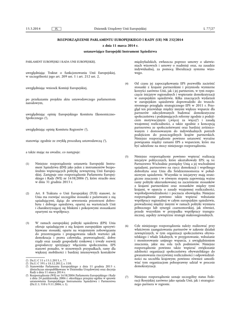 15.3.2014 Dziennik Urzędowy Unii Europejskiej PL L 77/27 ROZPORZĄDZENIE PARLAMENTU EUROPEJSKIEGO I RADY (UE) NR 232/2014 z dnia 11 marca 2014 r. ustanawiające Europejski Instrument Sąsiedztwa PARLAMENT EUROPEJSKI I RADA UNII EUROPEJSKIEJ, międzyludzkich, zwłaszcza poprzez umowy o ułatwie niach wizowych i umowy o readmisji oraz, na zasadzie indywidualnej, za pomocą liberalizacji systemu wizo wego. uwzględniając Traktat o funkcjonowaniu Unii Europejskiej, w szczególności jego art. 209 ust. 1 i art. 212 ust. 2, (4) Od czasu jej zapoczątkowania EPS pozwoliła zacieśnić stosunki z krajami partnerskimi i przyniosła wymierne korzyści zarówno Unii, jak i jej partnerom, w tym rozpo częcie inicjatyw regionalnych i wspieranie demokratyzacji w europejskim sąsiedztwie. Kilka znaczących wydarzeń w europejskim sąsiedztwie doprowadziło do wszech stronnego przeglądu strategicznego EPS w 2011 r. Prze gląd ten przewiduje między innymi większe wsparcie dla partnerów zdecydowanych budować demokratyczne społeczeństwa i podejmujących reformy zgodnie z podejś ciem motywacyjnym („więcej za więcej”) i zasadą wzajemnej rozliczalności, a także zgodnie z koncepcją partnerstwa ze społeczeństwami oraz bardziej zróżnico wanym i dostosowanym do indywidualnych potrzeb podejściem do poszczególnych krajów partnerskich. Niniejsze rozporządzenie powinno ustanowić wyraźne powiązania między ramami EPS a wsparciem, które ma być udzielone na mocy niniejszego rozporządzenia. (5) Niniejsze rozporządzenie powinno wspierać realizację inicjatyw politycznych, które ukształtowały EPS; są to: Partnerstwo Wschodnie pomiędzy Unią a jej wschodnimi sąsiadami, partnerstwo na rzecz demokracji i wspólnego dobrobytu oraz Unia dla Śródziemnomorza w połud niowym sąsiedztwie. Wszystkie te inicjatywy mają strate giczne znaczenie i w równym stopniu zapewniają ważne ramy polityki ukierunkowanej na zacieśnienie stosunków z krajami partnerskimi oraz stosunków między tymi krajami, w oparciu o zasady wzajemnej rozliczalności, współodpowiedzialności i poczucia obowiązku. Niniejsze rozporządzenie powinno także wspierać wdrażanie współpracy regionalnej w całym europejskim sąsiedztwie, prowadzonej między innymi w ramach polityki wymiaru północnego lub synergii czarnomorskiej, jak również, przede wszystkim w przypadku współpracy transgra nicznej, aspekty zewnętrzne strategii makroregionalnych. (6) Cele niniejszego rozporządzenia należy realizować przy właściwym zaangażowaniu partnerów w zakresie działań zewnętrznych, w tym organizacji społeczeństwa obywa telskiego i władz lokalnych, w przygotowanie, wdrażanie i monitorowanie unijnego wsparcia, z uwzględnieniem znaczenia, jakie ma rola tych podmiotów. Niniejsze rozporządzenie powinno także wspierać zwiększanie zdolności organizacji społeczeństwa obywatelskiego do gwarantowania rzeczywistej rozliczalności i odpowiedzial ności na szczeblu krajowym; powinno również umożli wiać tym organizacjom pełnoprawny udział w procesie demokratyzacji. (7) Niniejsze rozporządzenie uznaje szczególny status Fede racji Rosyjskiej zarówno jako sąsiada Unii, jak i strategicz nego partnera w regionie. uwzględniając wniosek Komisji Europejskiej, po przekazaniu projektu aktu ustawodawczego parlamentom narodowym, uwzględniając opinię Europejskiego Komitetu Ekonomiczno Społecznego (1), uwzględniając opinię Komitetu Regionów (2), stanowiąc zgodnie ze zwykłą procedurą ustawodawczą (3), a także mając na uwadze, co następuje: (1) Niniejsze rozporządzenie ustanawia Europejski Instru ment Sąsiedztwa (ENI) jako jeden z instrumentów bezpo średnio wspierających politykę zewnętrzną Unii Europej skiej. Zastępuje ono rozporządzenie Parlamentu Europej skiego i Rady (WE) nr 1638/2006 (4), które straciło moc w dniu 31 grudnia 2013 r. (2) Art. 8 Traktatu o Unii Europejskiej (TUE) stanowi, że Unia ma rozwijać szczególne stosunki z państwami z nią sąsiadującymi, dążąc do utworzenia przestrzeni dobro bytu i dobrego sąsiedztwa, opartej na wartościach Unii i charakteryzującej się bliskimi i pokojowymi stosunkami opartymi na współpracy. (3) W ramach europejskiej polityki sąsiedztwa (EPS) Unia oferuje sąsiadującym z nią krajom europejskim uprzywi lejowane stosunki, oparte na wzajemnym zobowiązaniu do przestrzegania i propagowania takich wartości jak demokracja i prawa człowieka, praworządność, dobre rządy oraz zasady gospodarki rynkowej i trwały rozwój gospodarczy sprzyjający włączeniu społecznemu. EPS stanowi ponadto, w stosownych przypadkach, ramy dla większej mobilności i bardziej intensywnych kontaktów (1) Dz.U. C 11 z 15.1.2013, s. 77. (2) Dz.U. C 391 z 18.12.2012, s. 110. (3) Stanowisko Parlamentu Europejskiego z dnia 11 grudnia 2013 r. (dotychczas nieopublikowane w Dzienniku Urzędowym) oraz decyzja Rady z dnia 11 marca 2014 r. (4) Rozporządzenie (WE) nr 1638/2006 Parlamentu Europejskiego i Rady z dnia 24 października 2006 r. określające przepisy ogólne w sprawie ustanowienia Europejskiego Instrumentu Sąsiedztwa i Partnerstwa (Dz.U. L 310 z 9.11.2006, s. 1). L 77/28 (8) (9) (10) (11) (12) PL Dziennik Urzędowy Unii Europejskiej W celu propagowania zintegrowanego i trwałego rozwoju regionalnego sąsiadujących obszarów przygra nicznych i współpracy między nimi oraz harmonijnej integracji terytorialnej w całej Unii i z państwami sąsiadu jącymi, zarówno niniejsze rozporządzenie, jak i Europejski Fundusz Rozwoju Regionalnego (EFRR) powinny zapew niać wsparcie dla programów współpracy transgranicznej między państwami członkowskimi z jednej strony a krajami partnerskimi lub Federacją Rosyjską z drugiej strony („innymi krajami uczestniczącymi we współpracy transgranicznej”), realizowanych wzdłuż granic zewnętrz nych Unii. Aby zapewnić skuteczne wdrożenie współ pracy transgranicznej, istotne jest, by w stosownych przy pa