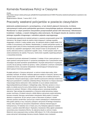 Komenda Powiatowa Policji w Cieszynie Źródło: http://www.cieszyn.slaska.policja.gov.pl/ka6/informacje/wiadomosci/172067,Pracowity-weekend-policjantow-w-powiecie-cies zynskim.html Wygenerowano: Wtorek, 7 marca 2017, 17:33 Pracowity weekend policjantów w powiecie cieszyńskim Jedenastu podejrzewanych o przestępstwa, w tym dwóch pijanych kierowców, to bilans zatrzymanych osób przez policjantów garnizonu cieszyńskiego podczas minionego weekendu. Mundurowi w całym powiecie cieszyńskim przeprowadzili ponad 150 interwencji. Odnotowano kradzieże i rozboje, a nawet nielegalny ubój zwierzęcia. Na drogach doszło do siedmiu kolizji i jednego wypadku drogowego z udziałem pojazdu zaprzęgowego. Od piątkowego popołudnia do niedzieli policjanci w powiecie przeprowadzili ponad 150 interwencji. Na drogach doszło do siedmiu kolizji drogowych i jednego wypadku drogowego, w którym 1 osoby została ranna. Do zdarzenia doszło w piątek około 13.0 w Wiśle na skrzyżowaniu ulic Malinka i Niedźwiedziej. Z ustaleń policjantów wynika, że kierująca oplem astrą 32-letnia mieszkanka powiatu gliwickiego podczas wyprzedzania zderzyła się z pojazdem zaprzęgowym, który skręcał w lewo na skrzyżowaniu. W wyniku zderzenia woźnica z pasażerem wypadli z wozu. 72-letni pasażer został ranny i został przewieziony do szpitala. Przyczyny i okoliczności wypadku wyjaśniają policjanci z cieszyńskiej komendy. W weekend kryminalni odnotowali 3 kradzieże i 2 rozboje. W tym czasie policjanci w całym powiecie zatrzymali łącznie 11 sprawców przestępstw oraz 3 poszukiwane osoby ukrywające się przed wymiarem sprawiedliwości. W grupie zatrzymanych na gorącym uczynku lub po pościgu znaleźli się sprawcy: rozboi, posiadania i przemytu narkotyków, uszkodzenia mienia, naruszenia nietykalności interweniujących funkcjonariuszy i dwóch pijanych kierowców pojazdów. W piątek policjanci z Cieszyna zatrzymali w centrum miasta dwie osoby, które posiadały narkotyki. W sobotę i niedzielę zgłoszono rozboje w Cieszynie. Sprawcy obu zdarzeń zostali zatrzymani przez policjantów. W sobotę rano w Istebnej Gańczorce, mieszkaniec Cieszyna spacerujący z psem natrafił na porzucone zwierzęce wnętrzności. Mężczyzna powiadomił o znalezisku wiślańską Policję. Mundurowi na miejsce skierowali miejscowego lekarza weterynarii, który stwierdził, że są to wołowe wnętrzności. Najprawdopodobniej pochodzące z nielegalnego uboju. Nieznany sprawca w nocy z piątku na sobotę wyrzucił je przy leśnej drodze w rejonie Olzy. Wnętrzności zostały zabrane do utylizacji. Policjanci z Wisły ustalają sprawcę i poszukują świadków zdarzenia. Tego samego dnia popołudniu w Cieszynie został zatrzymany kolejny amator marihuany. W sobotni wieczór w Wiśle Malince zatrzymany został nietrzeźwy kierowca renaulta. Kierujący samochodem mieszkaniec Wisły prawie 2,3 promila alkoholu w organizmie. W tym samym czasie w Skoczowie na jednym z osiedli nieznany sprawca ukradł fiata i porzucił go w stanie uszkodzonym w Harbutowicach. Kilka godzin później w nocy cieszyńscy policjanci zatrzymali 25-letniego mieszkańca miasta, który dopuścił się naruszenia nietykalności cielesnej interweniujących funkcjonariuszy. W niedzielę rano w Chybiu przy ulicy Kolejowej zgłoszono kradzież roweru o wartości około 600 złotych. Popołudniu mieszkaniec Wisły zgłosił uszkodzenie samochodu przez mieszkańca Mnicha. Do zdarzenia doszło w centrum miasta. Właściciel volvo oszacował straty na blisko 1000 złotych. Po 17.00 w Koniakowie stróże prawa zatrzymali nietrzeźwego kierowcę renaulta. Badanie stanu trzeźwości 32-letniego mieszkańca Koniakowa wykazało ponad 2,5 promila alkoholu w jego organizmie. Wieczorem w Bąkowie na ulicy Głównej policjanci drogówki zatrzymali 44-letniego mieszkańca Czeladzi, który kierował samochodem pomimo decyzji właściwego organu o cofnięciu uprawnień do kierowania pojazdami. Większość zatrzymanych w weekend sprawców usłyszała już zarzuty i wkrótce ich sprawa trafi do sądu. Ocena: 0/5 (0) Tweetnij