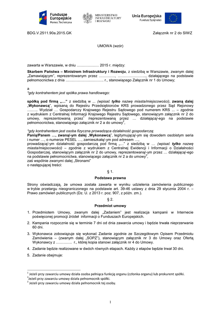 BDG.V.2511.90a.2015.GK Załącznik nr 2 do SIWZ UMOWA (wzór) zawarta w Warszawie, w dniu ……………… 2015 r. między: Skarbem Państwa – Ministrem Infrastruktury i Rozwoju, z siedzibą w Warszawie, zwanym dalej „Zamawiającym”, reprezentowanym przez …………., ………………….., działającego na podstawie pełnomocnictwa z dnia …………………………. r., stanowiącego Załącznik nr 1 do Umowy; a *gdy kontrahentem jest spółka prawa handlowego: spółką pod firmą „…” z siedzibą w ... (wpisać tylko nazwę miasta/miejscowości), zwaną dalej „Wykonawcą”, wpisaną do Rejestru Przedsiębiorców KRS prowadzonego przez Sąd Rejonowy ….….. Wydział … Gospodarczy Krajowego Rejestru Sądowego pod numerem KRS ... – zgodnie z wydrukiem z Centralnej Informacji Krajowego Rejestru Sądowego, stanowiącym załącznik nr 2 do 1 umowy, reprezentowaną przez /reprezentowaną przez … działającą/-ego na podstawie 2 pełnomocnictwa, stanowiącego załącznik nr 2 a do umowy , *gdy kontrahentem jest osoba fizyczna prowadząca działalność gospodarczą: Panią/Panem …, zwaną/-ym dalej „Wykonawcą”, legitymującą/-ym się dowodem osobistym seria i numer …, o numerze PESEL …, zamieszkałą/-ym pod adresem …, prowadzącą/-ym działalność gospodarczą pod firmą „…” z siedzibą w … (wpisać tylko nazwę miasta/miejscowości) – zgodnie z wydrukiem z Centralnej Ewidencji i Informacji o Działalności Gospodarczej, stanowiącym załącznik nr 2 do umowy, reprezentowaną/-ym przez … działającą/-ego 3 na podstawie pełnomocnictwa, stanowiącego załącznik nr 2 a do umowy , zaś wspólnie zwanymi dalej „Stronami” o następującej treści: § 1. Podstawa prawna Strony oświadczają, Ŝe umowa została zawarta w wyniku udzielenia zamówienia publicznego w trybie przetargu nieograniczonego na podstawie art. 39-46 ustawy z dnia 29 stycznia 2004 r. – Prawo zamówień publicznych (Dz. U. z 2013 r. poz. 907, z późn. zm.). § 2. Przedmiot umowy 1. Przedmiotem Umowy, zwanym dalej „Zadaniem” jest realizacja kampanii w Internecie poświęconej promocji źródeł informacji o Funduszach Europejskich. 2. Kampania rozpocznie się w terminie 7 dni od dnia zawarcia umowy i będzie trwała nieprzerwanie 60 dni. 3. Wykonawca zobowiązuje się wykonać Zadanie zgodnie ze Szczegółowym Opisem Przedmiotu Zamówienia – (zwanym dalej „SOPZ”), stanowiącym załącznik nr 3 do Umowy oraz Ofertą Wykonawcy z …………. r., której kopia stanowi załącznik nr 4 do Umowy. 4. Zadanie będzie realizowane w dwóch równych etapach. KaŜdy z etapów będzie trwał 30 dni. 5. Zadanie obejmuje: 1 Jeżeli przy zawarciu umowy działa osoba pełniąca funkcję organu (członka organu) lub prokurent spółki. Jeżeli przy zawarciu umowy działa pełnomocnik spółki. 3 Jeżeli przy zawarciu umowy działa pełnomocnik tej osoby. 2 1 1) Zaplanowanie realizacji Zadania, w tym przygotowanie tekstów reklamowych, zgodnie z punktem IV.1) SOPZ stanowiącym załącznik nr 3 do Umowy. 2) Zakup mediów, prowadzenie i rozliczenie kampanii w Internecie, zgodnie z punktem IV.2) SOPZ, stanowiącym załącznik nr 3 do Umowy, i prowadzonej przy uŜyciu narzędzi: a) reklama w wyszukiwarce Google, b) reklama w serwisie Facebook, c) reklama na serwisie YouTube z wykorzystaniem formatu TrueView in-stream video ad (pre-roll), d) reklama video (in-stream, pre-roll), e) Reklama bannerowa. 3) Osiągnięcie wskaźników określonych w § 3, w załączniku nr 1 do SOPZ oraz w ofercie Wykonawcy. 4) Przygotowanie raportów zgodnie z zapisami punktu IV.6) SOPZ, stanowiącego załącznik nr 3 do Umowy: a) za pierwszy etap realizacji Zadania w terminie do 7 dni od zakończenia pierwszego etapu, b) końcowego w terminie 14 dni od zakończenia realizacji Zadania. § 3. Parametry kampanii Zadanie uwaŜa się za naleŜycie zrealizowane, jeŜeli zostaną spełnione łącznie następujące warunki: 1) liczba kliknięć uzyskanych za pośrednictwem reklam w wyszukiwarce Google wyniesie nie mniej niŜ ………….., z czego nie mniej niŜ …………. kliknięć zostanie uzyskanych w pierwszych 30 dniach trwania kampanii, tj. do……………... 2) liczba kliknięć uzyskanych za pośrednictwem reklam w serwisie Facebook wyniesie nie mniej niŜ………………., z czego nie mniej niŜ …………… kliknięć zostanie uzyskanych w pierwszych 30 dniach trwania kampanii tj. do…………….. 3) liczba obejrzeń filmu powyŜej 10 sekund uzyskanych za pośrednictwem reklam w serwisie Facebook wyniesie nie mniej niŜ…………. z czego nie mniej niŜ …………… obejrzeń powyŜej 10 sekund zostanie uzyskanych w pierwszych 30 dniach trwania kampanii tj. do……………. 4) liczba pełnych odtworzeń filmu uzyskanych za pośrednictwem reklam na serwisie YouTube z wykorzystaniem formatu TrueView in-stream video ad (pre-roll) wyniesienie nie mniej niŜ …………, z czego nie mniej niŜ …………… pełnych odtworzeń zostanie uzyskanych w pierwszych 30 dniach trwania kampanii tj. do………………….. 5) liczba emisji filmu uzyskanych za pośrednictwem reklam video (in-stream, pre-roll) wyniesienie nie mniej niŜ…………., z czego nie mniej niŜ …………… emisji zostanie uzyskanych w pierwszych 30 dniach trwania kampanii tj. do……………………… 6) liczba emisji reklamy bannerowej wyniesie nie mniej niŜ……………. emisji, z czego nie mniej niŜ ……….emisji zostanie uzyskanych w pierwszych 30 dniach trwania kampanii tj. do …………… § 4. Obowiązki Wykonawcy 1. Wykonawca zobowiązuje się wykonać Zadanie na najwyŜszym, profesjonalnym poziomie, zgodnie z obowiązującymi przepisami prawa oraz z interesami Zamawiającego. 2 2. Wykonawca zobowiązuje się do współpracy z Zamawiającym przez cały czas realizacji Zadania. 3. Wykonawca moŜe powierzyć wykonanie Zamówienia podwykonawcom. 4. Za działania lub zaniechania 