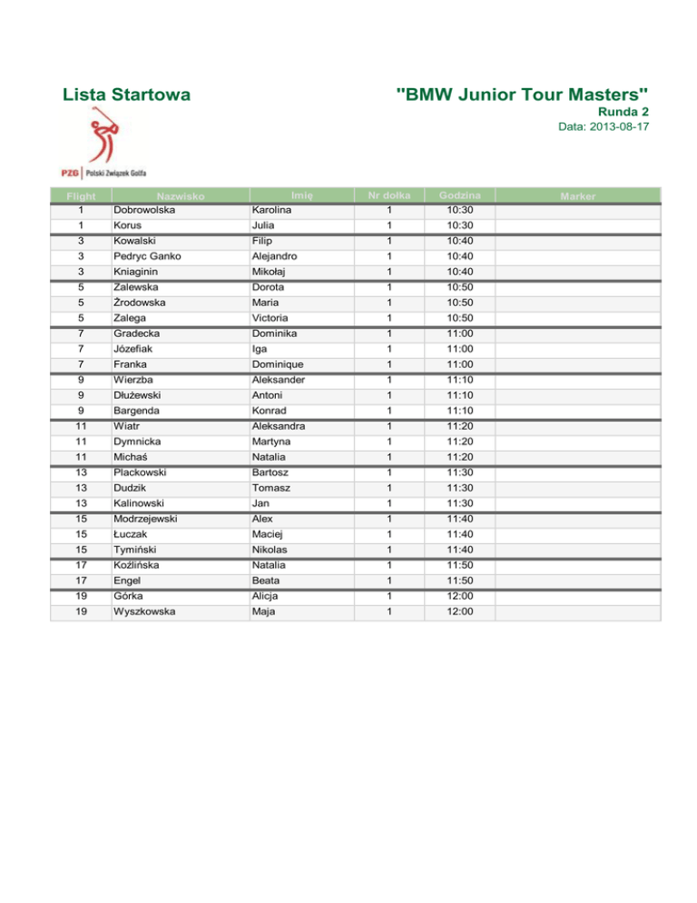 Lista Startowa ''BMW Junior Tour Masters'' Runda 2 Data: 2013-08-17 Nazwisko Dobrowolska Imię Karolina Nr dołka 1 Godzina 10:30 1 Korus 3 Kowalski Julia 1 10:30 Filip 1 10:40 3 Pedryc Ganko Alejandro 1 10:40 3 Kniaginin Mikołaj 1 10:40 5 Zalewska Dorota 1 10:50 5 Żrodowska Maria 1 10:50 5 Zalega Victoria 1 10:50 7 Gradecka Dominika 1 11:00 7 Józefiak Iga 1 11:00 7 Franka Dominique 1 11:00 9 Wierzba Aleksander 1 11:10 9 Dłużewski Antoni 1 11:10 9 Bargenda Konrad 1 11:10 11 Wiatr Aleksandra 1 11:20 11 Dymnicka Martyna 1 11:20 11 Michaś Natalia 1 11:20 13 Plackowski Bartosz 1 11:30 13 Dudzik Tomasz 1 11:30 13 Kalinowski Jan 1 11:30 15 Modrzejewski Alex 1 11:40 15 Łuczak Maciej 1 11:40 15 Tymiński Nikolas 1 11:40 17 Koźlińska Natalia 1 11:50 17 Engel Beata 1 11:50 19 Górka Alicja 1 12:00 19 Wyszkowska Maja 1 12:00 Flight 1 Marker