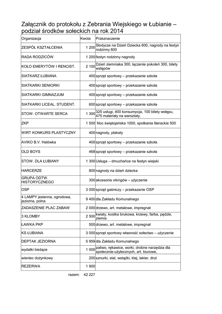 Załącznik do protokołu z Zebrania Wiejskiego w Łubianie – podział środków sołeckich na rok 2014 Organizacja Kwota Przeznaczenie Słodycze na Dzień Dziecka 600, nagrody na festyn rodzinny 600 ZESPÓŁ KSZTAŁCENIA 1 200 RADA RODZICÓW 1 200 festyn rodzinny nagrody KOŁO EMERYTÓW I RENCIST. 2 100 Dzień ziemniaka 300, łączenie pokoleń 300, bilety wstępów SIATKARZ ŁUBIANA 400 sprzęt sportowy – przekazanie szkoła SIATKARKI SENIORKI 400 sprzęt sportowy – przekazanie szkoła SIATKARKI GIMNAZJUM 400 sprzęt sportowy – przekazanie szkoła SIATKARKI LICEAL. STUDENT. 600 sprzęt sportowy – przekazanie szkoła 325 usługi, 400 konsumpcja, 100 bilety wstępu, 475 materiały na warsztaty. STOW. OTWARTE SERCA 1 300 ZKP 1 500 Noc świętojańska 1000, spotkania literackie 500 WIRT KONKURS PLASTYCZNY 400 nagrody, plakaty AVIKO B.V. Halówka 400 sprzęt sportowy – przekazanie szkoła OLD BOYS 468 sprzęt sportowy – przekazanie szkoła STOW. DLA ŁUBIANY 1 300 Usługa – dmuchańce na festyn wiejski HARCERZE 800 nagrody na dzień dziecka GRUPA ODTW. HISTORYCZNEGO 300 akcesoria vikingów – użyczenie OSP 3 000 sprzęt gaśniczy – przekazanie OSP 4 LAMPY jesienna, ogrodowa, jeziorna, polna 9 400 dla Zakładu Komunalnego ZADASZENIE PLAC ZABAW 2 000 drzewo, art. metalowe, impregnat 3 KLOMBY 2 500 ŁAWKA PKP kwiaty, kostka brukowa, krzewy, farba, pędzle, ziemia 500 drzewo, art. metalowe, impregnat KS ŁUBIANA 3 000 sprzęt sportowy własność sołectwo – użyczenie DEPTAK JEZIORNA 5 959 dla Zakładu Komunalnego wydatki bieżące 1 000 wieniec dożynkowy paliwo, rękawice, worki, drobne narzędzia dla społecznie-użytecznych, art. biurowe, 200 sznurki, stal, wstążki, klej, lakier, drut REZERWA 1 900 razem: 42 227