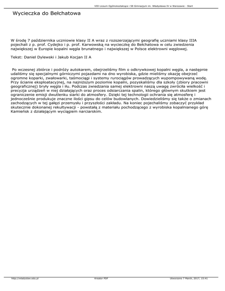 VIII Liceum Ogólnokształcące i 58 Gimnazjum im. Władysława IV w Warszawie - Start Wycieczka do Bełchatowa W środę 7 października uczniowie klasy II A wraz z rozszerzającymi geografię uczniami klasy IIIA pojechali z p. prof. Cydejko i p. prof. Karwowską na wycieczkę do Bełchatowa w celu zwiedzenia największej w Europie kopalni węgla brunatnego i największej w Polsce elektrowni węglowej. Tekst: Daniel Dylewski i Jakub Kocjan II A Po wczesnej zbiórce i podróży autokarem, obejrzeliśmy film o odkrywkowej kopalni węgla, a następnie udaliśmy się specjalnymi górniczymi pojazdami na dno wyrobiska, gdzie mieliśmy okazję obejrzeć ogromne koparki, zwałowarki, taśmociągi i systemy rurociągów prowadzących wypompowywaną wodę. Przy ścianie eksploatacyjnej, na najniższym poziomie kopalni, pozyskaliśmy dla szkoły (zbiory pracowni geograficznej) bryły węgla i iłu. Podczas zwiedzania samej elektrowni naszą uwagę zwróciła wielkość i precyzja urządzeń w niej działających oraz proces odsiarczania spalin, którego głównym skutkiem jest ograniczenie emisji dwutlenku siarki do atmosfery. Dzięki tej technologii ochrania się atmosferę i jednocześnie produkuje znaczne ilości gipsu do celów budowlanych. Dowiedzieliśmy się także o zmianach zachodzących w tej gałęzi przemysłu i przyszłości zakładu. Na koniec pojechaliśmy zobaczyć przykład skutecznie dokonanej rekultywacji - powstałą z materiału pochodzącego z wyrobiska kopalnianego górę Kamieńsk z działającym wyciągiem narciarskim. http://wladyslaw.edu.pl Kreator PDF Utworzono 7 March, 2017, 15:41