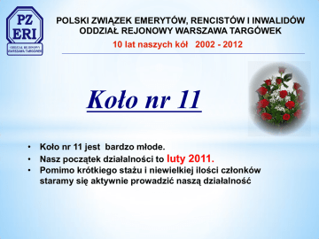 POLSKI ZWIĄZEK EMERYTÓW, RENCISTÓW I INWALIDÓW ODDZIAŁ REJONOWY WARSZAWA TARGÓWEK 10 lat naszych kół 2002 - 2012 Koło nr 11 • Koło nr 11 jest bardzo młode. • Nasz początek działalności to luty 2011. • Pomimo krótkiego stażu i niewielkiej ilości członków staramy się aktywnie prowadzić naszą działalność POLSKI ZWIĄZEK EMERYTÓW, RENCISTÓW I INWALIDÓW ODDZIAŁ REJONOWY WARSZAWA TARGÓWEK 10 lat naszych kół 2002 - 2012 Koło nr 11 • Na pierwszym spotkaniu było zaledwie 10 osób. Pierwszą siedzibą był klub RSM PRAGA – „RAZEM”. • Początek naszej działalności to koncert pani Doroty i Dariusza Smolińskich, którzy grali znane piosenki na wiolonczeli i altówce zapraszając całą salę do wspólnego śpiewania. • Żeby bardziej się zaprzyjaźnić organizowaliśmy wspólne wyjścia do ZOO, na spacer do ogrodów Biblioteki Uniwersytetu Warszawskiego, Parku Praskiego. POLSKI ZWIĄZEK EMERYTÓW, RENCISTÓW I INWALIDÓW ODDZIAŁ REJONOWY WARSZAWA TARGÓWEK 10 lat naszych kół 2002 - 2012 Koło nr 11 • Wiadomość o naszej działalności rozchodziła się po okolicy, zaczęło przybywać nam członków. • Należało coś zrobić, żeby wszystkich zachęcić do współpracy • Tym razem była to wycieczka statkiem do Serocka. Pogoda, atmosfera świetna. Wszyscy byli bardzo zadowoleni. • Przy małej ilości członków trudno było nam organizować wycieczki autokarowe, dlatego korzystaliśmy z imprez w innych kołach, najlepiej z Kołem nr 15. POLSKI ZWIĄZEK EMERYTÓW, RENCISTÓW I INWALIDÓW ODDZIAŁ REJONOWY WARSZAWA TARGÓWEK 10 lat naszych kół 2002 - 2012 Koło nr 11 • W połowie 2011 roku dowiedzieliśmy się, że nasza siedziba - klub Razem - zostaje zamknięty, a my zostajemy na „bruku”. • Nie pomogły starania w spółdzielni, pomimo zapewnień Prezesa nie udało się uzyskać lokalu bo były sprzeciwy mieszkańców, na propozycje do zaadoptowania piwnicy, zupełnie nieuzasadnione. • Po wielu staraniach lokal na określone godziny udostępnił nam OPS przy Pl. Hallera. Od tej chwili organizujemy większe imprezy świąteczne razem z kierowniczką klubu Złotego Wieku Panią Kasią POLSKI ZWIĄZEK EMERYTÓW, RENCISTÓW I INWALIDÓW ODDZIAŁ REJONOWY WARSZAWA TARGÓWEK 10 lat naszych kół 2002 - 2012 Koło nr 11 • Często dostajemy zaproszenia na akcje 50+ Aktywna Praga, • są to spacery po Pradze np. „ Filmowa Praga”, gdzie można zobaczyć praskie plenery wykorzystywane przez filmowców, • poznać kamienicę, gdzie mieszkał j, Cyrankiewicz z Niną Andrycz. POLSKI ZWIĄZEK EMERYTÓW, RENCISTÓW I INWALIDÓW ODDZIAŁ REJONOWY WARSZAWA TARGÓWEK 10 lat naszych kół 2002 - 2012 Koło nr 11 • W kawiarni „Sens Nonsensu” możemy posłuchać, pośpiewać i potańczyć jak na dawnej Pradze. • Jako ostatnią imprezą 2011 roku było spotkanie mikołajkowo-świąteczne w rosyjskiej kawiarni ”Skamiejka”. • Były pielmieni/ ruskie pierożki/ z mięsem, śmietaną i bardzo ostrą musztardą, herbata z samowara z konfiturami, muzyka Okudżawy i kolędy. • Tak zakończył się pierwszy rok naszej działalności. POLSKI ZWIĄZEK EMERYTÓW, RENCISTÓW I INWALIDÓW ODDZIAŁ REJONOWY WARSZAWA TARGÓWEK 10 lat naszych kół 2002 - 2012 Koło nr 11 • Rok 2012 jest drugim rokiem naszej działalności • Liczba członków naszego koła zwiększyła się do 35 osób. • W okresie zimowym organizowaliśmy spotkania z parapsychologii. • Wykłady prowadziła nasza koleżanka z koła Zosia Waszkiewicz. Ta tematyka wzbudziła duże zainteresowanie i będzie dalej kontynuowana • W czasie karnawału wielu członków naszego koła uczestniczyło w zabawie przebierańców organizowanej przez zespół „Praskie Małmazyje” w Domu Kultury Praga. • Współpraca zaowocowała tym. że 5 osób z zespołu jest uczestnikami naszego koła. POLSKI ZWIĄZEK EMERYTÓW, RENCISTÓW I INWALIDÓW ODDZIAŁ REJONOWY WARSZAWA TARGÓWEK 10 lat naszych kół 2002 - 2012 Koło nr 11 • Następną udaną uroczystością było spotkanie Wielkanocne, zorganizowane razem z Klubem Złotego Wieku. • W spotkaniu wziął udziel Prezes z małżonką, Dyrektor OSiR-u, przyjaciel koła z Bułgarii Piotr z małżonką, oraz inni zaproszeni goście. • W maju po raz drugi wyjechaliśmy na wycieczkę statkiem do Serocka. Pogoda była wspaniała, a całą imprezę uświetniło wspólne śpiewanie. • Do zabawy udało się wciągnąć innych uczestników wycieczki od 5do 80 lat. POLSKI ZWIĄZEK EMERYTÓW, RENCISTÓW I INWALIDÓW ODDZIAŁ REJONOWY WARSZAWA TARGÓWEK 10 lat naszych kół 2002 - 2012 Koło nr 11 • Członkowie biorą czynny udział w imprezach organizowanych przez Zarząd. jak i inne koła. • W święto Kupały w Kamieńczyku zdobyliśmy trzy nagrody, za stroje, za wianek, za występ. • Po przerwie wakacyjnej wszyscy członkowie koła z chęcią przystąpili do dalszej współpracy. • W dalszych planach mamy wyjścia do muzeów, i teatrów, oraz kina. • Pomimo krótkiego stażu udało nam się dać wielu seniorom trochę radości, pokazać, że nie są samotni, mogą porozmawiać z innymi, wyjść do teatru czy na spacer w towarzystwie. POLSKI ZWIĄZEK EMERYTÓW, RENCISTÓW I INWALIDÓW ODDZIAŁ REJONOWY WARSZAWA TARGÓWEK 10 lat naszych kół 2002 - 2012 Koło nr 11 POLSKI ZWIĄZEK EMERYTÓW, RENCISTÓW I INWALIDÓW ODDZIAŁ REJONOWY WARSZAWA TARGÓWEK 10 lat naszych kół 2002 - 2012 Koło nr 11 POLSKI ZWIĄZEK EMERYTÓW, RENCISTÓW I INWALIDÓW ODDZIAŁ REJONOWY WARSZAWA TARGÓWEK 10 lat naszych kół 2002 - 2012 Koło nr 11