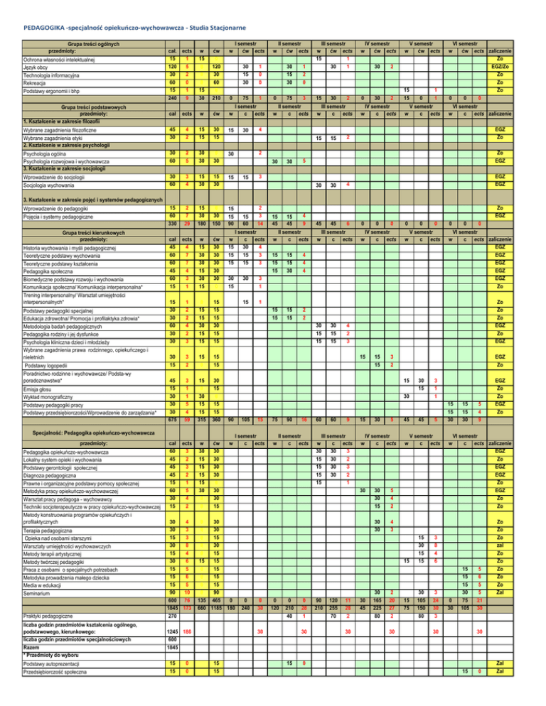 PEDAGOGIKA -specjalność opiekuńczo-wychowawcza - Studia Stacjonarne Grupa treści ogólnych przedmioty: cał. ects 15 1 120 5 30 2 60 0 15 1 240 9 w 15 0 0 0 15 30 ćw 0 120 30 60 0 210 w cał ects w ćw w Wybrane zagadnienia filozoficzne Wybrane zagadnienia etyki 2. Kształcenie w zakresie psychologii 45 30 4 2 15 15 30 15 15 Psychologia ogólna Psychologia rozwojowa i wychowawcza 3. Kształcenie w zakresie socjologii 30 60 2 5 30 30 0 30 30 Wprowadzenie do socjologii Socjologia wychowania 30 60 3 4 15 30 15 30 15 15 60 330 2 7 29 15 30 180 0 30 150 15 15 90 Ochrona własności intelektualnej Język obcy Technologia informacyjna Rekreacja Podstawy ergonomii i bhp Grupa treści podstawowych przedmioty: 1. Kształcenie w zakresie filozofii I semestr ćw ects 0 30 15 30 1 0 0 75 1 I semestr c ects 30 w II semestr ćw ects 0 w 30 15 30 1 2 0 75 3 II semestr c ects III semestr w ćw ects 15 1 30 1 15 w 30 2 III semestr c ects w IV semestr ćw ects 0 w 30 2 30 2 IV semestr c ects w 15 15 w V semestr ćw ects 0 1 1 V semestr c ects VI semestr ćw ects zaliczenie Zo EGZ/Zo Zo Zo Zo 0 0 0 w w VI semestr c ects zaliczenie 4 15 15 EGZ Zo 2 2 30 15 30 Zo EGZ 5 3 30 30 EGZ EGZ 4 3. Kształcenie w zakresie pojęć i systemów pedagogicznych Wprowadzenie do pedagogiki Pojęcia i systemy pedagogiczne Grupa treści kierunkowych przedmioty: Historia wychowania i myśli pedagogicznej Teoretyczne podstawy wychowania Teoretyczne podstawy kształcenia Pedagogika społeczna Biomedyczne podstawy rozwoju i wychowania Komunikacja społeczna/ Komunikacja interpersonalna* Trening interpersonalny/ Warsztat umiejętności interpersonalnych* Podstawy pedagogiki specjalnej Edukacja zdrowotna/ Promocja i profilaktyka zdrowia* Metodologia badań pedagogicznych Pedagogika rodziny i jej dysfunkce Psychologia kliniczna dzieci i młodzieży Wybrane zagadnienia prawa rodzinnego, opiekuńczego i nieletnich Podstawy logopedii Poradnictwo rodzinne i wychowawcze/ Podsta-wy poradoznawstwa* Emisja głosu Wykład monograficzny Podstawy pedagogiki pracy Podstawy przedsiębiorczości/Wprowadzenie do zarządzania* cał 45 60 60 45 60 15 ects 4 7 7 4 3 1 w 15 30 30 15 30 15 ćw 30 30 30 30 30 0 15 30 30 60 30 30 1 2 2 4 2 3 0 15 15 30 15 15 15 15 15 30 15 15 30 15 3 2 15 0 15 15 45 15 30 30 30 675 3 1 1 5 4 59 15 0 30 15 15 315 30 15 0 15 15 360 cał 60 45 45 45 15 60 30 15 ects 3 2 3 2 1 5 4 2 w 30 15 15 15 15 30 0 0 ćw 30 30 30 30 0 30 30 15 Pedagogika opiekuńczo-wychowawcza Lokalny system opieki i wychowania Podstawy gerontologii społecznej Diagnoza pedagogiczna Prawne i organizacyjne podstawy pomocy społecznej Metodyka pracy opiekuńczo-wychowawczej Warsztat pracy pedagoga - wychowawcy Techniki socjoterapeutycze w pracy opiekuńczo-wychowawczej Metody konstruowania programów opiekuńczych i profilaktycznych Terapia pedagogiczna Opieka nad osobami starszymi Warsztaty umiejętności wychowawczych Metody terapii artystycznej Metody twórczej pedagogiki Praca z osobami o specjalnych potrzebach Metodyka prowadzenia małego dziecka Media w edukacji Seminarium Praktyki pedagogiczne liczba godzin przedmiotów kształcenia ogólnego, podstawowego, kierunkowego: liczba godzin przedmiotów specjalnościowych Razem * Przedmioty do wyboru Podstawy autoprezentacji Przedsiębiorczość społeczna 30 4 30 3 15 3 30 8 15 4 30 6 15 5 15 6 15 5 90 10 600 76 1845 173 270 30 15 15 15 0 0 30 3 1 15 1 15 45 15 45 II semestr w c ects 15 15 15 15 15 30 4 4 4 15 15 15 15 2 2 Zo EGZ 45 45 6 III semestr w c ects 30 15 15 0 0 0 IV semestr w c ects 0 0 15 15 w 15 75 I semestr c ects w 90 16 II semestr c ects 60 60 9 III semestr w c ects 30 30 3 15 30 2 15 30 3 15 30 2 15 1 15 w 30 5 IV semestr c ects 30 0 30 0 120 0 210 40 0 28 1 30 15 90 210 120 255 70 0 EGZ Zo 30 30 15 5 4 2 30 30 4 3 45 w 15 0 240 0 VI semestr w c ects zaliczenie EGZ EGZ EGZ EGZ EGZ Zo 3 2 30 15 30 105 0 4 2 3 15 90 0 V semestr w c ects Zo Zo Zo EGZ Zo EGZ 15 30 15 15 4 9 30 15 15 0 30 0 30 0 15 0 30 0 15 15 15 0 15 0 15 0 15 0 90 135 465 0 660 1185 180 1245 180 600 1845 2 3 14 I semestr w c ects 15 30 4 15 15 3 15 15 3 Specjalność: Pedagogika opiekuńczo-wychowawcza przedmioty: 15 60 11 28 2 30 30 45 30 165 225 80 2 20 27 2 30 15 75 45 3 1 1 5 V semestr c ects 15 30 15 15 30 105 150 80 15 15 30 w 15 15 30 5 4 9 VI semestr c ects zaliczenie EGZ Zo EGZ EGZ Zo EGZ Zo Zo 3 8 4 6 3 24 30 3 EGZ Zo Zo EGZ Zo 0 30 15 15 15 30 75 105 30 5 6 5 5 21 30 Zo Zo Zo zal Zo Zo Zo Zo Zo Zal 30 0 15 0 Zal Zal