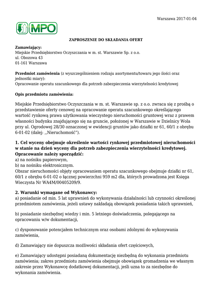 Warszawa 2017-01-04 ZAPROSZENIE DO SKŁADANIA OFERT Zamawiający: Miejskie Przedsiębiorstwo Oczyszczania w m. st. Warszawie Sp. z o.o. ul. Obozowa 43 01-161 Warszawa Przedmiot zamówienia (z wyszczególnieniem rodzaju asortymentu/towaru jego ilości oraz jednostki miary): Opracowanie operatu szacunkowego dla potrzeb zabezpieczenia wierzytelności kredytowej Opis przedmiotu zamówienia: Miejskie Przedsiębiorstwo Oczyszczania w m. st. Warszawie sp. z o.o. zwraca się z prośbą o przedstawienie oferty cenowej na opracowanie operatu szacunkowego określającego wartość rynkową prawa użytkowania wieczystego nieruchomości gruntowej wraz z prawem własności budynku znajdującego się na gruncie, położonej w Warszawie w Dzielnicy Wola przy ul. Ogrodowej 28/30 oznaczonej w ewidencji gruntów jako działki nr 61, 60/1 z obrębu 6-01-02 (dalej: ,,Nieruchomość”). 1. Cel wyceny obejmuje określenie wartości rynkowej przedmiotowej nieruchomości w stanie na dzień wyceny dla potrzeb zabezpieczenia wierzytelności kredytowej. Opracowanie należy sporządzić: a) na nośniku papierowym, b) na nośniku elektronicznym. Obszar nieruchomości objęty opracowaniem operatu szacunkowego obejmuje działki nr 61, 60/1 z obrębu 6-01-02 o łącznej powierzchni 959 m2 dla, których prowadzona jest Księga Wieczysta Nr WA4M/00405209/9. 2. Warunki wymagane od Wykonawcy: a) posiadanie od min. 5 lat uprawnień do wykonywania działalności lub czynności określonej przedmiotem zamówienia, jeżeli ustawy nakładają obowiązek posiadania takich uprawnień, b) posiadanie niezbędnej wiedzy i min. 5 letniego doświadczenia, polegającego na opracowaniu w/w dokumentacji, c) dysponowanie potencjałem technicznym oraz osobami zdolnymi do wykonywania zamówienia, d) Zamawiający nie dopuszcza możliwości składania ofert częściowych, e) Zamawiający udostępni posiadaną dokumentację niezbędną do wykonania przedmiotu zamówienia; zakres przedmiotu zamówienia obejmuje obowiązek gromadzenia we własnym zakresie przez Wykonawcę dodatkowej dokumentacji, jeśli uzna to za niezbędne do wykonania zamówienia. 3. Wymagane dokumenty: a) wykaz dokonywanych w okresie ostatnich 3 lat co najmniej 3 usług odpowiadających swoim rodzajem i wartością usługom stanowiącym przedmiot zamówienia, z podaniem ich wartości, przedmiotu, dat wykonania i odbiorców oraz załączenie dokumentów potwierdzających, że usługi te zostały wykonane należycie np. referencje, b) dokumenty stwierdzające, że osoby, które będą uczestniczyć w wykonaniu zamówienia, posiadają od min. 5 lat wymagane uprawnienia, tj. świadectwo nadania uprawnień zawodowych w zakresie szacowania nieruchomości, c) aktualny na dzień składania oferty wydruk odpowiadający aktualnemu odpisowi z właściwego rejestru lub aktualny na dzień składania oferty wydruk odpowiadający zaświadczeniu o wpisie do ewidencji działalności gospodarczej, d) dokument potwierdzający, że wykonawca jest ubezpieczony od odpowiedzialności cywilnej w zakresie prowadzonej działalności związanej z przedmiotem zamówienia. Niniejsze zapytanie ofertowe nie stanowi zobowiązania do zawarcia umowy przez Miejskie Przedsiębiorstwo Oczyszczania w m.st. Warszawie sp. z o.o. Wymagany termin realizacji zamówienia: 2017-01-25. Termin składania ofert upływa w dn.: 2017-01-10 o godz. 15:00 Osoba do kontaktu w sprawie zamówienia z ramienia komórki metorycznie odpowiedzialnej za przedmiot zamówienia: Agnieszka Łuba Tel. kontaktowy: 22 3910 193 Oferty należy nadesłać w jednej z następujących form: - drogą mailową na adres: [email protected] - faxem pod numer: (22) 3910 293 - w formie pisemnej: ul. Obozowa 43, pok. 16 Ocena ofert będzie dokonywana na podstawie następujących kryteriów: - cena - 60 % - doświadczenie - 40 % Zapraszamy do składania ofert.