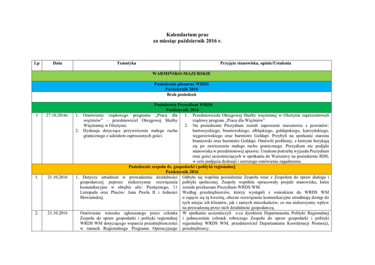 Kalendarium prac za miesiąc październik 2016 r. Lp Data Przyjęte stanowiska, opinie/Ustalenia Tematyka WARMIŃSKO-MAZURSKIE Posiedzenia plenarne WRDS Październik 2016 Brak posiedzeń 1 27.10.2016r. 1. 21.10.2016 2. 21.10.2016 Posiedzenia Prezydium WRDS Październik 2016 1. Omówienie rządowego programu „Praca dla 1. Przedstawiciele Okręgowej Służby więziennej w Olsztynie zaprezentowali więźniów” – przedstawiciel Okręgowej Służby rządowy program „Praca dla Więźniów”. Więziennej w Olsztynie. 2. Na posiedzenie Prezydium zostali zaproszeni starostowie z powiatów: 2. Dyskusja dotycząca przywrócenia małego ruchu bartoszyckiego, braniewskiego, elbląskiego, gołdapskiego, kętrzyńskiego, granicznego z udziałem zaproszonych gości. węgorzewskiego oraz burmistrz Gołdapi. Przybyli na spotkanie starosta braniewski oraz burmistrz Gołdapi. Omówili problemy, z którymi borykają się po zawieszeniu małego ruchu granicznego. Prezydium nie podjęło stanowiska w przedmiotowej sprawie. Ustalono potrzebę wyjazdu Prezydium oraz gości uczestniczących w spotkaniu do Warszawy na posiedzenie RDS, w celu podjęcia dyskusji i szerszego omówienia zagadnienia. Posiedzenie zespołu ds. gospodarki i polityki regionalnej Październik 2016 1. Dotyczy utrudnień w prowadzeniu działalności Odbyło się wspólne posiedzenie Zespołu wraz z Zespołem do spraw dialogu i gospodarczej poprzez niekorzystne rozwiązania polityki społecznej. Zespoły wspólnie opracowały projekt stanowiska, które komunikacyjne w obrębie ulic: Pieniężnego, 11 zostało przekazane Prezydium WRDS WM. Listopada oraz Placów: Jana Pawła II i Jedności Według przedsiębiorców, którzy wystąpili z wnioskiem do WRDS WM Słowiańskiej. o zajęcie się tą kwestią, obecne rozwiązania komunikacyjne utrudniają dostęp do tych miejsc ich klientów, jak i samych mieszkańców, co ma niekorzystny wpływ na prowadzoną przez nich działalność gospodarczą. Omówienie wniosku zgłoszonego przez członka W spotkaniu uczestniczyli z-ca dyrektora Departamentu Polityki Regionalnej Zespołu do spraw gospodarki i polityki regionalnej i jednocześnie członek roboczego Zespołu do spraw gospodarki i polityki WRDS WM dotyczącego wsparcia przedsiębiorczości regionalnej WRDS WM, przedstawiciel Departamentu Koordynacji Promocji, w ramach Regionalnego Programu Operacyjnego przedsiębiorcy. Województwa Warmińsko-Mazurskiego na lata 20142020. 1. 21.10.2016 2. 21.10.2016 Zostały omówione możliwości pozyskania środków z UE przez przedsiębiorców spoza obszarów inteligentnych specjalizacji zidentyfikowanych dla województwa warmińsko-mazurskiego w Strategii rozwoju społecznogospodarczego województwa warmińsko-mazurskiego do roku 2025. Postanowiono kontynuować podjęty temat w II połowie listopada. Posiedzenie zespołu ds. dialogu i polityki społecznej Październik 2016 1. Wybór Z-cy Przewodniczącego Zespołu do spraw 1. Nie dokonano wyboru Z-cy. dialogu i polityki społecznej WRDS WM. 2. Podjęto decyzje o organizacji debaty na temat wyzwań w zakresie opieki 1. Omówienie wyzwań w zakresie opieki długoterminowej dla osób starszych wspólnie z Zespołem do spraw ochrony długoterminowej nad osobami starszymi. zdrowia WRDS WM. Dotyczy utrudnień w prowadzeniu działalności gospodarczej poprzez niekorzystne rozwiązania komunikacyjne w obrębie ulic: Pieniężnego, 11 Listopada oraz Placów: Jana Pawła II i Jedności Słowiańskiej. Odbyło się wspólne posiedzenie Zespołu wraz z Zespołem do spraw gospodarki i polityki regionalnej. Zespoły wspólnie opracowały projekt stanowiska, które zostało przekazane Prezydium WRDS WM. Według przedsiębiorców, którzy wystąpili z wnioskiem do WRDS WM o zajęcie się tą kwestią, obecne rozwiązania komunikacyjne utrudniają dostęp do tych miejsc ich klientów, jak i samych mieszkańców, co ma niekorzystny wpływ na prowadzoną przez nich działalność gospodarczą.