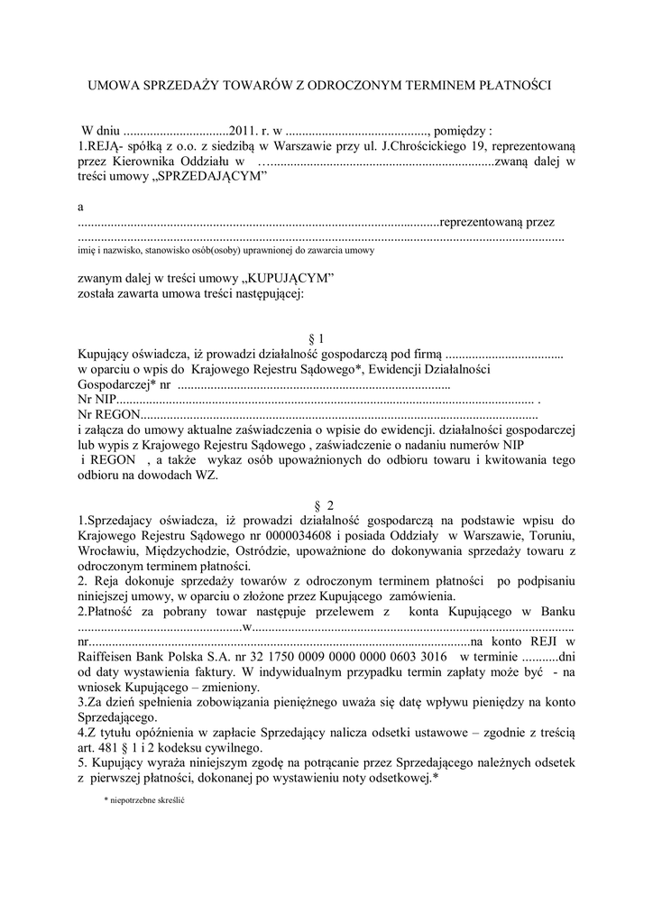 UMOWA SPRZEDAŻY TOWARÓW Z ODROCZONYM TERMINEM PŁATNOŚCI W dniu ................................2011. r. w ..........................................., pomiędzy : 1.REJĄ- spółką z o.o. z siedzibą w Warszawie przy ul. J.Chrościckiego 19, reprezentowaną przez Kierownika Oddziału w …....................................................................zwaną dalej w treści umowy „SPRZEDAJĄCYM” a ..............................................................................................................reprezentowaną przez .................................................................................................................................................... imię i nazwisko, stanowisko osób(osoby) uprawnionej do zawarcia umowy zwanym dalej w treści umowy „KUPUJĄCYM” została zawarta umowa treści następującej: §1 Kupujący oświadcza, iż prowadzi działalność gospodarczą pod firmą .................................... w oparciu o wpis do Krajowego Rejestru Sądowego*, Ewidencji Działalności Gospodarczej* nr ................................................................................... Nr NIP............................................................................................................................... . Nr REGON......................................................................................................................... i załącza do umowy aktualne zaświadczenia o wpisie do ewidencji. działalności gospodarczej lub wypis z Krajowego Rejestru Sądowego , zaświadczenie o nadaniu numerów NIP i REGON , a także wykaz osób upoważnionych do odbioru towaru i kwitowania tego odbioru na dowodach WZ. § 2 1.Sprzedajacy oświadcza, iż prowadzi działalność gospodarczą na podstawie wpisu do Krajowego Rejestru Sądowego nr 0000034608 i posiada Oddziały w Warszawie, Toruniu, Wrocławiu, Międzychodzie, Ostródzie, upoważnione do dokonywania sprzedaży towaru z odroczonym terminem płatności. 2. Reja dokonuje sprzedaży towarów z odroczonym terminem płatności po podpisaniu niniejszej umowy, w oparciu o złożone przez Kupującego zamówienia. 2.Płatność za pobrany towar następuje przelewem z konta Kupującego w Banku ..................................................w.................................................................................................. nr....................................................................................................................na konto REJI w Raiffeisen Bank Polska S.A. nr 32 1750 0009 0000 0000 0603 3016 w terminie ...........dni od daty wystawienia faktury. W indywidualnym przypadku termin zapłaty może być - na wniosek Kupującego – zmieniony. 3.Za dzień spełnienia zobowiązania pieniężnego uważa się datę wpływu pieniędzy na konto Sprzedającego. 4.Z tytułu opóźnienia w zapłacie Sprzedający nalicza odsetki ustawowe – zgodnie z treścią art. 481 § 1 i 2 kodeksu cywilnego. 5. Kupujący wyraża niniejszym zgodę na potrącanie przez Sprzedającego należnych odsetek z pierwszej płatności, dokonanej po wystawieniu noty odsetkowej.* * niepotrzebne skreślić 6.W przypadku opóźnienia w zapłacie Sprzedający może zaprzestać sprzedaży z odroczonym terminem płatności w ogóle bądź do czasu uregulowania przeterminowanej należności wraz z odsetkami. §3 .Kupujący zobowiązuje się zgłaszać wszelkie zmiany dotyczące działalności swojej firmy (zmiana statusu prawnego, wspólników i właściciela oraz numerów NIP, REGON i konta bankowego i.t.p.)niezwłocznie po ich zaistnieniu, nie później jednak niż w ciągu 7 dni. §4 Niniejsza umowa zostaje zawarta na czas zawierania przez strony umów sprzedaży odroczonym terminem płatności z §5 Wszelkie zmiany niniejszej umowy wymagają formy pisemnej §6 W sprawach nie uregulowanych niniejszą umową mają zastosowanie przepisy kodeksu cywilnego. §7 Umowa została sporządzona w dwóch jednobrzmiących egzemplarzach, po jednym dla każdej ze stron. §8 * Jako osoba pozostająca w związku małżeńskim załączam zgodę współmałżonka na zawarcie niniejszej umowy – zgodnie z art.. 37 kodeksu rodzinnego i opiekuńczego. ........................................................... KUPUJĄCY Wyrażam zgodę: .................................................. SPRZEDAJĄCY -............................................................... MAŁŻONEK KUPUJĄCEGO Załączniki: 1.decyzje o nadaniu nr NIP i REGON 2.aktualne zaświadczenie o wpisie do ewidencji działalności gospodarczej lub aktualny wypis z rejestru sądowego ( KRS) 3. upoważnienie do odbioru towaru * niepotrzebne skreślić