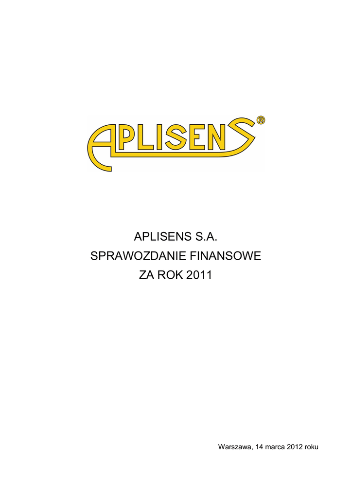 APLISENS S.A. SPRAWOZDANIE FINANSOWE ZA ROK 2011 Warszawa, 14 marca 2012 roku APLISENS S.A. JEDNOSTKOWE SPRAWOZDANIE FINANSOWE ZA OKRES 01.01. – 31.12.2011 R. (wszystkie kwoty podane są w tys. złotych o ile nie podano inaczej) OŚWIADCZENIE ZARZĄDU Na podstawie rozporządzenia Ministra Finansów z dnia 19 lutego 2009 roku w sprawie informacji bieŜących i okresowych przekazywanych przez emitentów papierów wartościowych, Zarząd Spółki oświadcza, Ŝe wedle swojej najlepszej wiedzy, niniejsze sprawozdanie finansowe i dane porównywalne sporządzone zostały zgodnie z obowiązującymi Spółkę zasadami rachunkowości oraz Ŝe odzwierciedlają w sposób prawdziwy, rzetelny i jasny sytuację majątkowa i finansowa Spółki oraz jej wynik finansowy. Zarząd oświadcza takŜe, Ŝe sprawozdanie z działalności emitenta zawiera prawdziwy obraz rozwoju i osiągnięć oraz sytuacji emitenta, w tym opis podstawowych zagroŜeń i ryzyka. Niniejsze sprawozdanie finansowe zostało przygotowane przy zastosowaniu zasad rachunkowości, zgodnie z Międzynarodowymi Standardami Sprawozdawczości Finansowej, które zostały zatwierdzone przez Unię Europejska oraz w zakresie wymaganym przez rozporządzenie Ministra Finansów z dnia 19 lutego 2009 roku w sprawie informacji bieŜących i okresowych przekazywanych przez emitentów papierów wartościowych (Dz. U. Nr 33, poz. 259, z późn. zm.). Sprawozdanie to obejmuje okres od 1 stycznia do 31 grudnia 2011 roku i okres porównywalny od 1 stycznia do 31 grudnia 2010 roku. Zarząd oświadcza, Ŝe podmiot uprawniony do badania sprawozdań finansowych, dokonujący badania sprawozdania finansowego został wybrany zgodnie z przepisami prawa oraz Ŝe podmiot ten i biegli rewidenci, dokonujący tego badania, spełniali warunki do wyraŜenia bezstronnej i niezaleŜnej opinii o badanym rocznym sprawozdaniu finansowym, zgodnie z obowiązującymi przepisami i normami zawodowymi. Zgodnie z przyjętymi przez Zarząd zasadami ładu korporacyjnego, biegły rewident został wybrany przez Radę Nadzorczą uchwałą nr 10/II-5/2010 z dnia 3.11.2010 roku w sprawie wyboru biegłego rewidenta. Rada Nadzorcza dokonała powyŜszego wyboru, mając na uwadze zagwarantowanie pełnej niezaleŜności i obiektywizmu samego wyboru, jak i realizacji zadań przez biegłego rewidenta. Podpis Prezesa Zarządu: Adam śurawski Załączone noty stanowią integralną część niniejszego sprawozdania finansowego 1 APLISENS S.A. JEDNOSTKOWE SPRAWOZDANIE FINANSOWE ZA OKRES 01.01. – 31.12.2011 R. (wszystkie kwoty podane są w tys. złotych o ile nie podano inaczej) WYBRANE DANE FINANSOWE dane w tys. zł Wyszczególnienie 01.01.2011 - 31.12.2011 01.01.2010 - 31.12.2010 PLN PLN EUR EUR RACHUNEK ZYSKÓW I STRAT Przychody netto ze sprzedaŜy produktów, towarów i materiałów Koszt własny sprzedaŜy Zysk (strata) na działalności operacyjnej Zysk (strata) brutto Zysk (strata) netto Liczba udziałów/akcji w sztukach Zysk (strata) netto na akcję zwykłą (zł/euro) BILANS Aktywa trwałe Aktywa obrotowe Kapitał własny Zobowiązania długoterminowe Zobowiązania krótkoterminowe Wartość księgowa na akcję (zł/euro) RACHUNEK PRZEPŁYWÓW PIENIĘśNYCH Przepływy pienięŜne netto z działalności operacyjnej Przepływy pienięŜne netto z działalności inwestycyjnej Przepływy pienięŜne netto z działalności finansowej Kurs EUR/PLN - dla danych bilansowych - dla danych rachunku zysków i strat 54 270 13 108 46 767 11 679 28 479 6 879 25 472 6 361 14 681 3 546 11 655 2 911 15 697 12 467 12 838 505 3 792 3 011 12 838 505 12 397 9 773 12 622 996 3 096 2 441 12 622 996 0,97 0,23 0,77 0,19 41 991 56 743 92 693 703 5 338 7,22 9 507 12 847 20 986 159 1 208 1,63 38 524 43 845 79 096 853 2 420 6,27 9 728 11 071 19 972 215 611 1,58 12 417 2 999 9 363 2 338,17 -12 803 -3 093 -10 410 -2 600 63 15 -23 -6 2011 2010 4,4168 4,1401 3,9603 4,0044 Do przeliczenia danych bilansowych uŜyto kursu średniego NBP na dzień bilansowy. Do przeliczenia pozycji rachunku zysków i strat oraz rachunku przepływów pienięŜnych uŜyto kursu będącego średnią arytmetyczną kursów NBP obowiązujących na ostatni dzień poszczególnych miesięcy danego okresu. Załączone noty stanowią integralną część niniejszego sprawozdania finansowego 2 APLISENS S.A. JEDNOSTKOWE SPRAWOZDANIE FINANSOWE ZA OKRES 01.01. – 31.12.2011 R. (wszystkie kwoty podane są w tys. złotych o ile nie podano inaczej) JEDNOSTKOWE SPRAWOZDANIE FINANSOWE ZA OKRES OD 1 STYCZNIA 2011 R. DO 31 GRUDNIA 2011 R. INFORMACJE OGÓLNE I. Dane jednostki: Podstawowy przedmiot działalności: APLISENS Spółka Akcyjna Spółka Akcyjna ul. Morelowa 7, 03-192 Warszawa Polska Produkcja instrumentów i przyrządów pomiarowych, kontrolnych i nawigacyjnych Organ prowadzący rejestr: Sąd Rejonowy dla miasta st. Warszawy w Warszawie Numer statystyczny REGON: XIII Wydział Gospodarczy Krajowego Rejestru Sądowego Numer KRS: 0000302835 012265485 Nazwa: Forma prawna: Siedziba: Kraj rejestracji: II. Czas trwania Jednostki: Spółka została utworzona na czas nieoznaczony. III. Okresy prezentowane Jednostkowe sprawozdanie finansowe zawiera dane za okres od 01 stycznia 2011 roku do 31 grudnia 2011 roku. Dane porównawcze prezentowane są według stanu na dzień 31 grudnia 2010 roku dla sprawozdania z sytuacji finansowej, za okres od 01 stycznia 2010 roku do 31 grudnia 2010 roku dla rachunku zysków i strat, sprawozdania z całkowitych dochodów, sprawozdania z przepływów pienięŜnych oraz sprawozdania ze zmian w kapitale własnym. IV. Skład organów Jednostki według stanu na dzień 31.12.2011 r.: Zarząd: Prezes Zarządu - Adam śurawski Zmiany w składzie Zarządu Spółki: Dnia 11 kwietnia 2011 roku Rada Nadzorcza Spółki podjęła uchwałę w sprawie określenia liczby członków i powołania Zarządu drugiej kadencji. Rada Nadzorcza ustaliła, iŜ od dnia Walnego Zgromadzenia APLISENS S.A. zatwierdzającego sprawozdanie finansowe za rok 2010 (od 