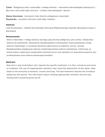 Tytuł: Pielęgnacja skóry noworodka i małego dziecka – stanowisko dermatologów dziecięcych. / New born and small baby skincare – children dermatologists’ opinion. Słowa kluczowe: kosmetyki małe dziecko pielęgnacja noworodek Keywords: cosmetics skincare small baby newborn Autorzy: Lidia Ruszkowska - Oddział Dermatologii Dziecięcej Międzyleskiego Szpitala Specjalistycznego w Warszawie Streszczenie: Skóra noworodka i małego dziecka wymaga specyficznej pielęgnacji. Jest cienka, niedojrzała i skłonna do podrażnień. Stosowanie nieodpowiednich kosmetyków może powodować utratę płaszcza lipidowego, co skutkuje obniżoną odpornością na bakterie, wirusy i grzyby. Nieodpowiednia pielęgnacja zaburza niedojrzałą barierę skórno-naskórkową. Informacje na temat wyboru właściwych preparatów kosmetycznych oraz sposobu ich stosowania powinny być przekazywane przez lekarza pierwszego kontaktu. Abstract: New born’s and small baby’s skin requires the specific treatment. It is thin, immature and prone to irritations. The use of inappropriate cosmetics may cause the dysfunction of skin lipids, what leads to low immunity to bacteria, viruses and fungi. The bad treatment disturbs the immature epidermal skin barrier. The information about choosing appropriate cosmetics and the way ofusing them should be given by GP.