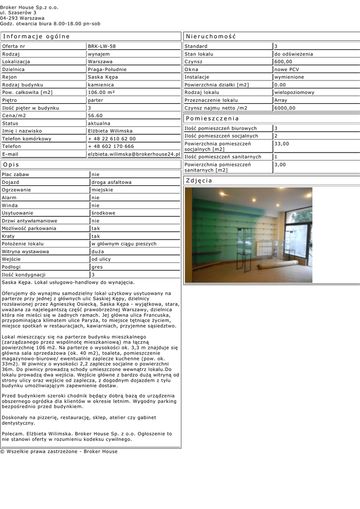 Broker House Sp.z o.o. ul. Szaserów 3 04-293 Warszawa Godz. otwarcia biura 8.00-18.00 pn-sob Informacje ogólne Nieruchomość Oferta nr BRK-LW-58 Standard 3 Rodzaj wynajem Stan lokalu do odświeżenia Lokalizacja Warszawa Czynsz 600,00 Dzielnica Praga-Południe Okna nowe PCV Rejon Saska Kępa Instalacje wymienione Rodzaj budynku kamienica Powierzchnia działki [m2] 0.00 Pow. całkowita [m2] 106.00 m² Rodzaj lokalu wielopoziomowy Piętro parter Przeznaczenie lokalu Array Ilość pięter w budynku 3 Czynsz najmu netto /m2 6000,00 Cena/m2 56.60 Status aktualna Imię i nazwisko Elżbieta Wilimska Telefon komórkowy + 48 22 610 62 00 Telefon + 48 602 170 666 E-mail [email protected] Opis Plac zabaw nie Dojazd droga asfaltowa Ogrzewanie miejskie Alarm nie Winda nie Usytuowanie środkowe Drzwi antywłamaniowe nie Możliwość parkowania tak Kraty tak Położenie lokalu w głównym ciągu pieszych Witryna wystawowa duża Wejście od ulicy Podłogi gres Ilość kondygnacji 3 Saska Kępa. Lokal usługowo-handlowy do wynajęcia. Oferujemy do wynajmu samodzielny lokal użytkowy usytuowany na parterze przy jednej z głównych ulic Saskiej Kępy, dzielnicy rozsławionej przez Agnieszkę Osiecką. Saska Kępa - wyjątkowa, stara, uważana za najelegantszą część prawobrzeżnej Warszawy, dzielnica która nie mieści się w żadnych ramach. Jej główna ulica Francuska, przypominająca klimatem ulice Paryża, to miejsce tętniące życiem, miejsce spotkań w restauracjach, kawiarniach, przyjemne sąsiedztwo. Lokal mieszczący się na parterze budynku mieszkalnego (zarządzanego przez wspólnotę mieszkaniową) ma łączną powierzchnię 106 m2. Na parterze o wysokości ok. 3,3 m znajduje się główna sala sprzedażowa (ok. 40 m2), toaleta, pomieszczenie magazynowo-biurowe/ ewentualnie zaplecze kuchenne (pow. ok. 33m2). W piwnicy o wysokości 2,2 zaplecze socjalne o powierzchni 36m. Do piwnicy prowadzą schody umieszczone wewnątrz lokalu.Do lokalu prowadzą dwa wejścia. Wejście główne z bardzo dużą witryną od strony ulicy oraz wejście od zaplecza, z dogodnym dojazdem z tyłu budynku umożliwiającym zapewnienie dostaw. Przed budynkiem szeroki chodnik będący dobrą bazą do urządzenia obszernego ogródka dla klientów w okresie letnim. Wygodny parking bezpośrednio przed budynkiem. Doskonały na pizzerię, restaurację, sklep, atelier czy gabinet dentystyczny. Polecam. Elżbieta Wilimska. Broker House Sp. z o.o. Ogłoszenie to nie stanowi oferty w rozumieniu kodeksu cywilnego. © Wszelkie prawa zastrzeżone - Broker House Pomieszczenia Ilość pomieszczeń biurowych 3 Ilość pomieszczeń socjalnych 2 Powierzchnia pomieszczeń socjalnych [m2] 33,00 Ilość pomieszczeń sanitarnych 1 Powierzchnia pomieszczeń sanitarnych [m2] 3,00 Zdjęcia
