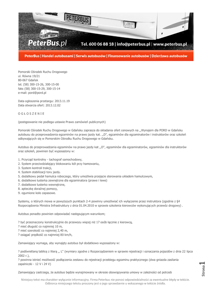 Pomorski Ośrodek Ruchu Drogowego ul. Równa 19/21 80-067 Gdańsk tel. (58) 300-15-26, 300-15-00 faks (58) 300-15-29, 300-15-14 e-mail: [email protected] Data ogłoszenia przetargu: 2013.11.19 Data otwarcia ofert: 2013.12.02 OGŁOSZENIE (postępowanie nie podlega ustawie Prawo zamówień publicznych) Pomorski Ośrodek Ruchu Drogowego w Gdańsku zaprasza do składania ofert cenowych na ,,Wynajem dla PORD w Gdańsku autobusu do przeprowadzenia egzaminów na prawo jazdy kat. ,,D", egzaminów dla egzaminatorów i instruktorów oraz szkoleń odbywających się w Pomorskim Ośrodku Ruchu Drogowego w Gdańsku. Autobus do przeprowadzania egzaminów na prawo jazdy kat ,,D", egzaminów dla egzaminatorów, egzaminów dla instruktorów oraz szkoleń, powinien być wyposażony w: 1. 2. 3. 4. 5. 6. 7. 8. 9. Przyrząd kontrolny - tachograf samochodowy, System przeciwdziałający blokowaniu kół przy hamowaniu, System kontroli trakcji, System stabilizacji toru jazdy. dodatkowy pedał hamulca roboczego, który umożliwia przejęcie sterowania układem hamulcowym, dodatkowe lusterka zewnętrzne dla egzaminatora (prawe i lewe) dodatkowe lusterko wewnętrzne, apteczkę doraźnej pomocy, ogumione koło zapasowe. Systemy, o których mowa w powyższych punktach 2-4 powinny umożliwiać ich wyłączenie przez instruktora (zgodnie z §4 Rozporządzenia Ministra Infrastruktury z dnia 01.04.2010 w sprawie szkolenia kierowców wykonujących przewóz drogowy) . Autobus ponadto powinien odpowiadać następującym warunkom; ? ? ? ? być przeznaczony konstrukcyjnie do przewozu więcej niż 17 osób łącznie z kierowcą, mieć długość co najmniej 10 m, mieć szerokość co najmniej 2,40 m, osiągać prędkość co najmniej 80 km/h, Zamawiający zastrzega, że autobus będzie wynajmowany w okresie obowiązywania umowy w zależności od potrzeb Niniejszy tekst ma charakter wyłącznie informacyjny. Firma Peterbus nie ponosi odpowiedzialności za ewentualne błędy w tekście. Odbiorca niniejszego tekstu proszony jest o jego sprawdzenie u wskazanego w tekście źródła. Strona ? podświetlaną tablicę z literą ,, L" (wymiary zgodne z Rozporządzeniem w sprawie rejestracji i oznaczania pojazdów z dnia 22 lipca 2002 r.), ? powinna istnieć możliwość podłączenia zestawu do rejestracji przebiegu egzaminu praktycznego (dwa gniazda zasilania zapalniczki - 12 V i 24 V) 1 Zamawiający wymaga, aby wynajęty autobus był dodatkowo wyposażony w: Zamawiającego po uprzednim uzgodnieniu z Wykonawcą. Termin realizacji zamówienia od 01.01.2014r. do dnia 31.12.2014r. Zamawiający dokona wyboru oferty najkorzystniejszej stosując następujące kryteria wyboru: 1. cena ryczałtowa za jedną egzaminowaną osobę - waga 90 % 2. cena ryczałtowa za jedną godzinę szkolenia - waga 10 % Jako cenę w ofercie Wykonawca powinien podać: ? Cenę ryczałtową brutto za jedną egzaminowaną osobę ? Cenę ryczałtową brutto za jedną godzinę szkolenia Cena ryczałtowa brutto za jedną egzaminowaną osobę oraz cena ryczałtowa brutto za jedną godzinę szkolenia podane przez Wykonawcę będą obowiązywały przez okres ważności umowy i nie będą podlegały zmianie. Cena ryczałtowa brutto za jedną egzaminowaną osobę oraz cena ryczałtowa brutto za jedną godzinę szkolenia podane przez Wykonawcę będą brane pod uwagę przez Komisję w trakcie wyboru najkorzystniejszej oferty. Cena ryczałtowa brutto za jedną egzaminowaną osobę oraz cena ryczałtowa brutto za jedną godzinę szkolenia winny obejmować wszystkie koszty dodatkowe, które Wykonawca poniesie w związku z realizacją niniejszego zamówienia (w tym np. wszelkie opłaty, koszty prac przygotowawczych, koszty związane z dostarczeniem zatankowanego autobusu, koszty dojazdu, koszty ubezpieczenia, a także wszelkie inne koszty bezpośrednie i pośrednie), które należy uwzględnić przy obliczaniu ceny ryczałtowej brutto za jedną osobę egzaminowaną oraz ceny ryczałtowej brutto za jedną godzinę szkolenia. Oferty należy złożyć w Pomorskim Ośrodku Ruchu Drogowego w Gdańsku przy ul. Równej 19/21, pok. 101, I piętro (budynek dwukondygnacyjny A) do dnia 02.12.2013 r. do godziny 12:00. Osobą upoważnioną do kontaktów z Wykonawcą jest : Pan Ryszard Jażdżewski, nr tel. 603 44 50 48 Strona 2 Wykonawca zobowiązany jest dołączyć do oferty oświadczenie , którego wzór stanowi załącznik nr 1 do ogłoszenia. OSWIADCZENIE Niniejszy tekst ma charakter wyłącznie informacyjny. Firma Peterbus nie ponosi odpowiedzialności za ewentualne błędy w tekście. Odbiorca niniejszego tekstu proszony jest o jego sprawdzenie u wskazanego w tekście źródła.