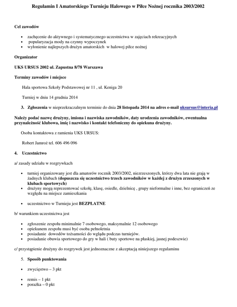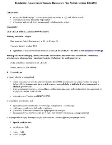 Regulamin I Amatorskiego Turnieju Halowego w Piłce Nożnej rocznika 2003/2002 Cel zawodów • • • zachęcenie do aktywnego i systematycznego uczestnictwa w zajęciach rekreacyjnych popularyzacja mody na czynny wypoczynek wyłonienie najlepszych drużyn amatorskich w halowej piłce nożnej Organizator UKS URSUS 2002 ul. Zapustna 8/78 Warszawa Terminy zawodów i miejsce Hala sportowa Szkoły Podstawowej nr 11 , ul. Keniga 20 Turniej w dniu 14 grudnia 2014 3. Zgłoszenia w nieprzekraczalnym terminie do dnia 28 listopada 2014 na adres e-mail [email protected] Należy podać nazwę drużyny, imiona i nazwiska zawodników, daty urodzenia zawodników, ewentualna przynależność klubowa, imię i nazwisko i kontakt telefoniczny do opiekuna drużyny. Osoba kontaktowa z ramienia UKS URSUS: Robert Jamroż tel. 606 496 096 4. Uczestnictwo a/ zasady udziału w rozgrywkach • • • turniej organizowany jest dla amatorów rocznik 2003/2002, niezrzeszonych, którzy dwa lata nie grają w żadnych klubach (dopuszcza się uczestnictwo trzech zawodników w każdej z drużyn zrzeszonych w klubach sportowych) drużyny mogą reprezentować szkołę, klasę, osiedle, dzielnicę , grupy nieformalne i inne, bez ograniczeń ze względu na miejsce zamieszkania uczestnictwo w Turnieju jest BEZPŁATNE b/ warunkiem uczestnictwa jest • • • • zgłoszenie zespołu minimalnie 7 osobowego, maksymalnie 12 osobowego opiekunem zespołu musi być osoba pełnoletnia posiadanie dowodów tożsamości do wglądu podczas turniejów. posiadanie obuwia sportowego do gry w hali ( buty sportowe na płaskiej, jasnej podeszwie) c/ przystąpienie drużyny do rozgrywek jest jednoznaczne z akceptacją niniejszego regulaminu 5. Sposób punktowania • zwycięstwo – 3 pkt • • remis – 1 pkt porażka – 0 pkt 6. Dyskwalifikacje • podejmuje organizator oraz sędzia prowadzący zawody na pisemny wniosek opiekuna drużyny biorącej udział w turnieju • • protesty przyjmowane są przez organizatora tylko podczas trwania turnieju w danym dniu przy składaniu wniosku wnioskodawca jest zobowiązany podać dane dotyczące zawodnika, co do którego wnosi się protest tj. imię , nazwisko, drużynę w której występował po zakończeniu turnieju wyniki nie podlegają weryfikacji • 7. Nagrody i wyróżnienia • za pierwsze miejsce drużyna otrzyma puchary, a wszystkie pozostałe dyplomy • prowadzony będzie ranking na najlepszego strzelca i bramkarza 8. Postanowienia końcowe • obowiązuje obuwie sportowe na białej lub kauczukowej podeszwie • organizator zapewnia opiekę medyczną podczas turnieju, ale nie ubezpiecza zawodników ueczestniczących w rozgrywkach organizator nie odpowiada za rzeczy osobiste i inne pozostawione na obiekcie sportowym rozstrzyganie spraw spornych oraz interpretacja niniejszego regulaminu należy do organizatora • • Skrócone przepisy gry 1. Zasady ogólne • czas gry wynosi 12 MINUT., bez przerwy, bez zmiany stron; czas odmierza zegar boiskowy, który kończy grę syreną • • • mierzący czas zatrzymuje zegar w trakcje meczu na wyraźne wskazanie przez sędziego głównego gra odbywa się na boisku wyznaczonym w hali bramka ma wymiary 3 x 2 m 2. Zawodnicy: • • • drużyna liczy z rezerwowymi min. 7 zawodników max. 12 zawodników w turnieju w grze bezpośrednio bierze udział 5 zawodników w tym bramkarz, ilość zmian w trakcie meczu dowolna, zmiany tzw. hokejowe w wyznaczonej od strony trybun od strony własnej ławki rezerwowych – kara: strata piłki a. Rzuty: • • • • • • • • • bramka jest uznana gdy piłka całym obwodem przejdzie za linię bramkową, rzut karny wykonuje się z linii 7 m., auty boczne wykonuje się nogą z linii boiska, aut bramkowy bramkarz wybija nogą w obrębie własnej połowy, za dotknięcie piłką konstrukcji dachu przyznaje się rzut wolny pośredni z połowy boiska, bramkę można zdobyć bezpośrednio z rzutu wolnego bezpośredniego, rozpoczęcia gry, rzutu rożnego lub dowolnego strzału samobójczego, nie uznaje się bramki zdobytej bezpośrednio z autu bocznego i bramkowego oraz rzutu pośredniego sygnalizowanego przez sędziego przez podniesienie ręki, na wykonanie wszystkich tzw. stałych fragmentów gry drużyna ma 4 sekundy przy prawidłowym ustawieniu rywali. Po przekroczeniu czasu piłkę przejmuje drużyna przeciwna, odległość obrońcy od piłki podczas wykonywania rzutów i autów wynosi minimum 3 m (kara ostrzeżenia, a następnie żółta kartka) b. Gra niedozwolona: • jak w przepisach PZPN i dodatkowo zakaz stosowania tzw. wślizgów oraz ostrej walki "bark w bark". c. Kary: • • • • za niesportowe zachowanie lub przewinienie sędzia każe zawodników jedno minutową lub dwu minutową karą przy ukaraniu drużyny karą 2 minut, po stracie bramki w tym czasie przez tą drużynę, zawodnik wykluczony wraca do gry, wyjątek - nie liczy się jako bramka zdobyta sytuacji gdy faul ukarany jest rzutem karnym, dopiero następna bramka upoważnia do powrotu na boisko za zachowania brutalne i obraźliwe następuje dyskwalifikacja zawodnika i po upływie 2 minut w miejsce ukaranego może wejść rezerwowy zawodnik (nie po stracie bramki). Ukarany zawodnik dyskwalifikacją nie ma prawa brać udziału w meczach już do końca danego turnieju, oraz zasiadać na ławce rezerwowych. d. Rozstrzygnięcia końcowe: • przy rozgrywkach grupowych mecz może kończyć się remisem i drużyny otrzymują po 1 punkcie, • • przy systemie pucharowym przy remisie wykonuje się 3 rzuty karne a następnie po 1 strzale do wyłonienia zwycięzcy, przy wygranym meczu drużyna otrzymuje 3 pkt., a przy przegranym 0 pkt., - przy walkowerze przyznaje się wynik 3:0 dla drużyny, która stawiła się na mecz, w rozgrywkach grupowych przy równej ilości punktów zdobytej przez dwie lub więcej drużyn bierze się pod uwagę: 1 2 3 bezpośredni pojedynek, różnice bramek ilość bramek zdobytych Przy ilości drużyn 3 lub wi