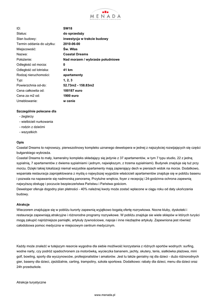 ID: SW18 Status: do sprzedaży Stan budowy: inwestycja w trakcie budowy Termin oddania do użytku: 2010-06-00 Miejscowość: Św. Włas Nazwa: Coastal Dreams Położenie: Nad morzem / wybrzeże południowe Odległość od morza: 0 Odległość od lotniska: 41 km Rodzaj nieruchomości: apartamenty Typ: 1, 2, 3 Powierzchnia od-do: 52.73m2 - 158.83m2 Cena całkowita od: 100187 euro Cena za m2 od: 1900 euro Umeblowanie: w cenie Szczególnie polecane dla - żeglarzy - wielbicieli nurkowania - rodzin z dziećmi - wszystkich Opis Coastal Dreams to najnowszy, pierwszolinowy kompleks uznanego dewelopera w jednej z najszybciej rozwijających się części bułgarskiego wybrzeża. Coastal Dreams to mały, kameralny kompleks składający się jedynie z 37 apartamentów, w tym 7 typu studio, 22 z jedną sypialnią, 7 apartamentów z dwiema sypialniami i jednym, największym, z trzema sypialniami). Budynek znajduje się tuż przy morzu. Dzięki takiej lokalizacji niemal wszystkie apartamenty mają zapierający dech w piersiach widok na morze. Dodatkowo, wspaniała restauracja zaprojektowana z myślą o najwyższej wygodzie właścicieli apartamentów znajduje się w pobliżu basenu i pozwala na napawanie się nadmorską panoramą. Przytulne wnętrza, foyer z recepcją i 24-godzinna ochrona zapewnią najwyższą obsługę i poczucie bezpieczeństwa Państwu i Państwa gościom. Deweloper oferuje dogodny plan płatności - 40% należnej kwoty może zostać wpłacone w ciągu roku od daty ukończenia budowy. Atrakcje Wieczorem znajdujące się w pobliżu kurorty zapewnią wyjątkowo bogatą ofertę rozrywkowa. Nocne kluby, dyskoteki i restauracje zapewniają atrakcyjne i różnorodne programy rozrywkowe. W pobliżu znajduje sie wiele sklepów w których turyści mogą zakupić najróżniejsze pamiątki, artykuły żywnościowe, napoje i inne niezbędne artykuły. Zapewniona jest również całodobowa pomoc medyczna w miejscowym centrum medycznym. Każdy może znaleźć w tutejszym resorcie wygodna dla siebie możliwość korzystania z różnych sportów wodnych: surfing, wodne narty, czy podróż spadochronem za motorówką, wycieczka bananem, jachty, skutery, tenis, siatkówka plażowa, mini golf, bowling, sporty dla wyczynowców, profesjonalistów i amatorów. Jest tu także genialny raj dla dzieci - dużo różnorodnych gier, baseny dla dzieci, zjeżdżalnie, carting, trampoliny, szkoła sportowa. Dodatkowo: rabaty dla dzieci, menu dla dzieci oraz 24h przedszkole. Atrakcje turystyczne www.menada.pl Cechy Dlaczego warto? Wysokiej jakości materiały budowlane Komfortowe Kompleks apartamenty tuż przy morzu! Cechy: Basen Pool bar Restauracja Sklepy Recepcja Parking Całoroczna ochrona Usługi Roczna opłata za zarządzanie wynosi 10 euro/m2. Z nami nie musisz się martwić o utrzymanie domu w ciągu roku - Dla naszych Klientów zapewniamy utrzymanie nieruchomości, ochronę 24 h przez cały rok, oświetlenie, bezpieczeństwo elektryczne i wodne, naprawy, sprzątanie i czyszczenie części wspólnych, zieleni, czyszczenie apartamentu czy też płatności rachunków. Uzyskiwanie dodatkowych dochodów z ewentualnego wynajmu apartamentu - Zapewniamy bowiem organizację wynajmu apartamentu. Obsługa posprzedażowa www.menada.pl Zasady płatności Plan zapłaty: 1000 Euro depozytu 30% w ciągu miesiąca od daty podpisania umowy 30% w momencie oddania budynku do użytku ( czerwiec 2010) 40% w ciągu kolejnego roku (czerwiec 2011) Wszyscy właściciele będą mogli korzystać ze swojego apartamentu po wpłaceniu 60% wartości. Ceny zawierają pełny VAT. Koszty: Cena podana w cenniku jest ostateczna. Należy pamiętać, iż oprócz ceny za nieruchomość dochodzą koszty związane z opłatą notarialną i (jest to około od 3,5% do 4,0% wartości zakupu - w zależności od opcji, którą wybierze Inwestor). www.menada.pl