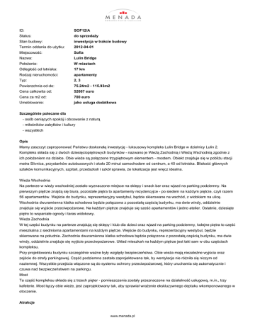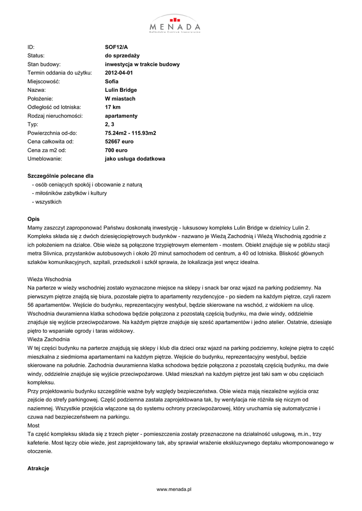 ID: SOF12/A Status: do sprzedaży Stan budowy: inwestycja w trakcie budowy Termin oddania do użytku: 2012-04-01 Miejscowość: Sofia Nazwa: Lulin Bridge Położenie: W miastach Odległość od lotniska: 17 km Rodzaj nieruchomości: apartamenty Typ: 2, 3 Powierzchnia od-do: 75.24m2 - 115.93m2 Cena całkowita od: 52667 euro Cena za m2 od: 700 euro Umeblowanie: jako usługa dodatkowa Szczególnie polecane dla - osób ceniących spokój i obcowanie z naturą - miłośników zabytków i kultury - wszystkich Opis Mamy zaszczyt zaproponować Państwu doskonałą inwestycję - luksusowy kompleks Lulin Bridge w dzielnicy Lulin 2. Kompleks składa się z dwóch dziesięciopiętrowych budynków - nazwano je Wieżą Zachodnią i Wieżą Wschodnią zgodnie z ich położeniem na działce. Obie wieże są połączone trzypiętrowym elementem - mostem. Obiekt znajduje się w pobliżu stacji metra Slivnica, przystanków autobusowych i około 20 minut samochodem od centrum, a 40 od lotniska. Bliskość głównych szlaków komunikacyjnych, szpitali, przedszkoli i szkół sprawia, że lokalizacja jest wręcz idealna. Wieża Wschodnia Na parterze w wieży wschodniej zostało wyznaczone miejsce na sklepy i snack bar oraz wjazd na parking podziemny. Na pierwszym piętrze znajdą się biura, pozostałe piętra to apartamenty rezydencyjce - po siedem na każdym piętrze, czyli razem 56 apartamentów. Wejście do budynku, reprezentacyjny westybul, będzie skierowane na wschód, z widokiem na ulicę. Wschodnia dwuramienna klatka schodowa będzie połączona z pozostałą częścią budynku, ma dwie windy, oddzielnie znajduje się wyjście przeciwpożarowe. Na każdym piętrze znajduje się sześć apartamentów i jedno atelier. Ostatnie, dziesiąte piętro to wspaniałe ogrody i taras widokowy. Wieża Zachodnia W tej części budynku na parterze znajdują się sklepy i klub dla dzieci oraz wjazd na parking podziemny, kolejne piętra to część mieszkalna z siedmioma apartamentami na każdym piętrze. Wejście do budynku, reprezentacyjny westybul, będzie skierowane na południe. Zachodnia dwuramienna klatka schodowa będzie połączona z pozostałą częścią budynku, ma dwie windy, oddzielnie znajduje się wyjście przeciwpożarowe. Układ mieszkań na każdym piętrze jest taki sam w obu częściach kompleksu. Przy projektowaniu budynku szczególnie ważne były względy bezpieczeństwa. Obie wieża mają niezależne wyjścia oraz zejście do strefy parkingowej. Część podziemna zastała zaprojektowana tak, by wentylacja nie różniła się niczym od naziemnej. Wszystkie przejścia włączone są do systemu ochrony przeciwpożarowej, który uruchamia się automatycznie i czuwa nad bezpieczeństwem na parkingu. Most Ta część kompleksu składa się z trzech pięter - pomieszczenia zostały przeznaczone na działalność usługową, m.in., trzy kafeterie. Most łączy obie wieże, jest zaprojektowany tak, aby sprawiał wrażenie ekskluzywnego deptaku wkomponowanego w otoczenie. Atrakcje www.menada.pl W ostatnim czasie Sofia stała się bardzo atrakcyjnym miejscem do życia i pracy. Mimo, że pod wieloma względami Sofia nie może konkurować z Pragą, jednakże w mieście jest wiele wspaniałych zabytków: Cerkiew rosyjska, Synagoga, galerie, muzea, cerkiew Aleksandra Newskiego (największa cerkiew na Bałkanach). Stolica z dnia na dzień staje się europejską stolicą z prawdziwego zdarzenia, centrum miasta pełne jest restauracji, kawiarni, sklepów. Szczególnie latem i wiosną roi się od kawiarni na świerzym powietrzu, w których można delektować się pyszną bułgarską kawą. Już 12 km od centrum miasta można wybrać się na wycieczkę w góry Witosza, a już godzinę drogi od Sofii znajduje się kurort Borovec. Atrakcje turystyczne Cechy Dlaczego warto? Przestronne Wygodna apartamenty lokalizacja Wysoka funkcjonalność Bardzo dobra inwestycja Cechy: 24-godzinna W ochrona pobliżu stacja metro i przystanek autobusowy Dostępne Tereny garaże podziemne zielone Supermarket i sklepy Windy www.menada.pl Klub dla dzieci System przeciwpożarowy Ogrody dla właścicieli Obiekt przyjazny dla osób niepełnosprawnych Usługi Z nami nie musisz się martwić o utrzymanie domu w ciągu roku - Dla naszych Klientów zapewniamy utrzymanie nieruchomości, ochronę 24 h przez cały rok, oświetlenie, bezpieczeństwo elektryczne i wodne, naprawy, sprzątanie i czyszczenie części wspólnych, zieleni, czyszczenie apartamentu czy też płatności rachunków. Uzyskiwanie dodatkowych dochodów z ewentualnego wynajmu apartamentu - Zapewniamy bowiem organizację wynajmu apartamentu. Obsługa posprzedażowa Zasady płatności Plan płatności 1: 30 %- w momencie podpisania umowy przedwstępnej 20 %- osiągnięcie poziomu elewacji (+ 0.00) 20 %- osiągnięcie poziomu pięter 20 %- budowa dachu 5 %- akt 15 5 %- oddanie do użytku Plan płatności 2: www.menada.pl 30 %- podpisanie umowy przedwstępnej 70 %- akt 14 Koszty: Cena podana w cenniku jest ostateczna. Należy pamiętać, iż oprócz ceny za nieruchomość dochodzą koszty związane z opłatą notarialną i (jest to około od 3,5% do 4,0% wartości zakupu - w zależności od opcji, którą wybierze Inwestor). Wyjątkowo dla tej nieruchomości pobieramy prowizję w wysokości 3% liczoną od wartości zakupionej nieruchomości. W ramach opłaty zapewniamy Państwu profesjonalną obsługę na każdym etapie transakcji. www.menada.pl