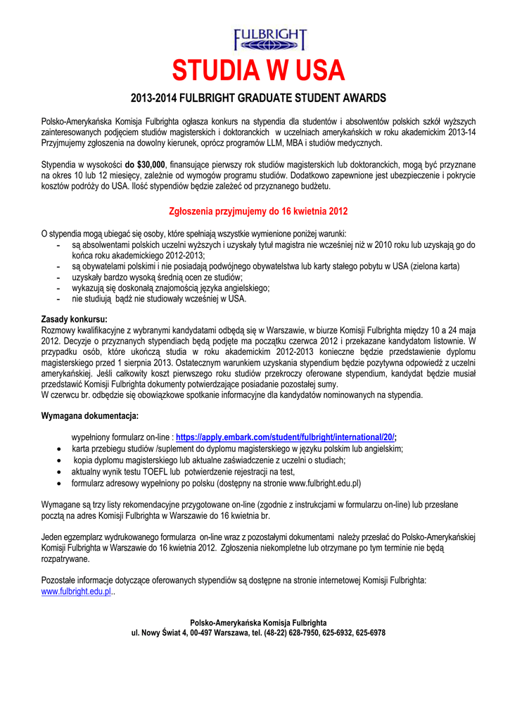 STUDIA W USA 2013-2014 FULBRIGHT GRADUATE STUDENT AWARDS Polsko-Amerykańska Komisja Fulbrighta ogłasza konkurs na stypendia dla studentów i absolwentów polskich szkół wyższych zainteresowanych podjęciem studiów magisterskich i doktoranckich w uczelniach amerykańskich w roku akademickim 2013-14 Przyjmujemy zgłoszenia na dowolny kierunek, oprócz programów LLM, MBA i studiów medycznych. Stypendia w wysokości do $30,000, finansujące pierwszy rok studiów magisterskich lub doktoranckich, mogą być przyznane na okres 10 lub 12 miesięcy, zależnie od wymogów programu studiów. Dodatkowo zapewnione jest ubezpieczenie i pokrycie kosztów podróży do USA. Ilość stypendiów będzie zależeć od przyznanego budżetu. Zgłoszenia przyjmujemy do 16 kwietnia 2012 O stypendia mogą ubiegać się osoby, które spełniają wszystkie wymienione poniżej warunki: - są absolwentami polskich uczelni wyższych i uzyskały tytuł magistra nie wcześniej niż w 2010 roku lub uzyskają go do końca roku akademickiego 2012-2013; - są obywatelami polskimi i nie posiadają podwójnego obywatelstwa lub karty stałego pobytu w USA (zielona karta) - uzyskały bardzo wysoką średnią ocen ze studiów; - wykazują się doskonałą znajomością języka angielskiego; - nie studiują bądź nie studiowały wcześniej w USA. Zasady konkursu: Rozmowy kwalifikacyjne z wybranymi kandydatami odbędą się w Warszawie, w biurze Komisji Fulbrighta między 10 a 24 maja 2012. Decyzje o przyznanych stypendiach będą podjęte ma początku czerwca 2012 i przekazane kandydatom listownie. W przypadku osób, które ukończą studia w roku akademickim 2012-2013 konieczne będzie przedstawienie dyplomu magisterskiego przed 1 sierpnia 2013. Ostatecznym warunkiem uzyskania stypendium będzie pozytywna odpowiedź z uczelni amerykańskiej. Jeśli całkowity koszt pierwszego roku studiów przekroczy oferowane stypendium, kandydat będzie musiał przedstawić Komisji Fulbrighta dokumenty potwierdzające posiadanie pozostałej sumy. W czerwcu br. odbędzie się obowiązkowe spotkanie informacyjne dla kandydatów nominowanych na stypendia. Wymagana dokumentacja: wypełniony formularz on-line : https://apply.embark.com/student/fulbright/international/20/; karta przebiegu studiów /suplement do dyplomu magisterskiego w języku polskim lub angielskim; kopia dyplomu magisterskiego lub aktualne zaświadczenie z uczelni o studiach; aktualny wynik testu TOEFL lub potwierdzenie rejestracji na test, formularz adresowy wypełniony po polsku (dostępny na stronie www.fulbright.edu.pl) Wymagane są trzy listy rekomendacyjne przygotowane on-line (zgodnie z instrukcjami w formularzu on-line) lub przesłane pocztą na adres Komisji Fulbrighta w Warszawie do 16 kwietnia br. Jeden egzemplarz wydrukowanego formularza on-line wraz z pozostałymi dokumentami należy przesłać do Polsko-Amerykańskiej Komisji Fulbrighta w Warszawie do 16 kwietnia 2012. Zgłoszenia niekompletne lub otrzymane po tym terminie nie będą rozpatrywane. Pozostałe informacje dotyczące oferowanych stypendiów są dostępne na stronie internetowej Komisji Fulbrighta: www.fulbright.edu.pl.. Polsko-Amerykańska Komisja Fulbrighta ul. Nowy Świat 4, 00-497 Warszawa, tel. (48-22) 628-7950, 625-6932, 625-6978